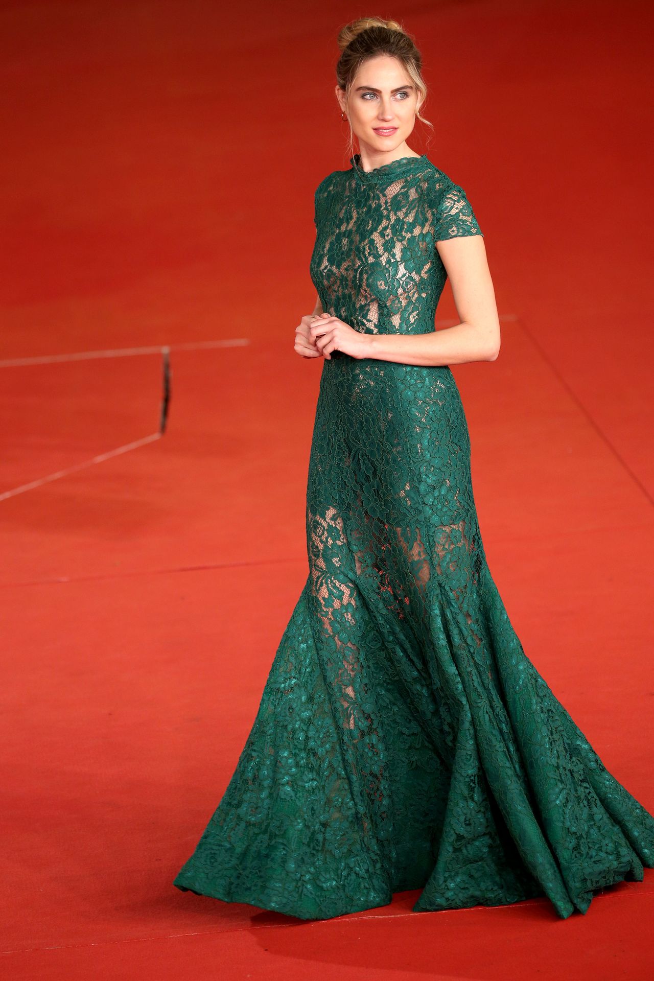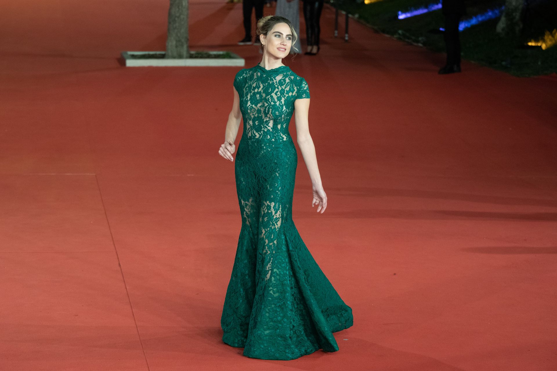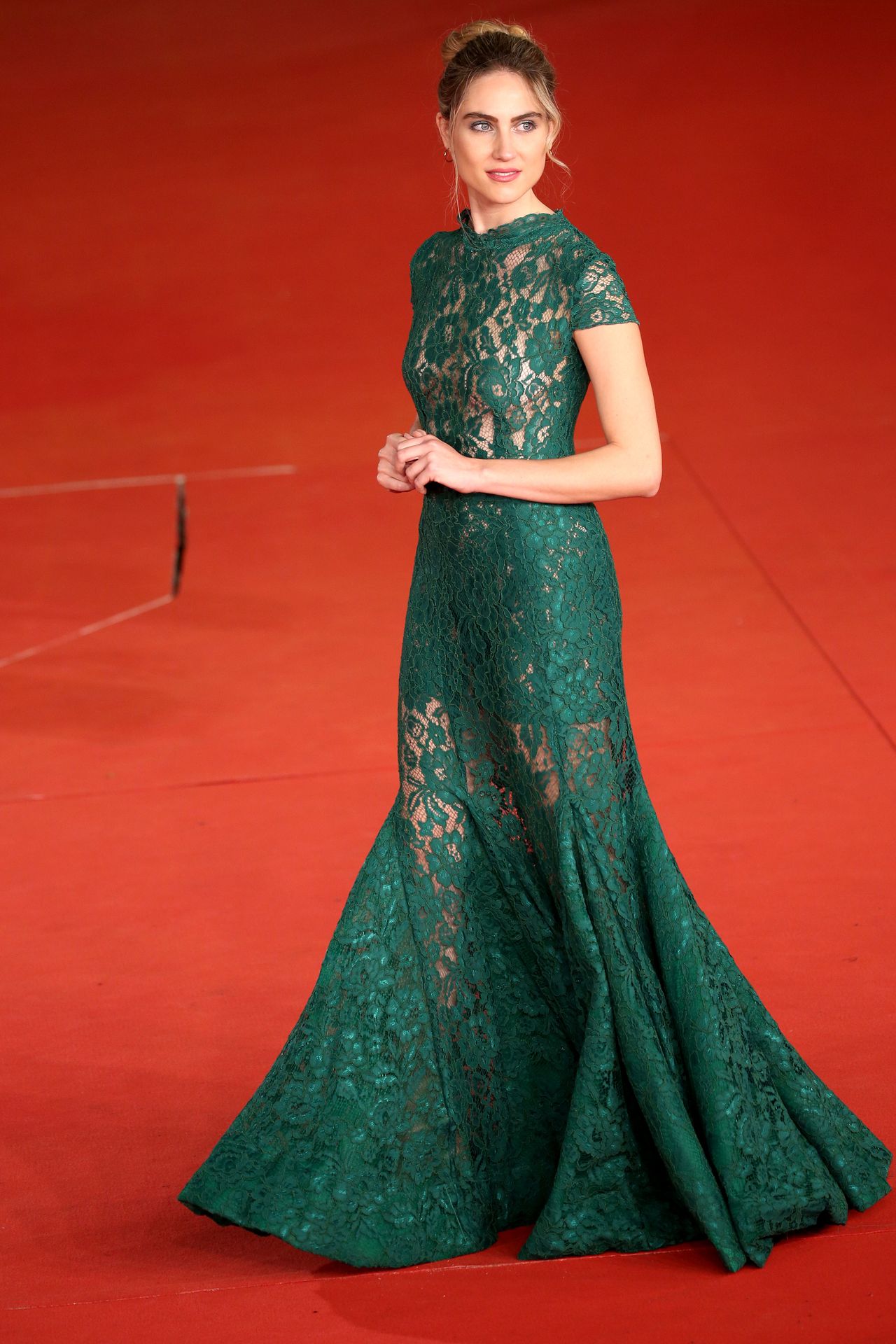 Miriam Galanti attends “The Irishman” premiere during the 14th Rome Film Festival on October 21, 2019 in Rome, Italy. The Italian actress was photographed on the red carpet in a see-through green dress without a bra.