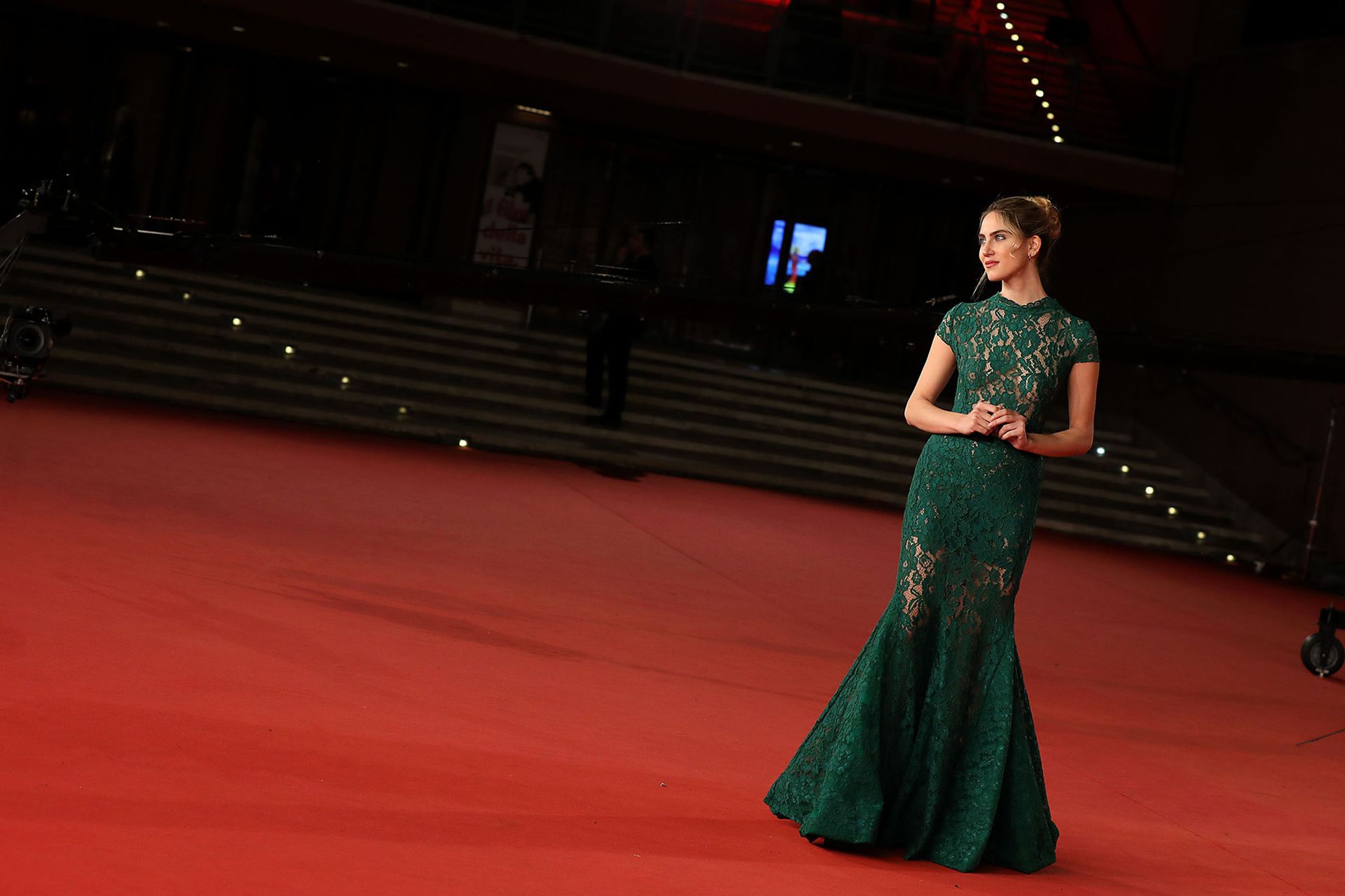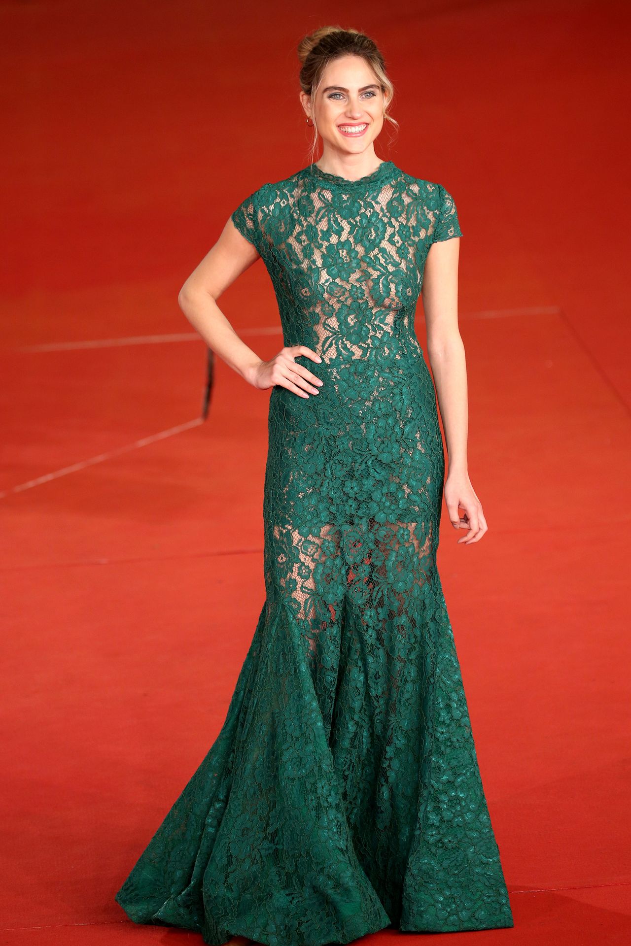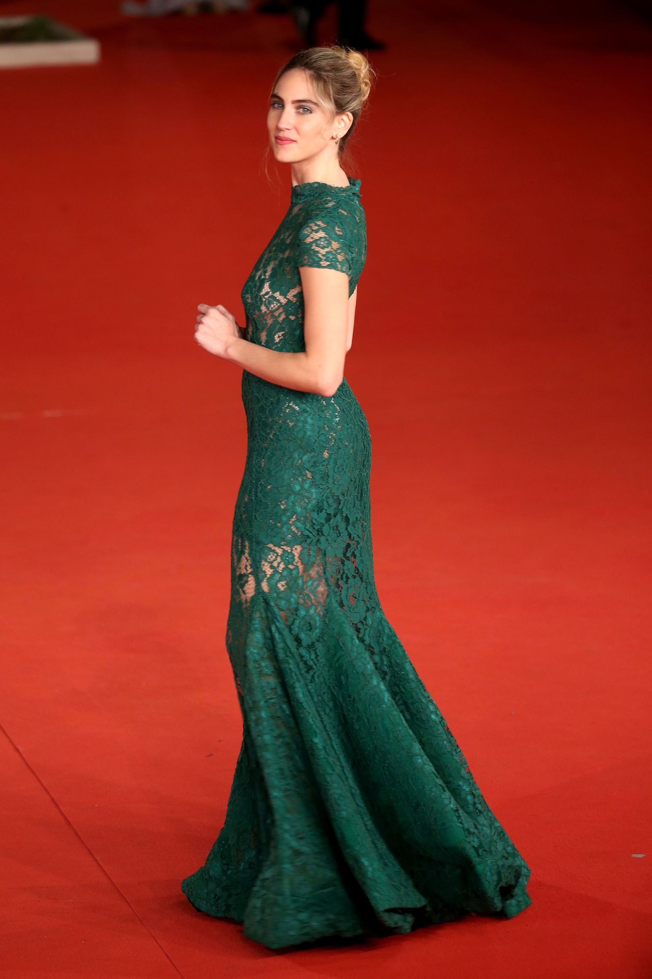Miriam Galanti attends “The Irishman” premiere during the 14th Rome Film Festival on October 21, 2019 in Rome, Italy. The Italian actress was photographed on the red carpet in a see-through green dress without a bra.