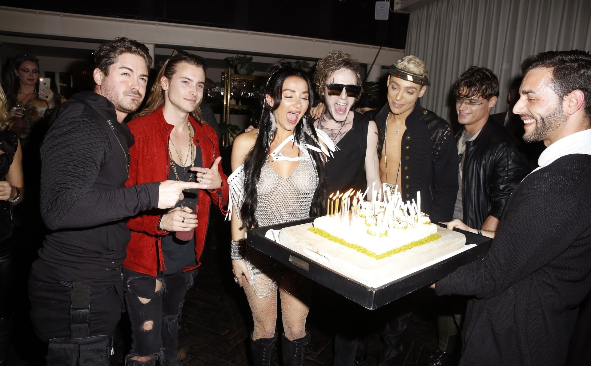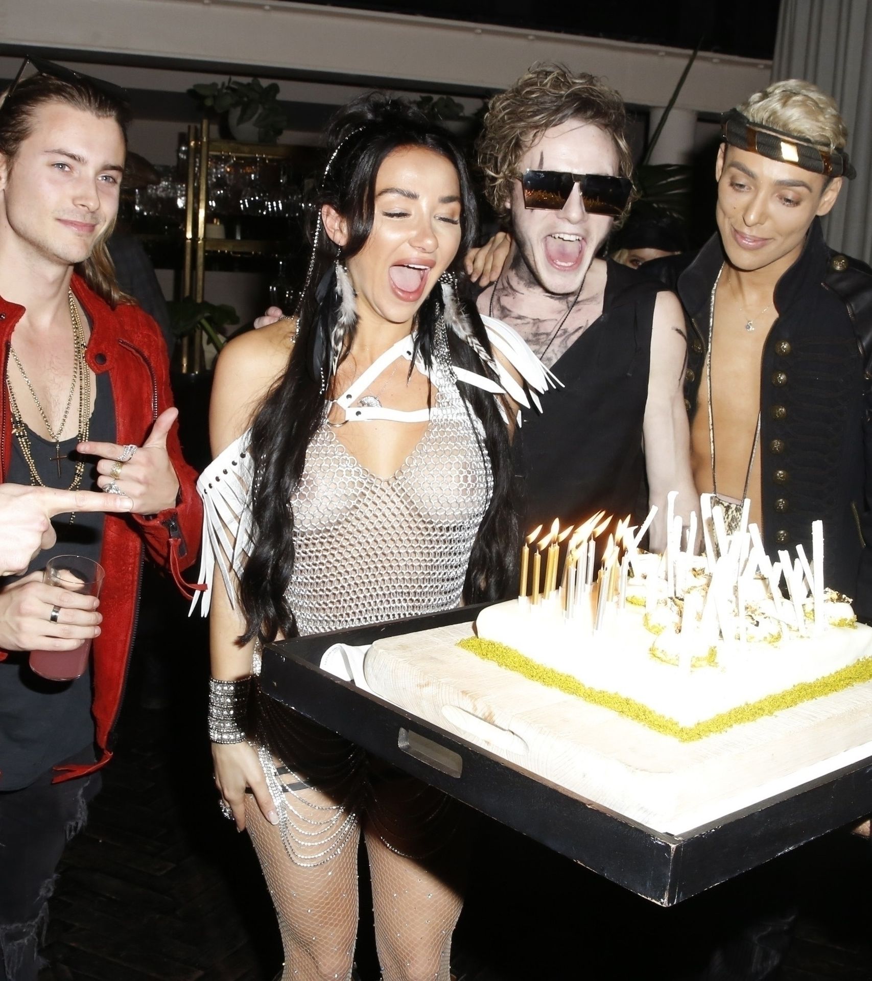 Natasha Grano is being carried aloft during her birthday party at The Mandrake Hotel in London, 01/08/2020. The social media star leaves nothing to the imagination as she parades in her sheer top.