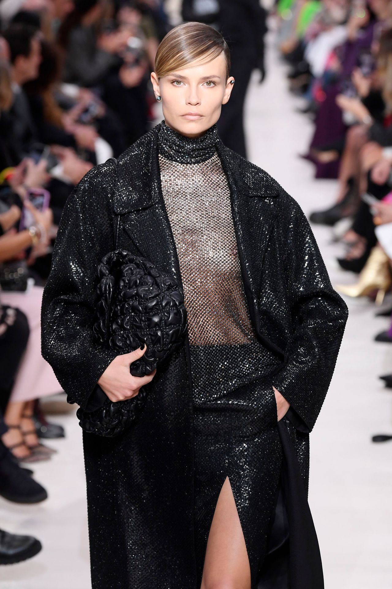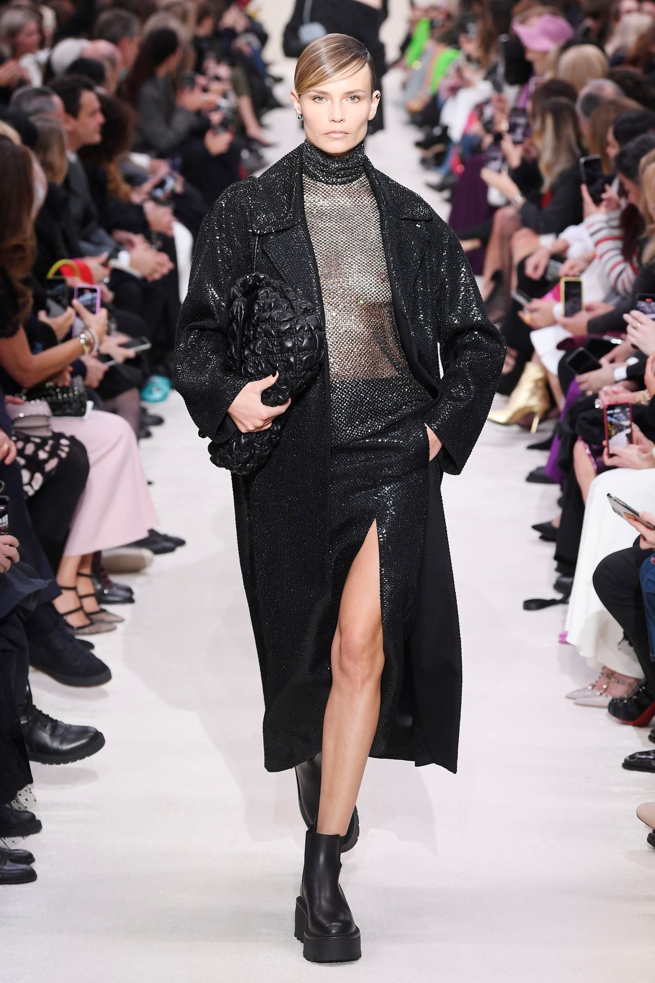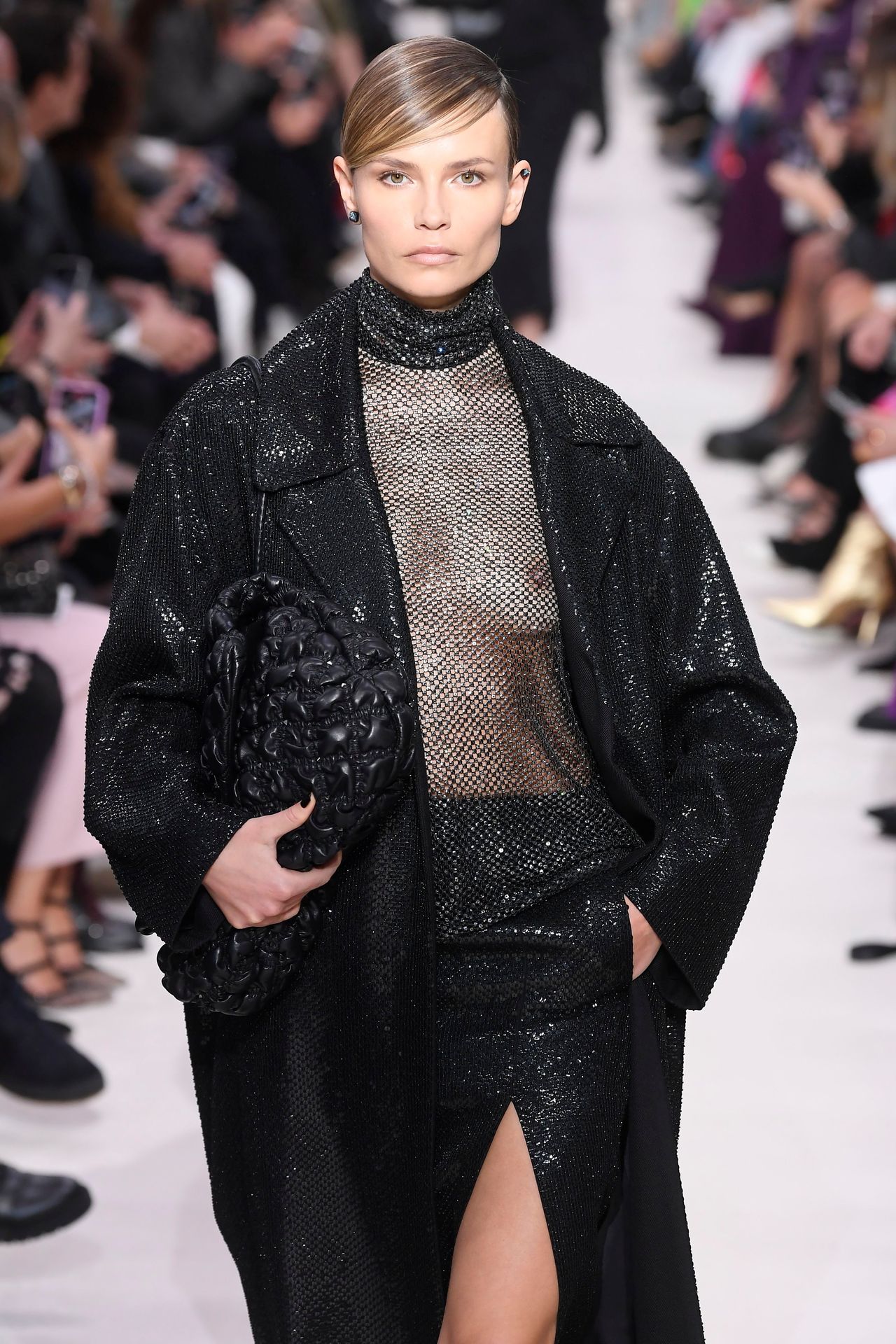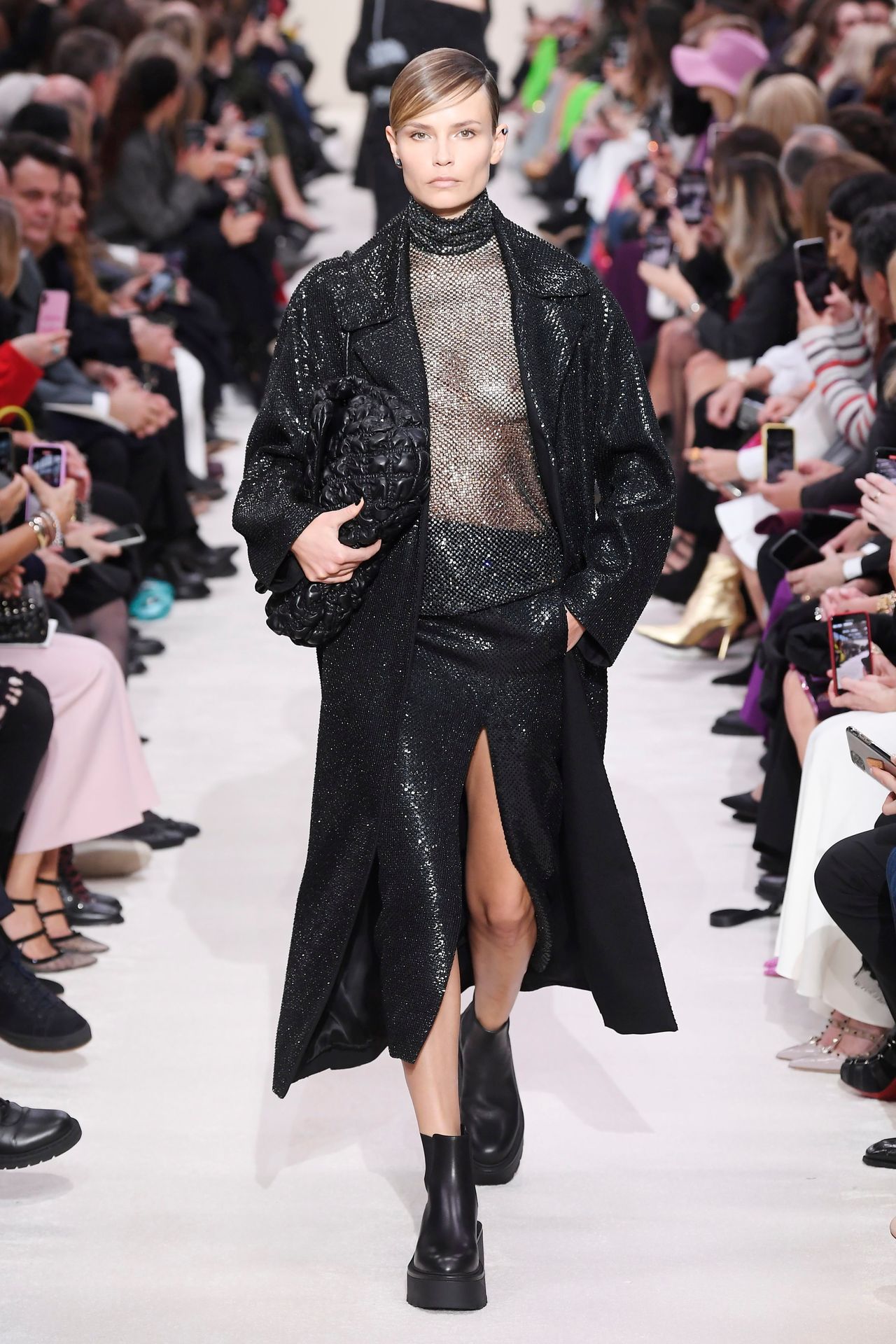 Model Natasha Poly wears a see-through top on the catwalk for Valentino Fall/Winter 2020 Fashion Show during Paris Fashion Week, 03/01/2020.