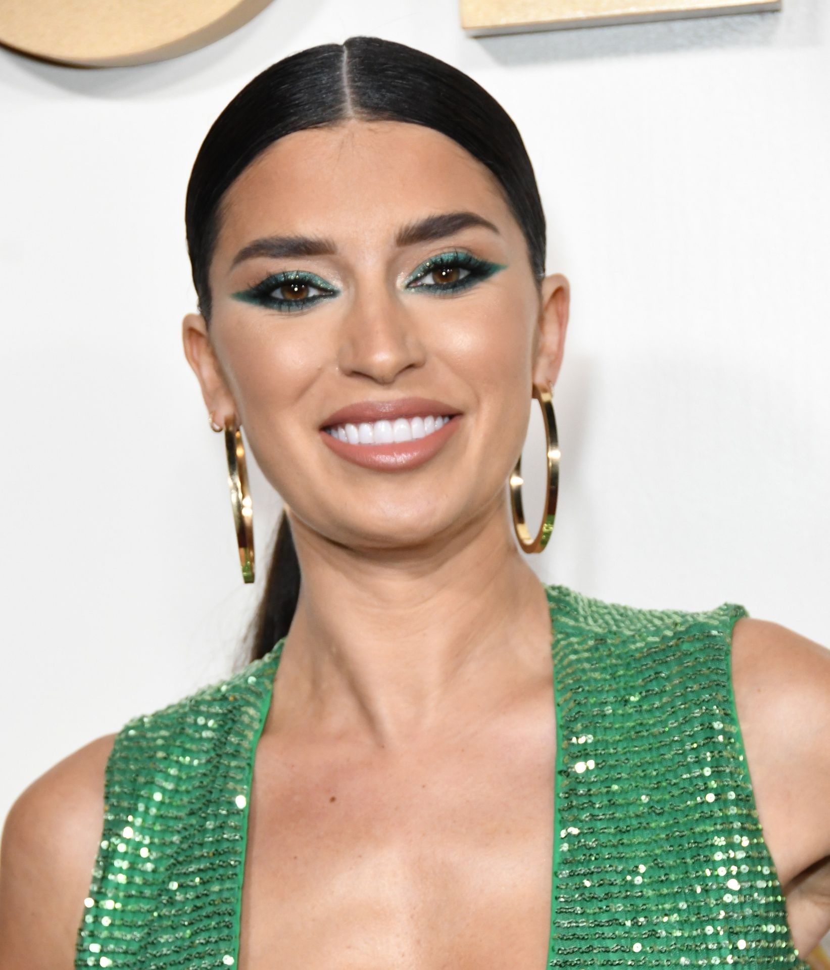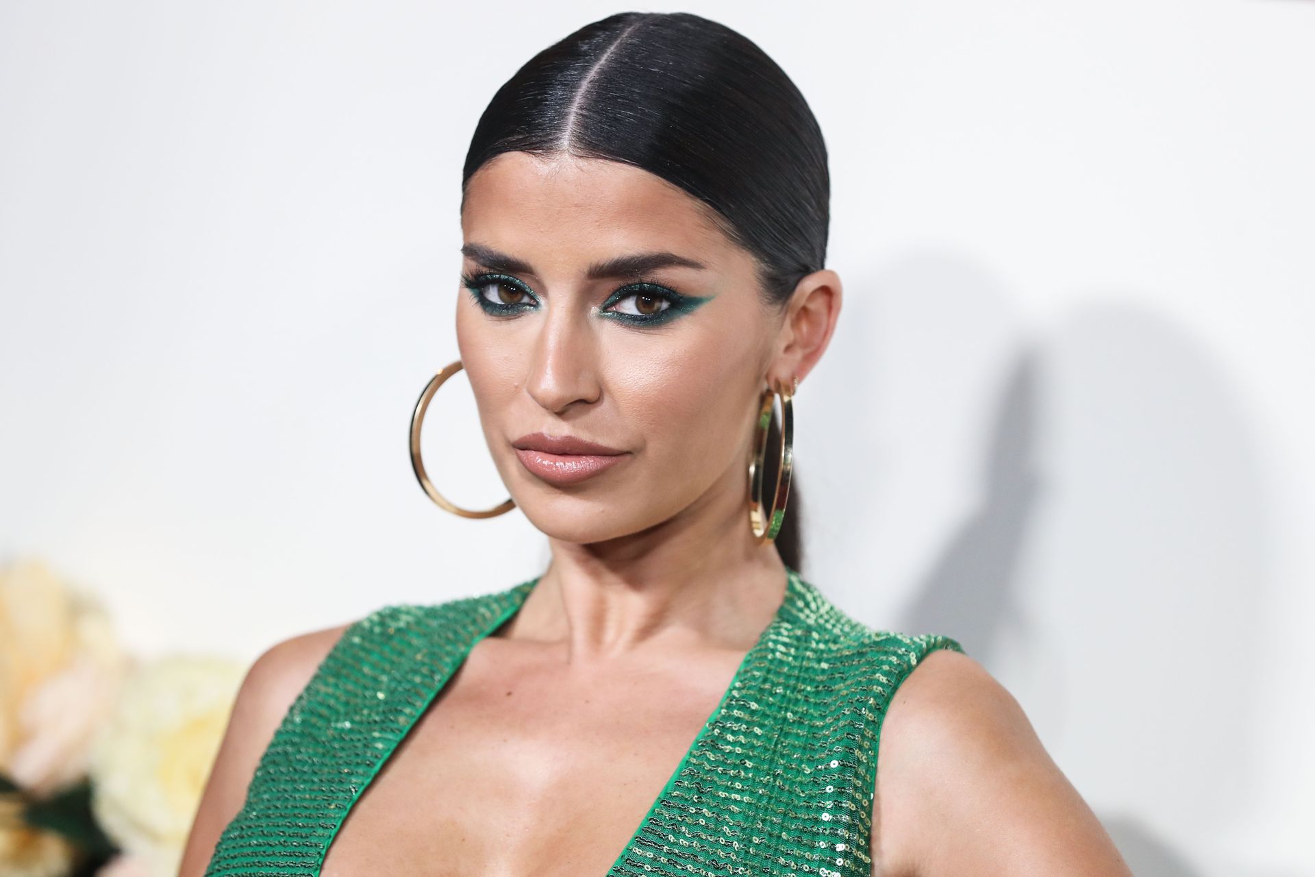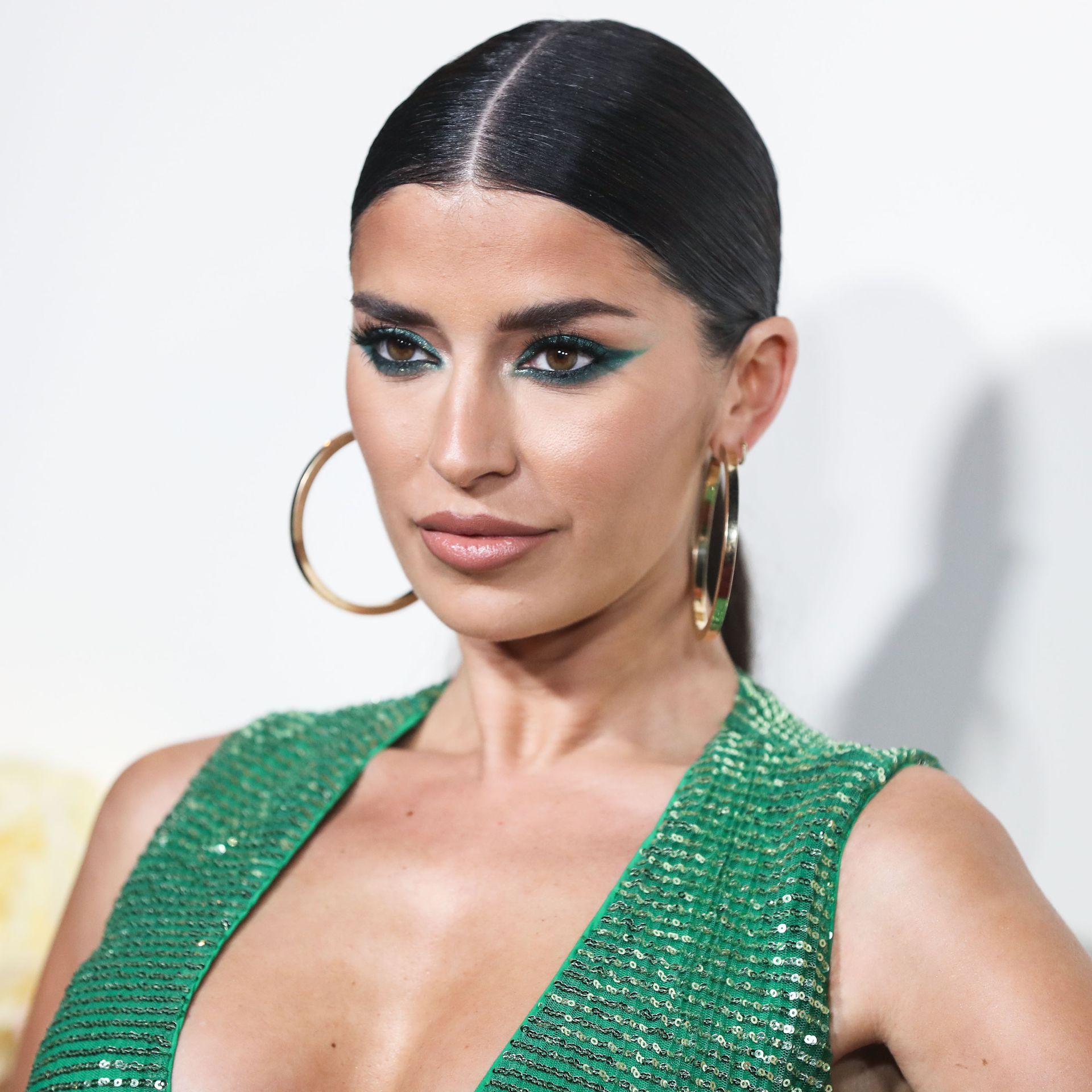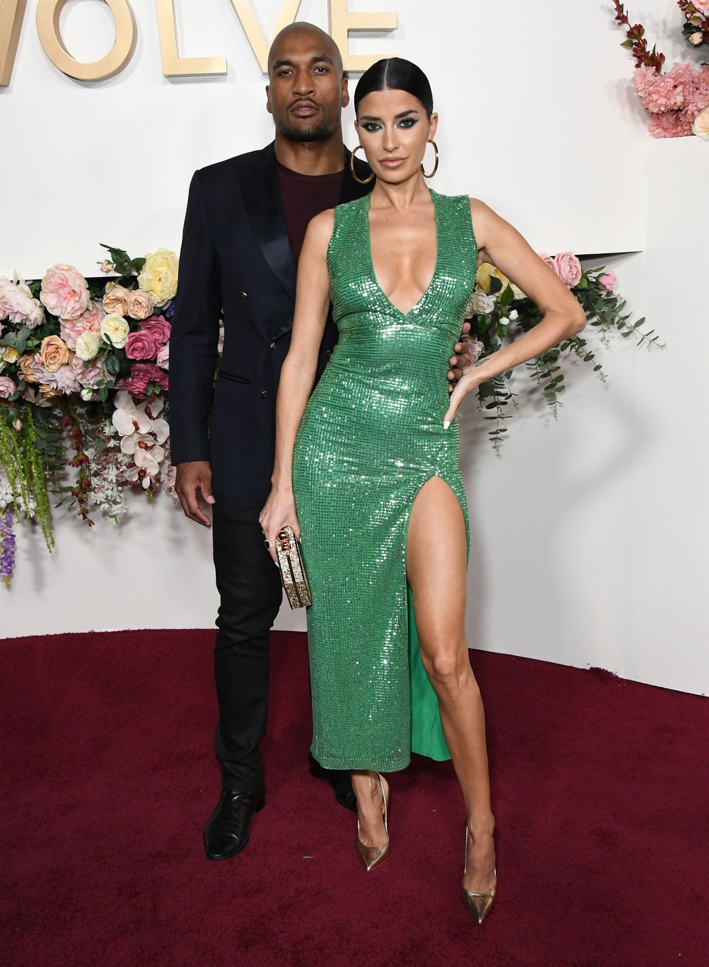 Television star Nicole Williams was photographed in a green dress with a deep cleavage at the 3rd Annual #REVOLVEawards held at Goya Studios in Hollywood, Los Angeles, California, 11/15/2019.