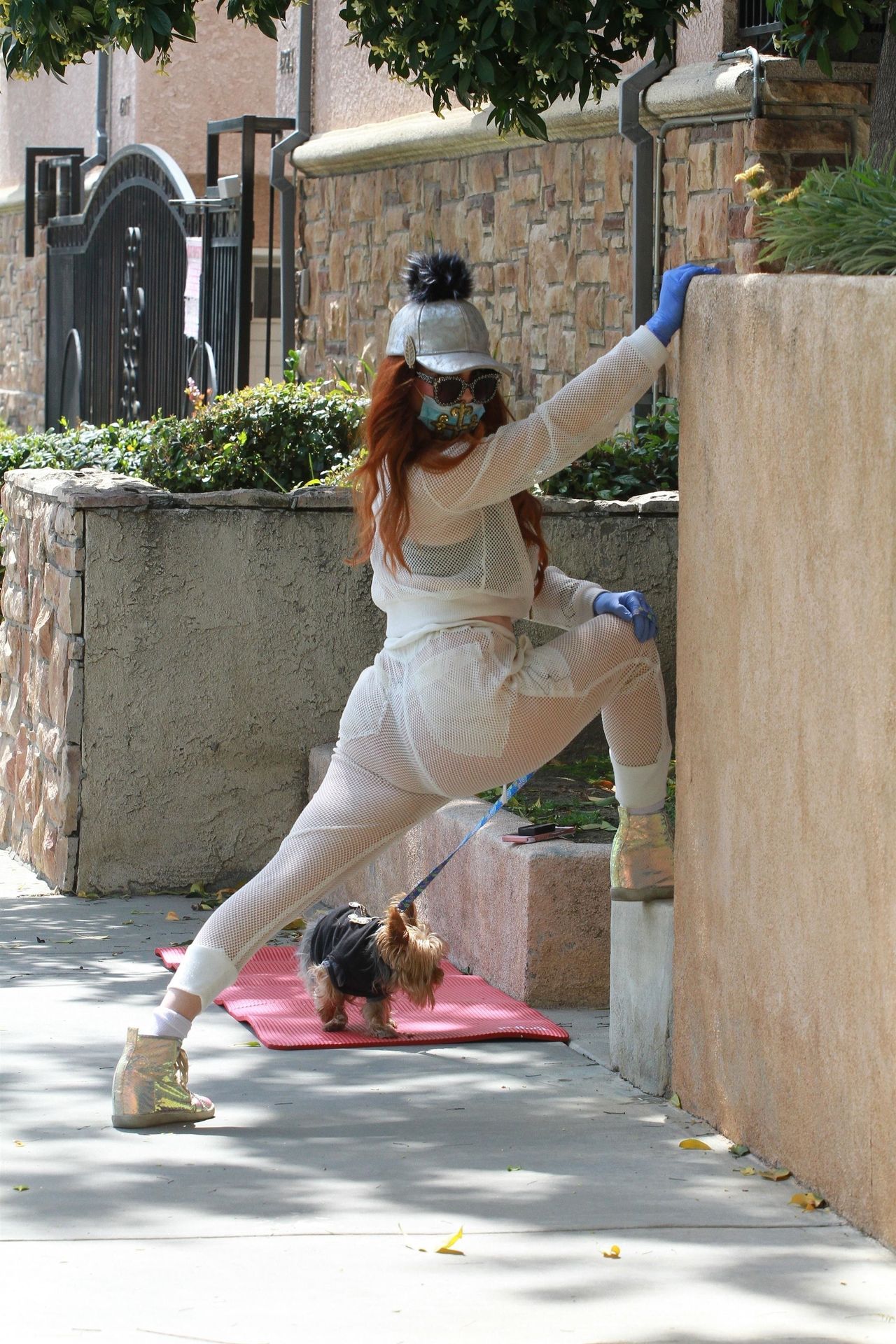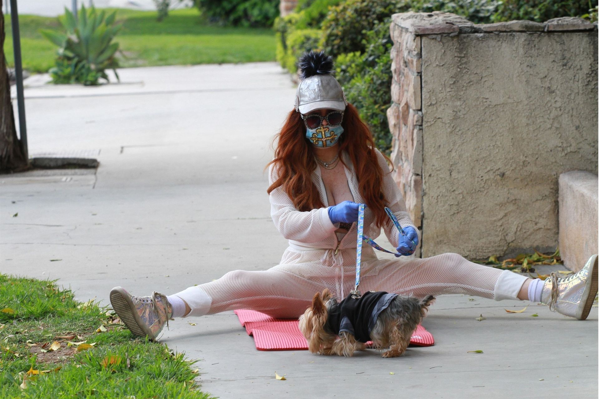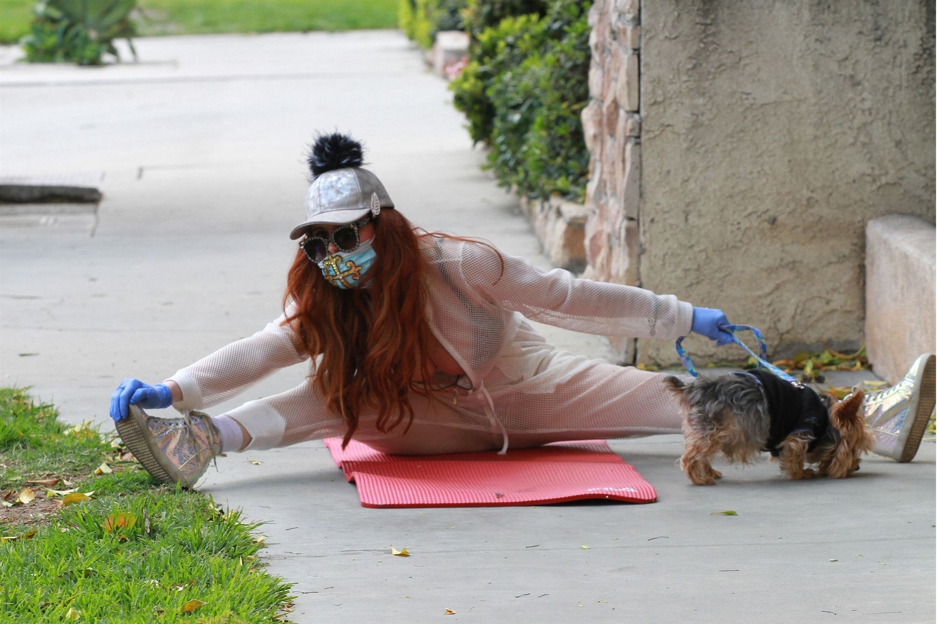 Phoebe Price was seen with her dog as she sets up her yoga mat outside on the sidewall for an afternoon workout in Studio City, 03/29/2020.
