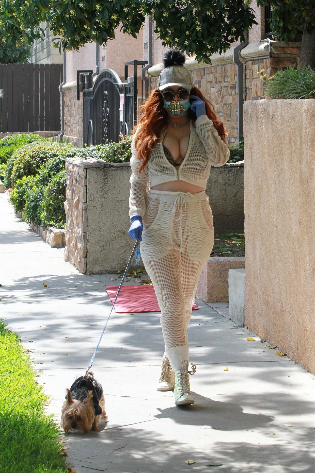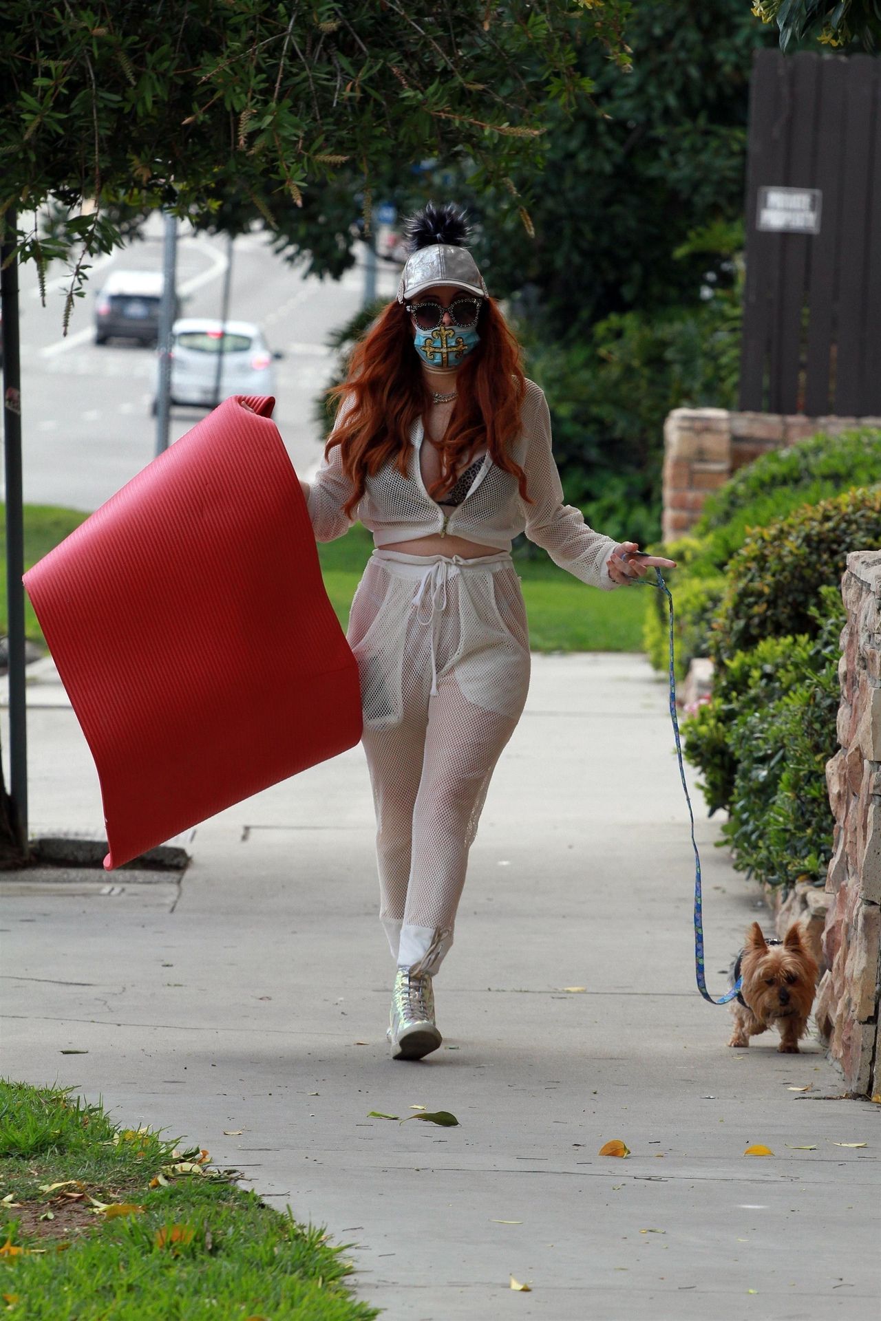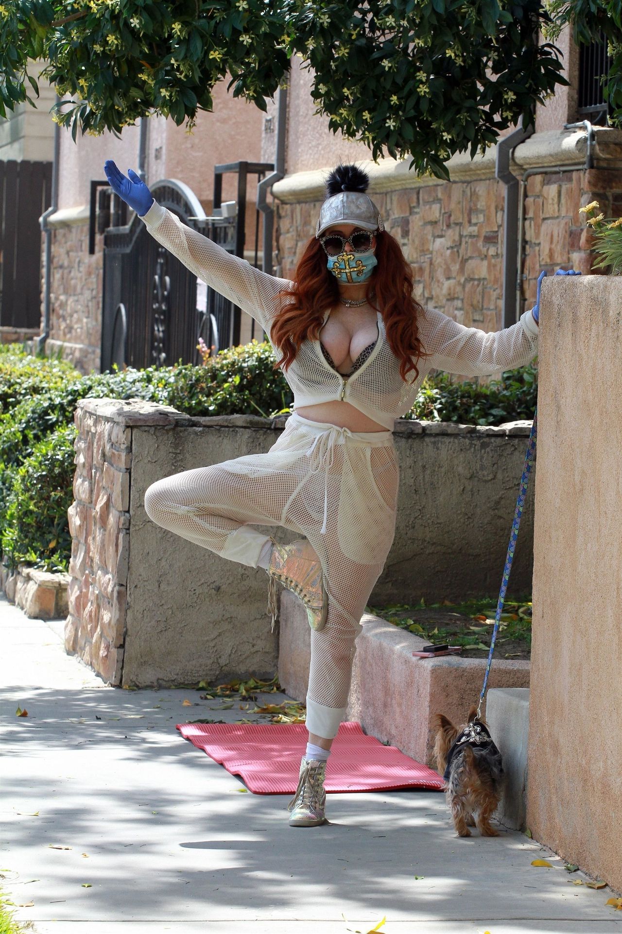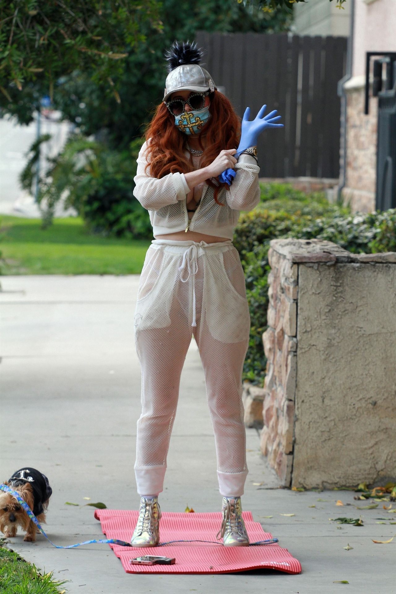Phoebe Price was seen with her dog as she sets up her yoga mat outside on the sidewall for an afternoon workout in Studio City, 03/29/2020.