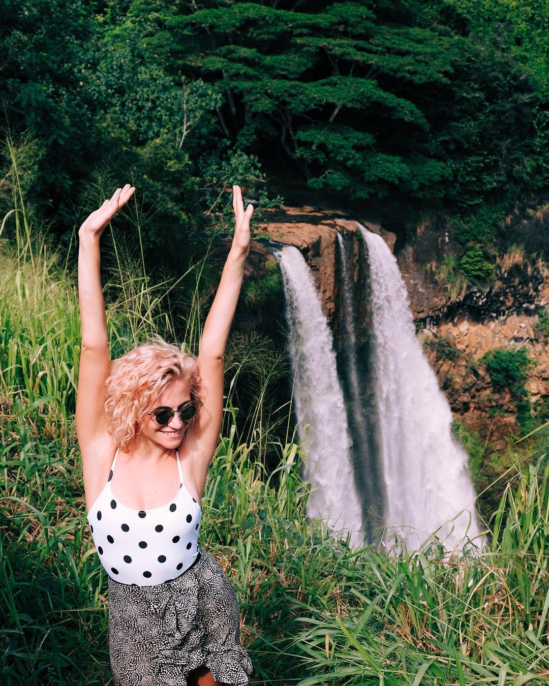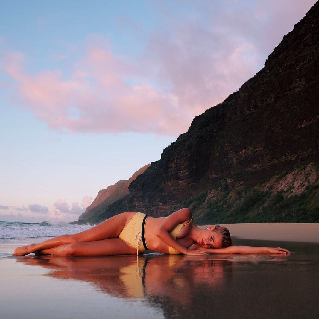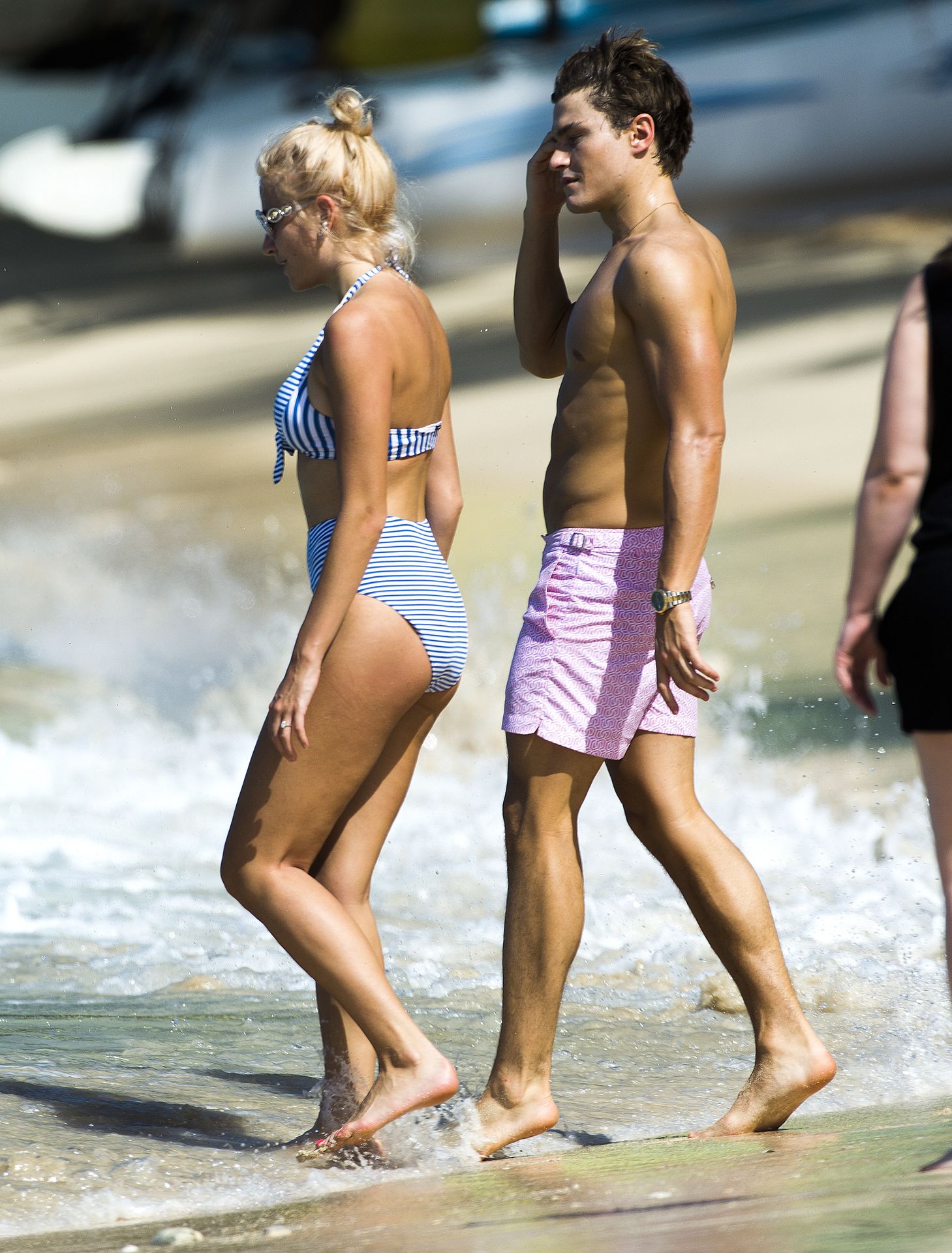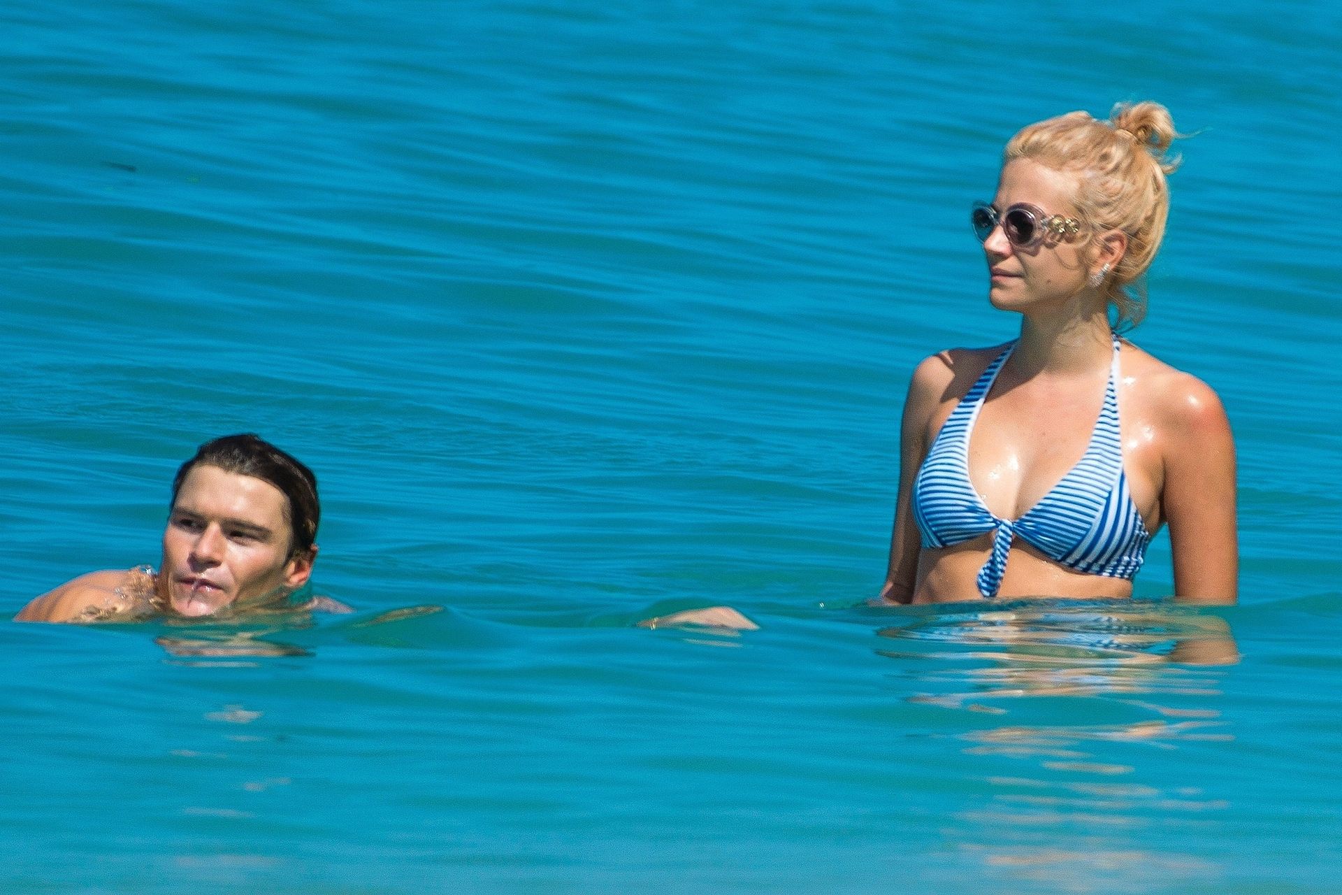 Singer Pixie Lott was spotted in a white and blue striped bikini with Oliver Cheshire on the beach in Kauai, Hawaii, 11/06/2018.