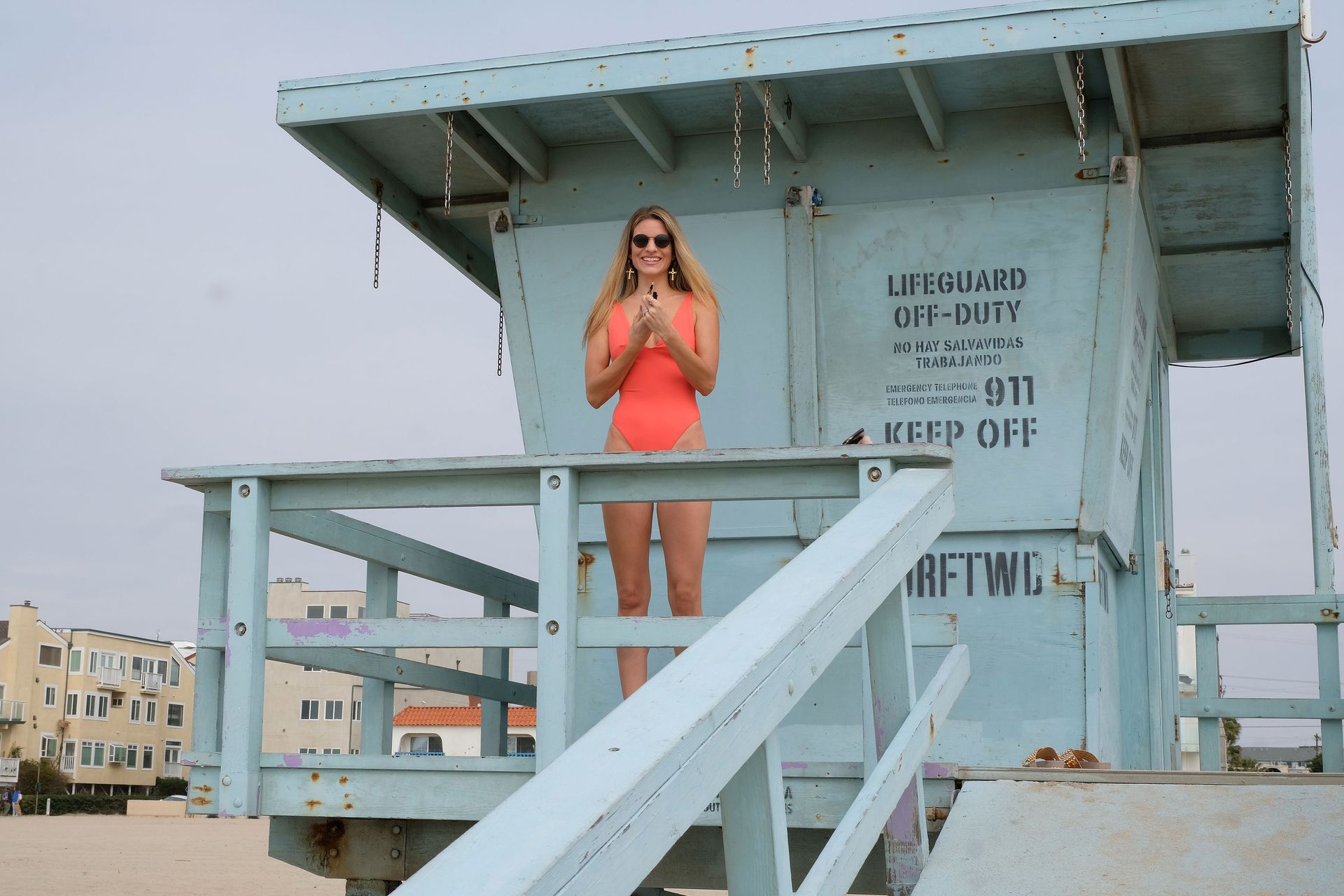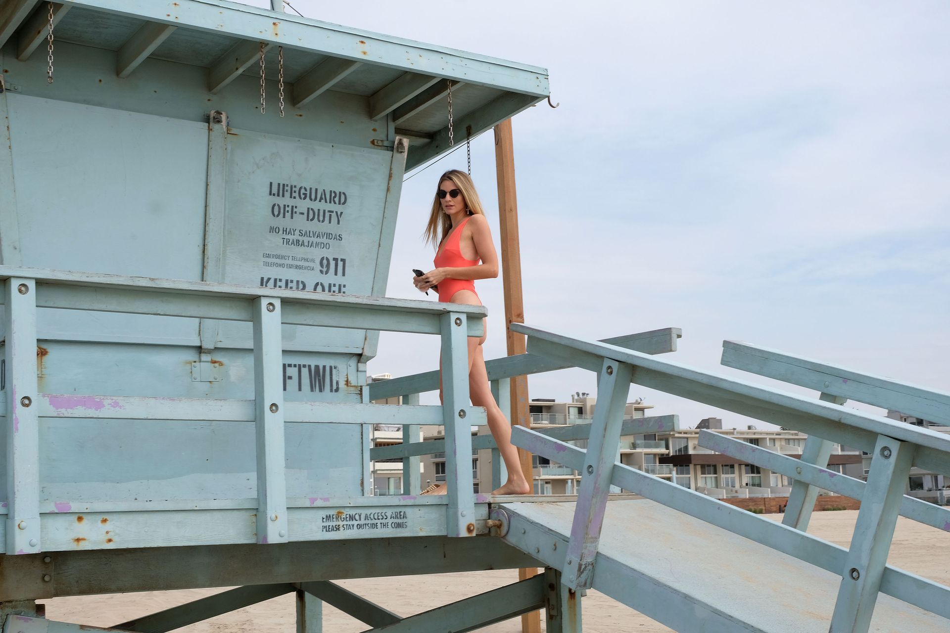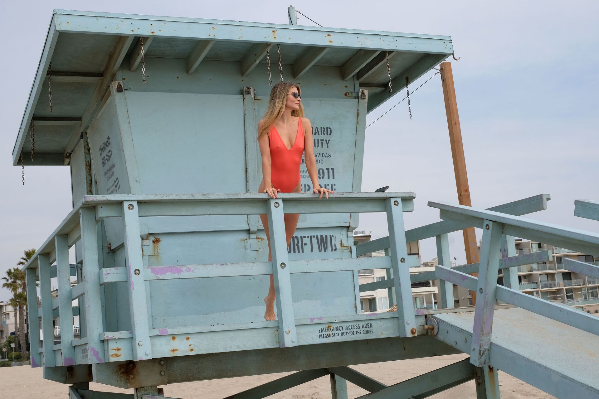 Rachel McCord was seen enjoying the morning at the beach in Venice, 07/20/2019. The 29-year-old influencer showed her slim body in a red one-piece swimsuit.