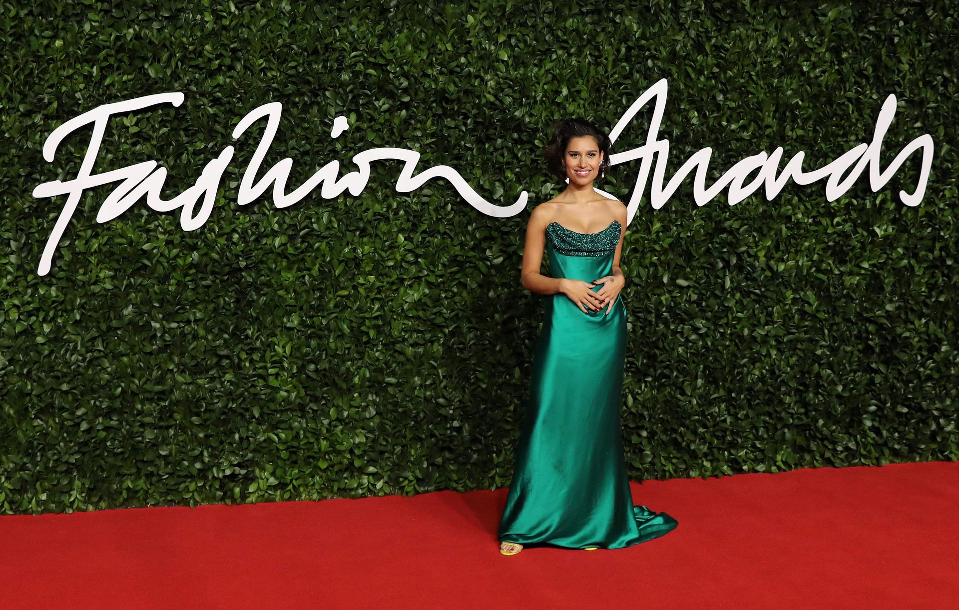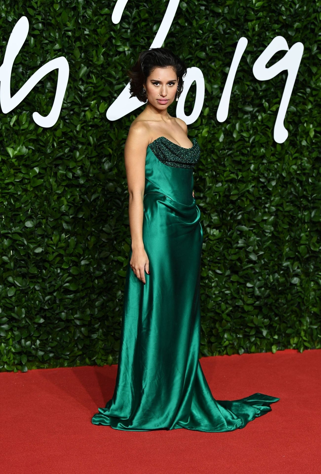 British singer/songwriter Rachel Agatha Keen (aka RAYE) poses on the red carpet in a green dress upon arrival at The Fashion Awards 2019 in London on December 2, 2019.