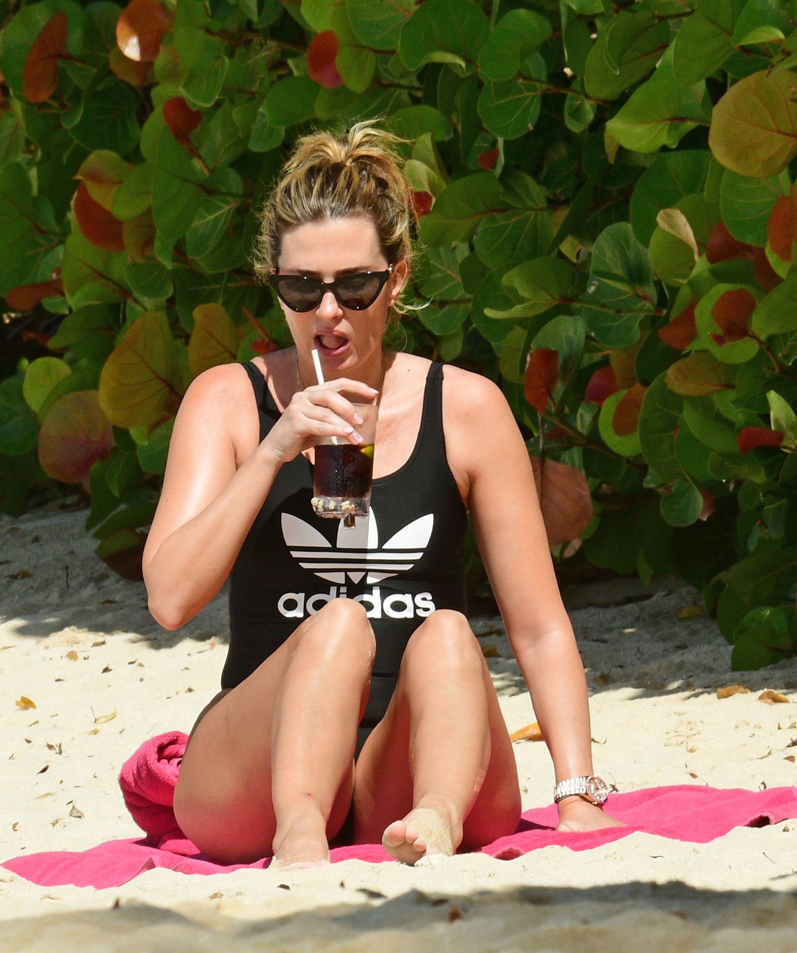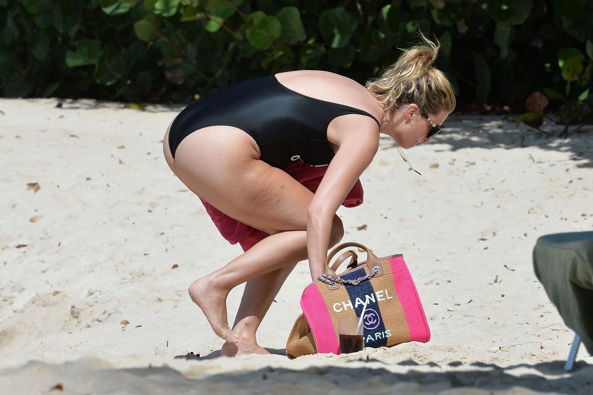 Wife of the American actor Mark Wahlberg, the 41-year-old fashion model Rhea Durham looks amazing showing off her sensational curves in her black swimsuit is pictured enjoying the winter holidays at the beach in Barbados, 12/30/2019.