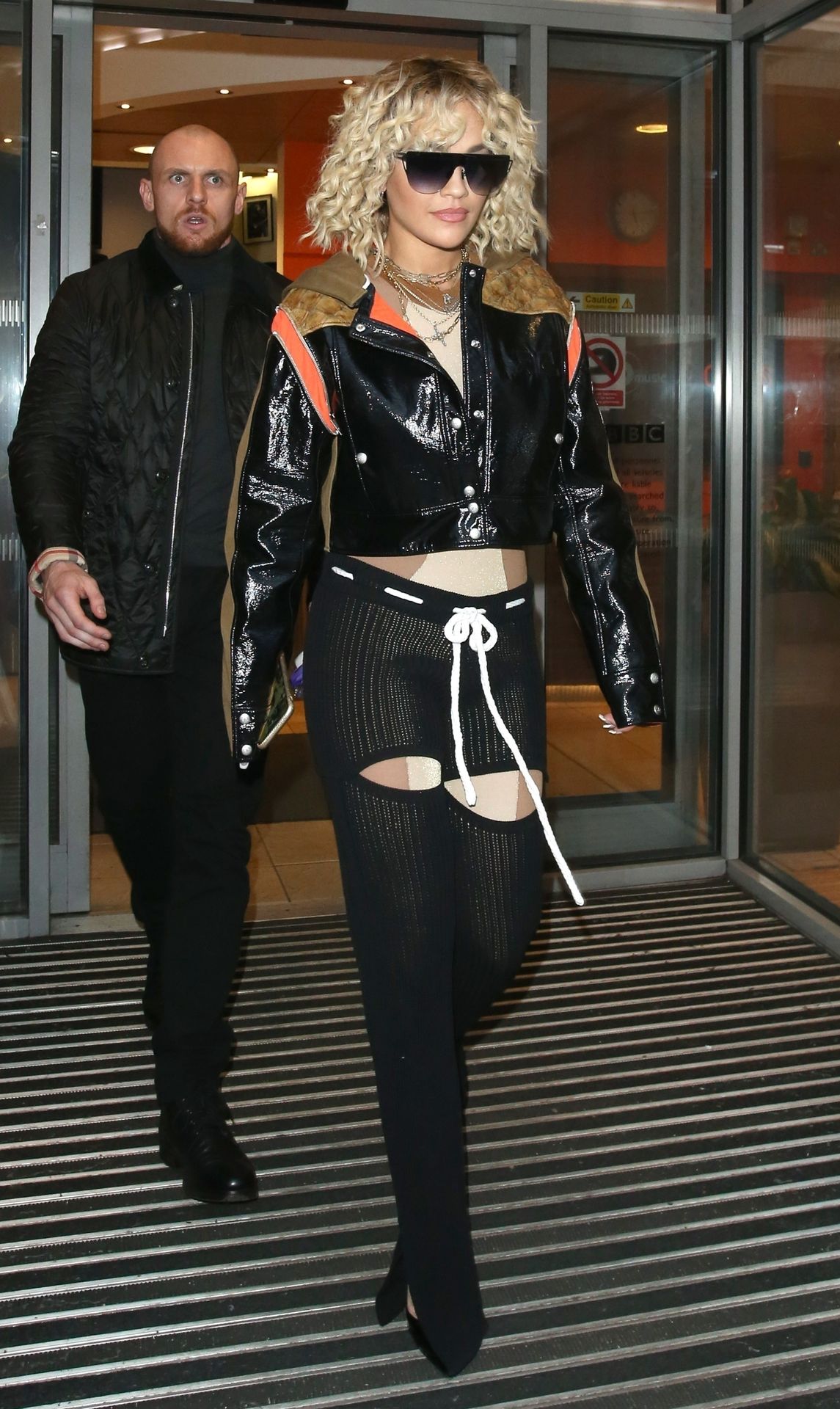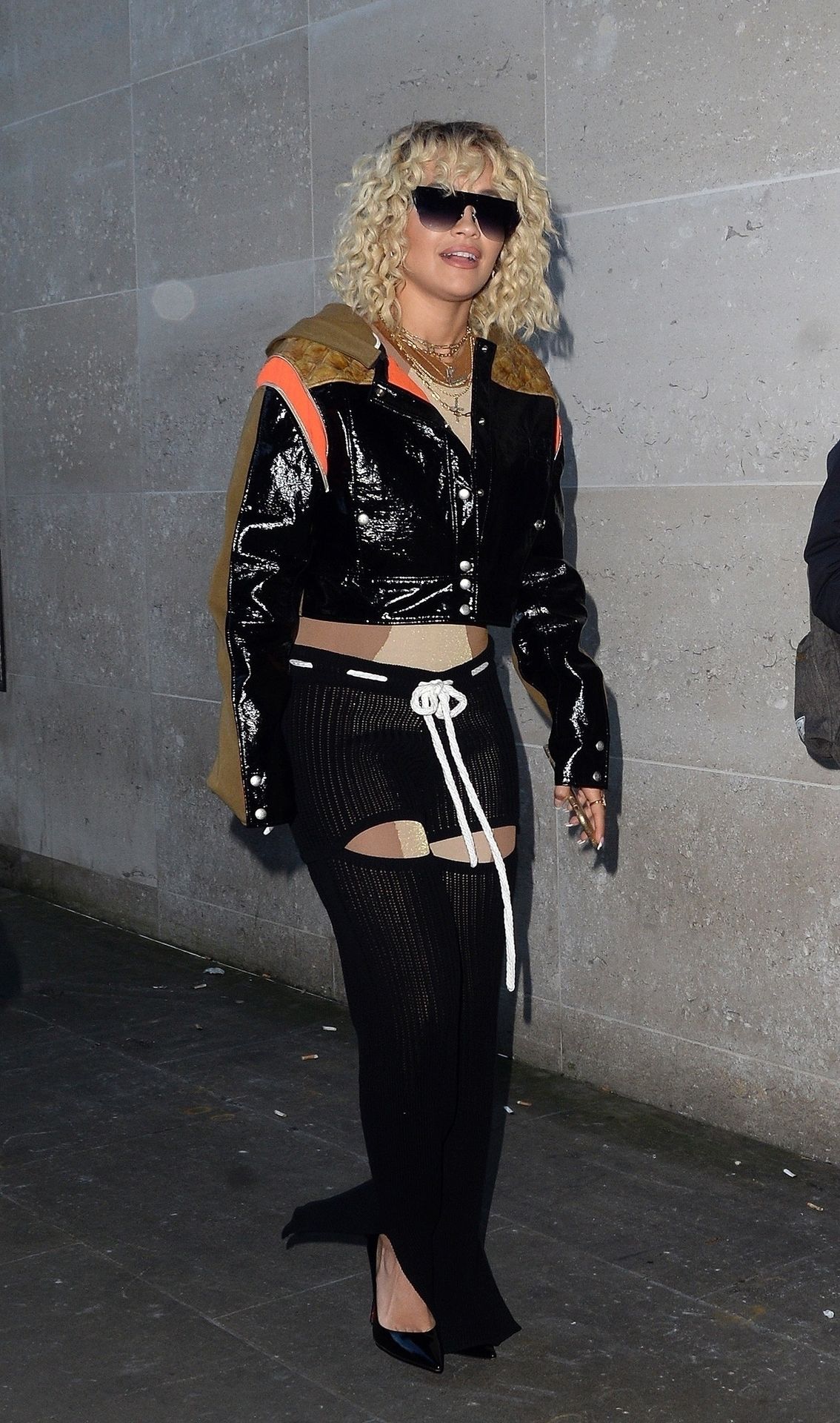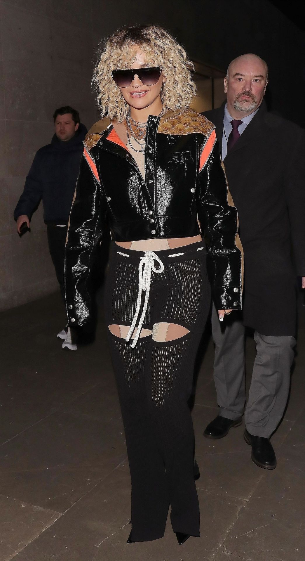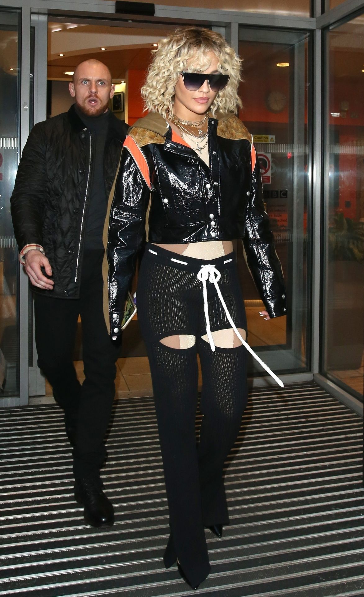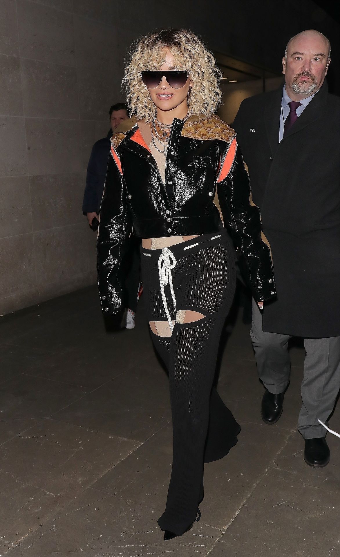 Singer Rita Ora is seen here leaving BBC Radio 2 studios and heading to BBC Radio 1 studios on London to Co Host a show with Nick Grimshaw on BBC Radio 1 in London, 01/16/2020. Rita wore a black leather jacket with striped collar and sleeves, beige top and black skintight trousers with a cut out along the thigh.