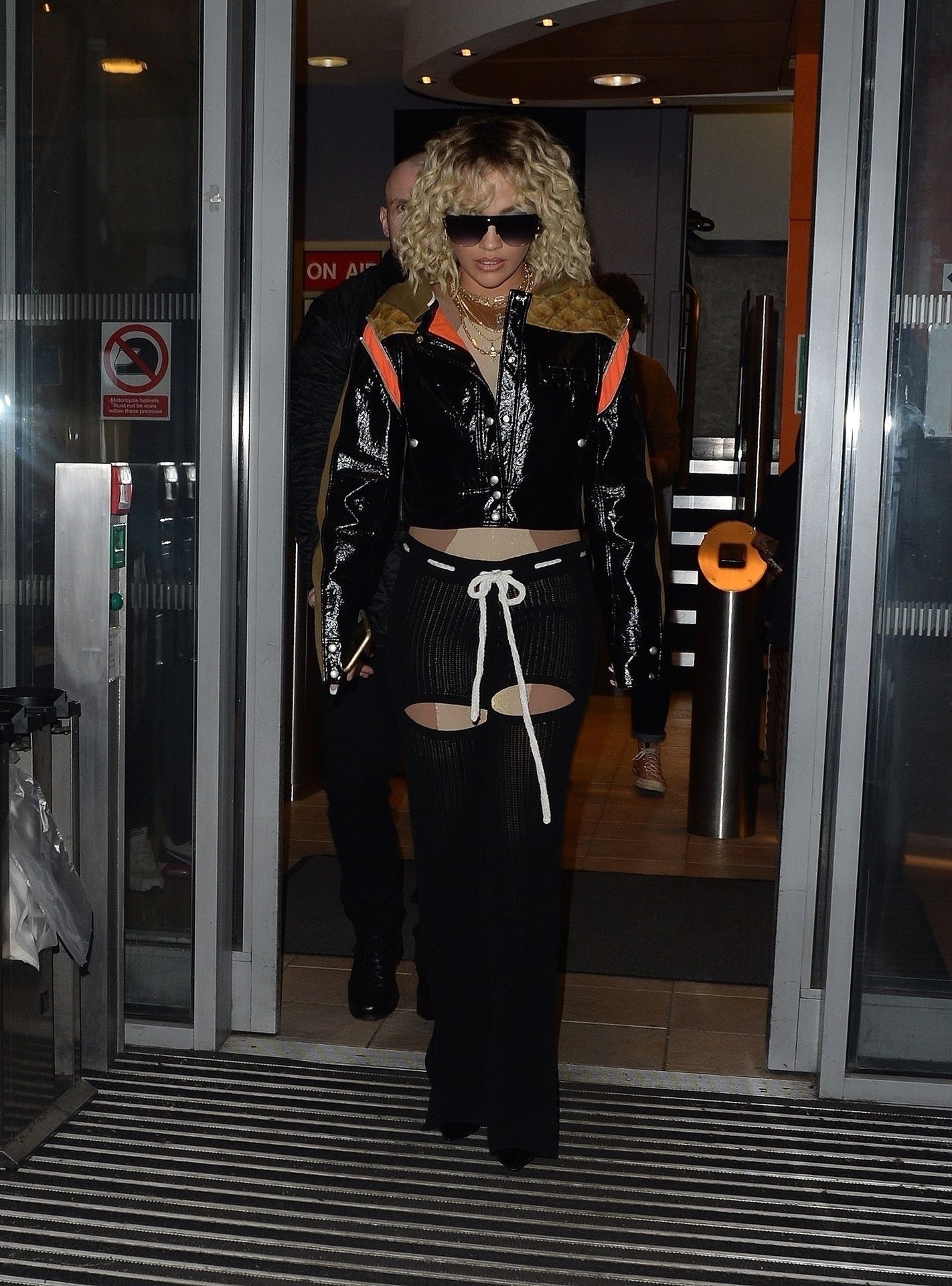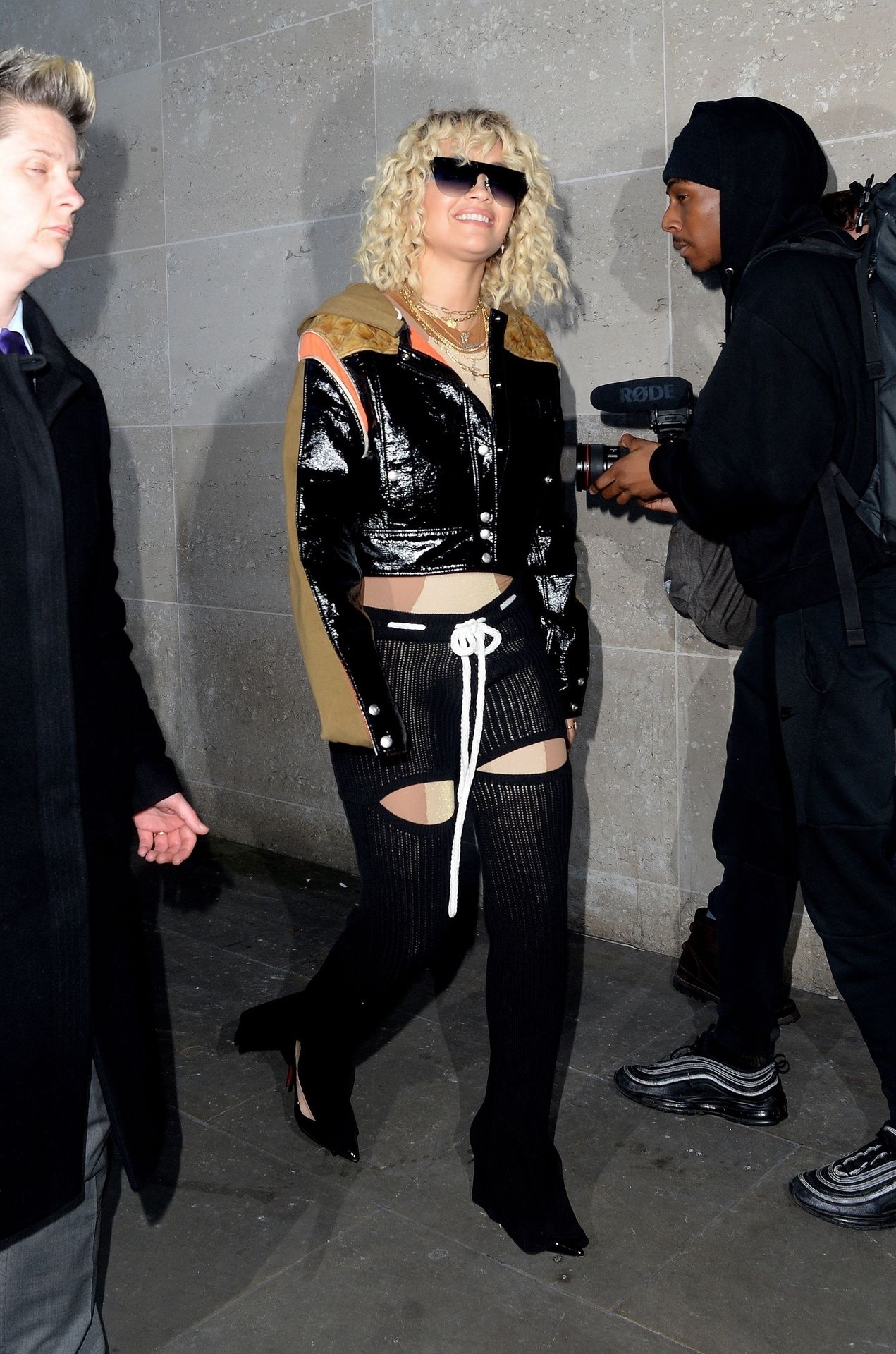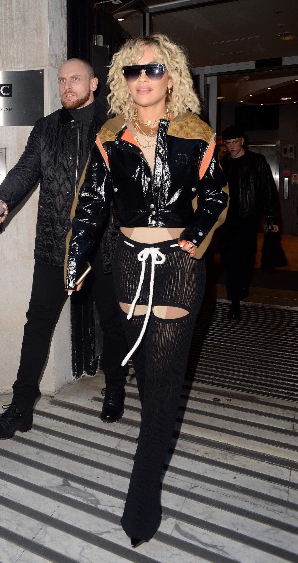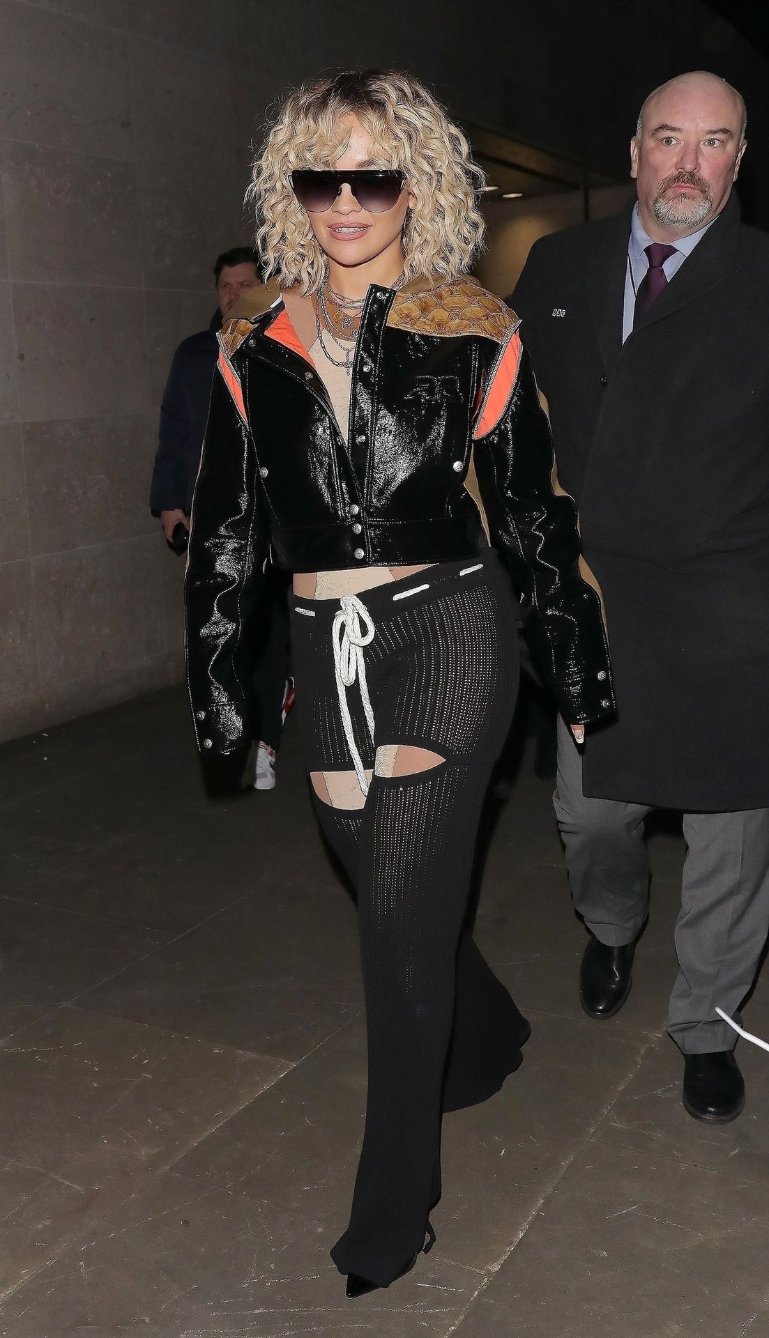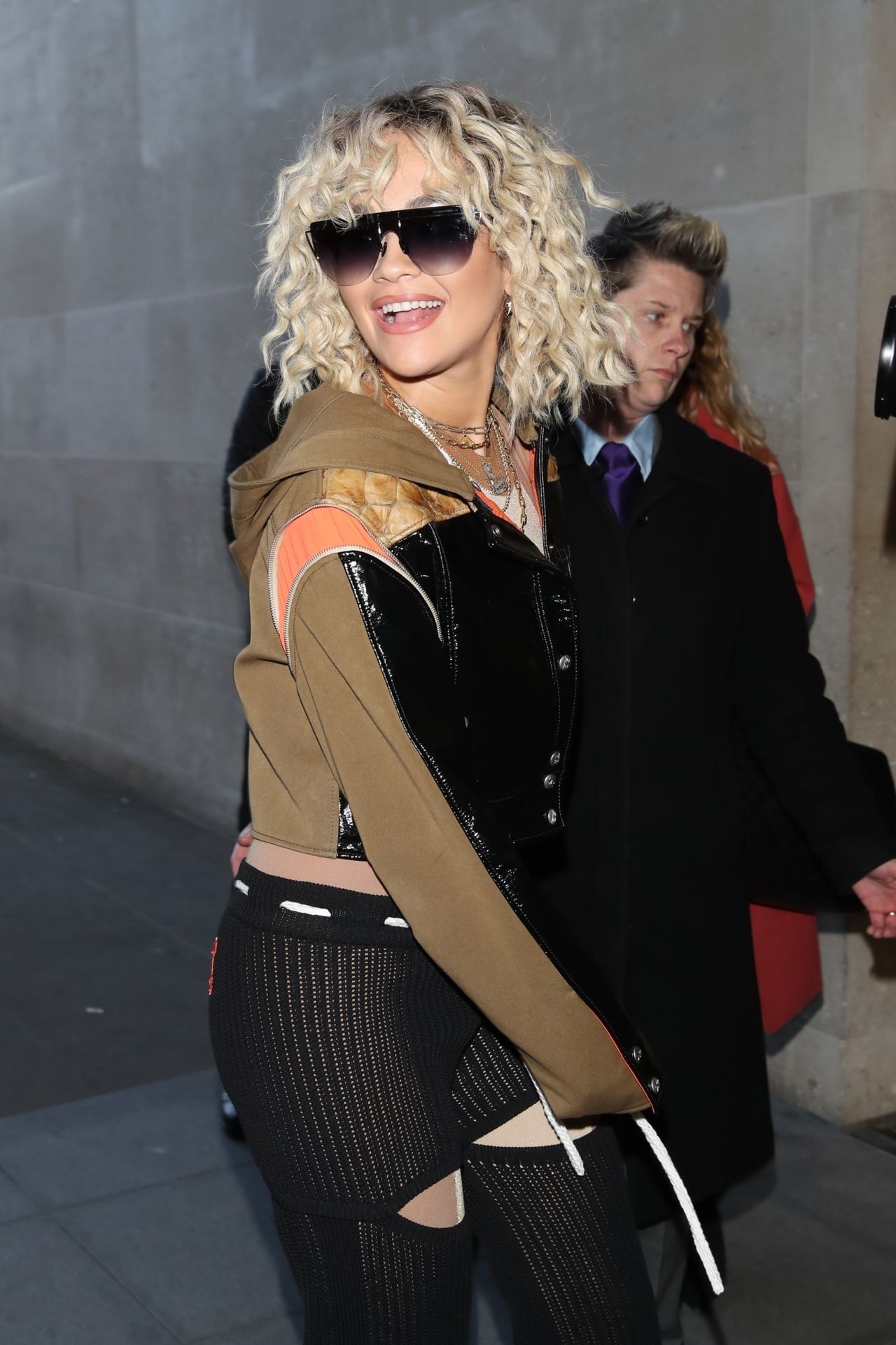 Singer Rita Ora is seen here leaving BBC Radio 2 studios and heading to BBC Radio 1 studios on London to Co Host a show with Nick Grimshaw on BBC Radio 1 in London, 01/16/2020. Rita wore a black leather jacket with striped collar and sleeves, beige top and black skintight trousers with a cut out along the thigh.