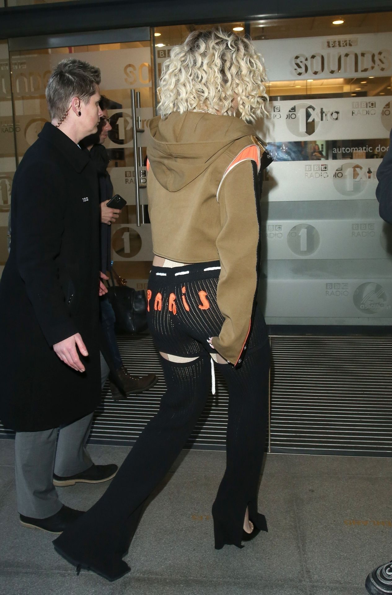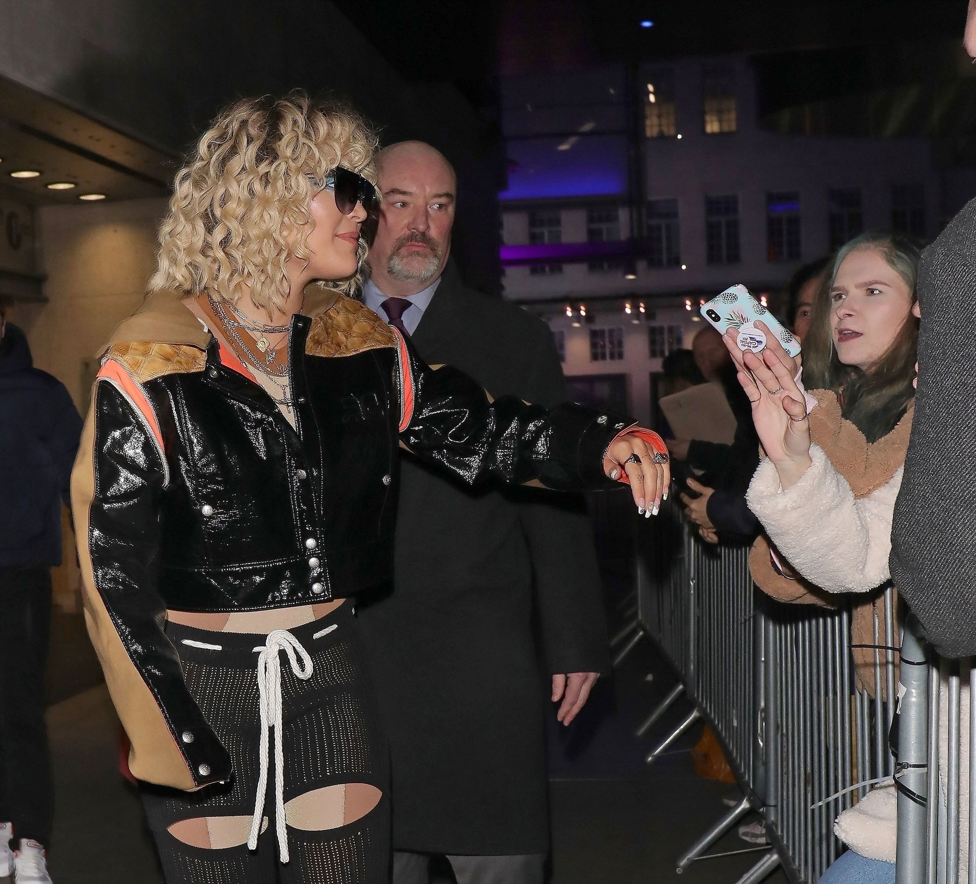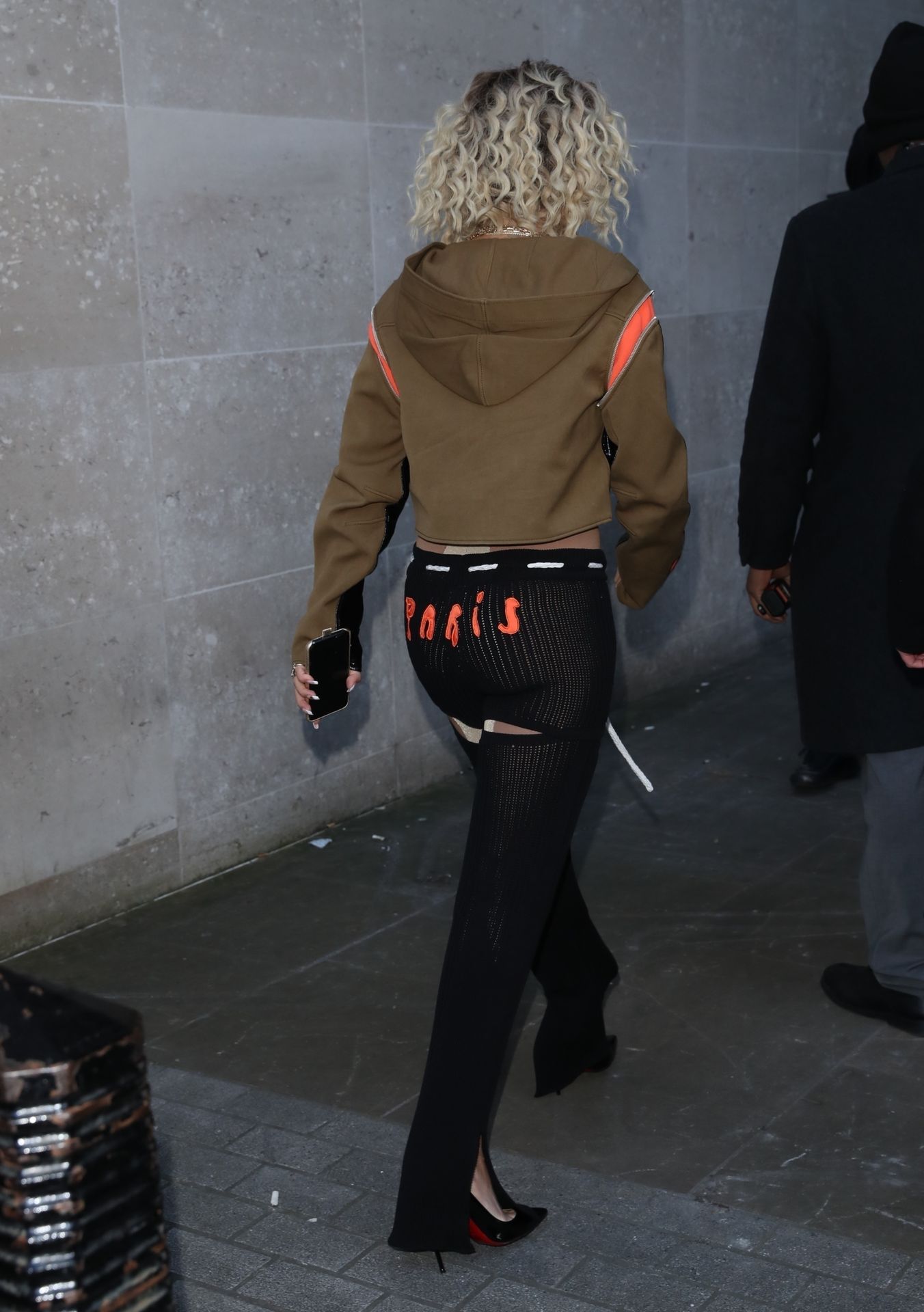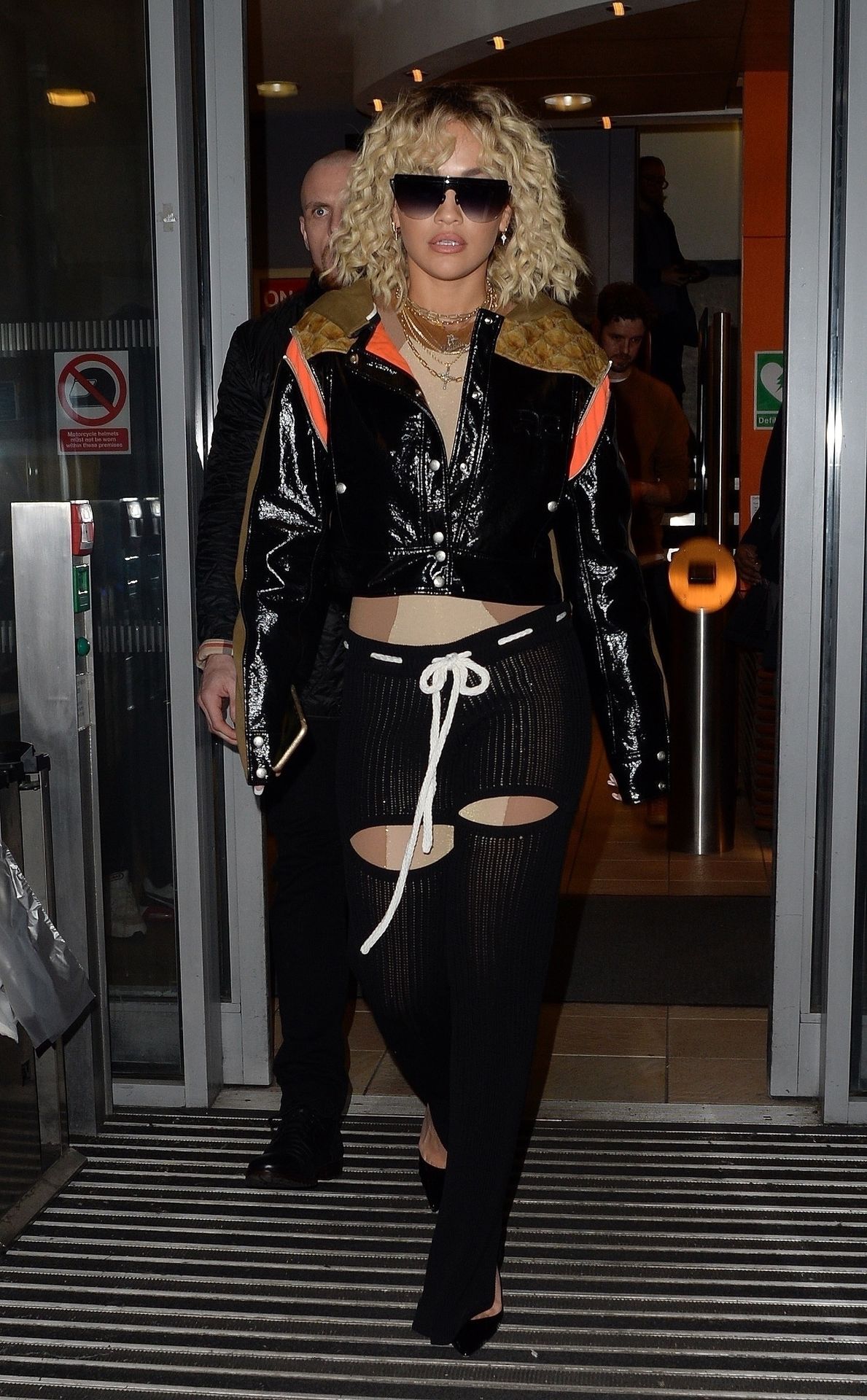Singer Rita Ora is seen here leaving BBC Radio 2 studios and heading to BBC Radio 1 studios on London to Co Host a show with Nick Grimshaw on BBC Radio 1 in London, 01/16/2020. Rita wore a black leather jacket with striped collar and sleeves, beige top and black skintight trousers with a cut out along the thigh.