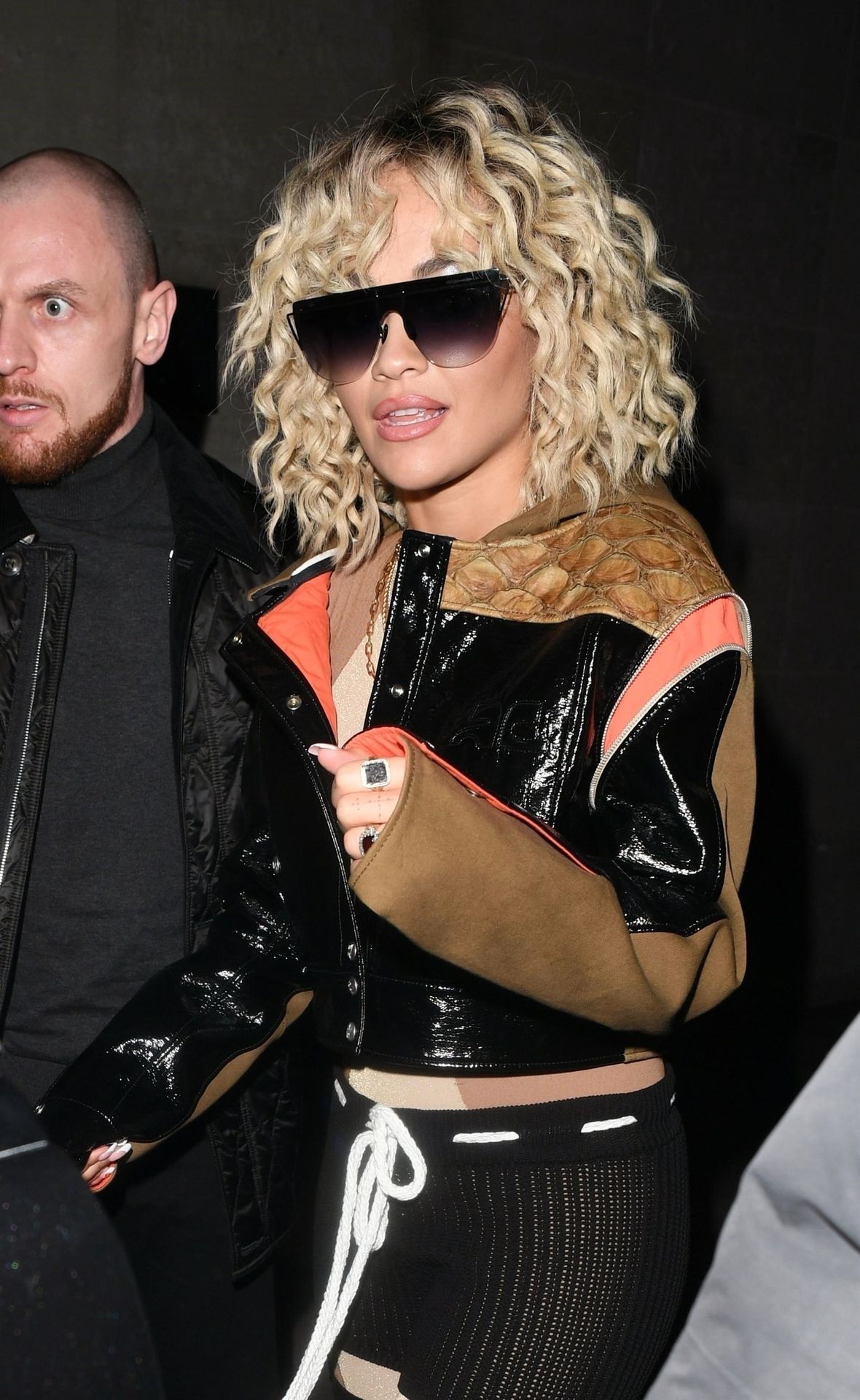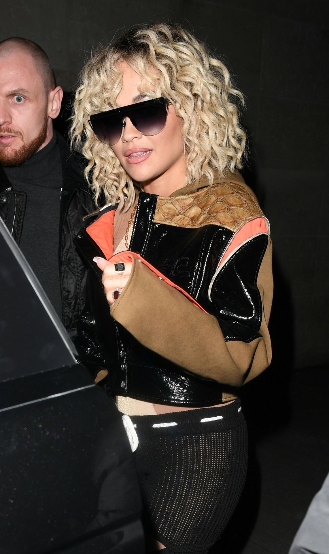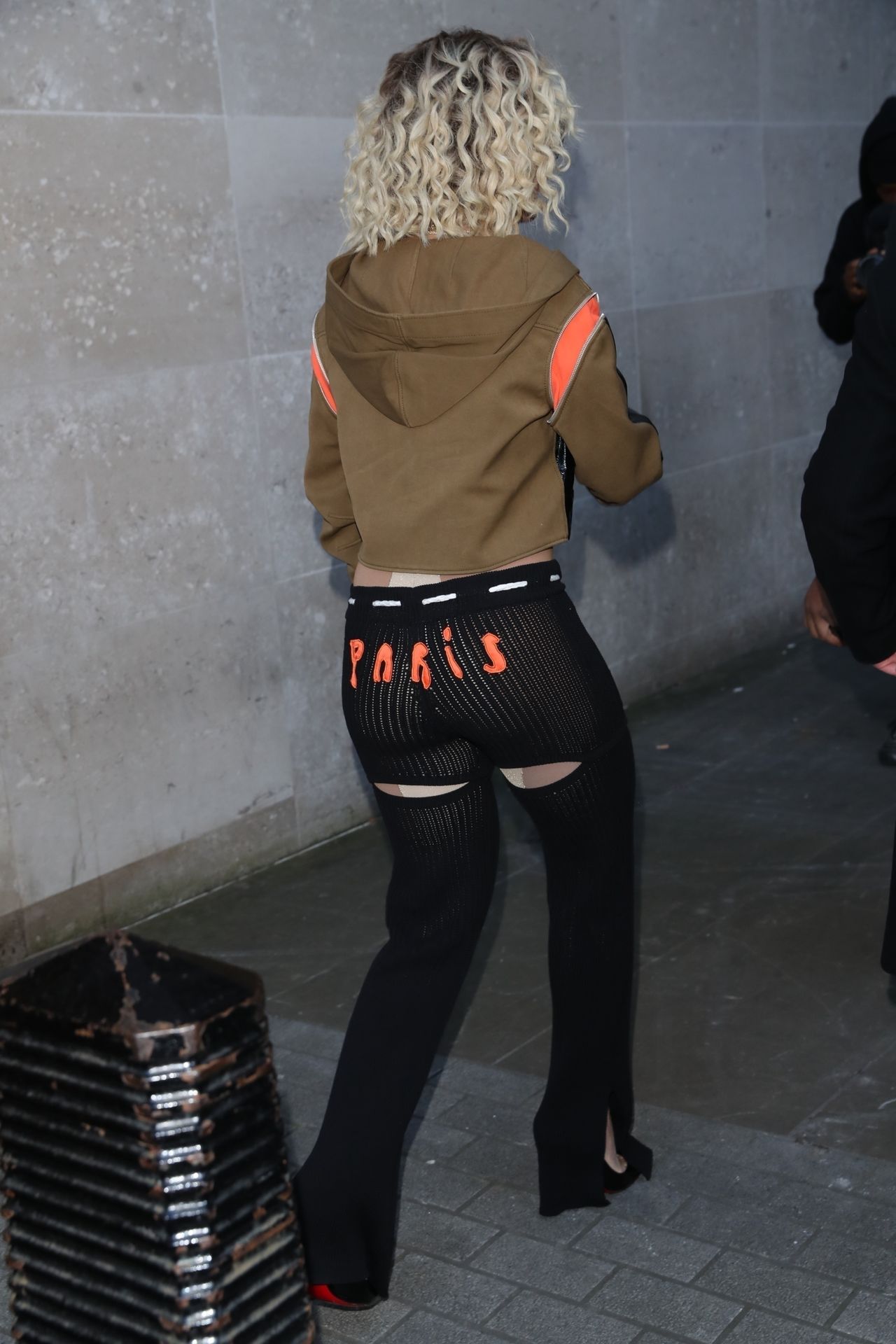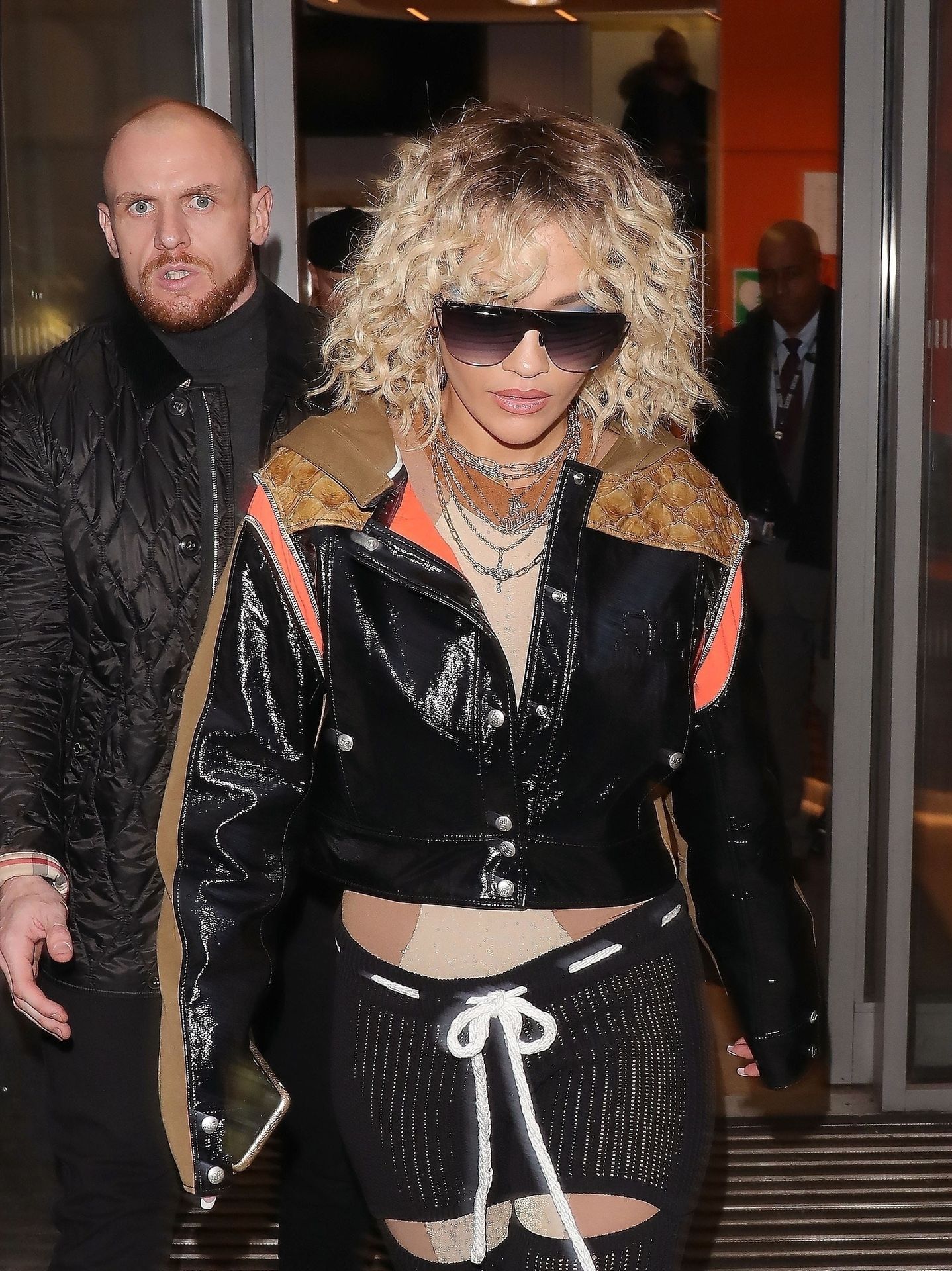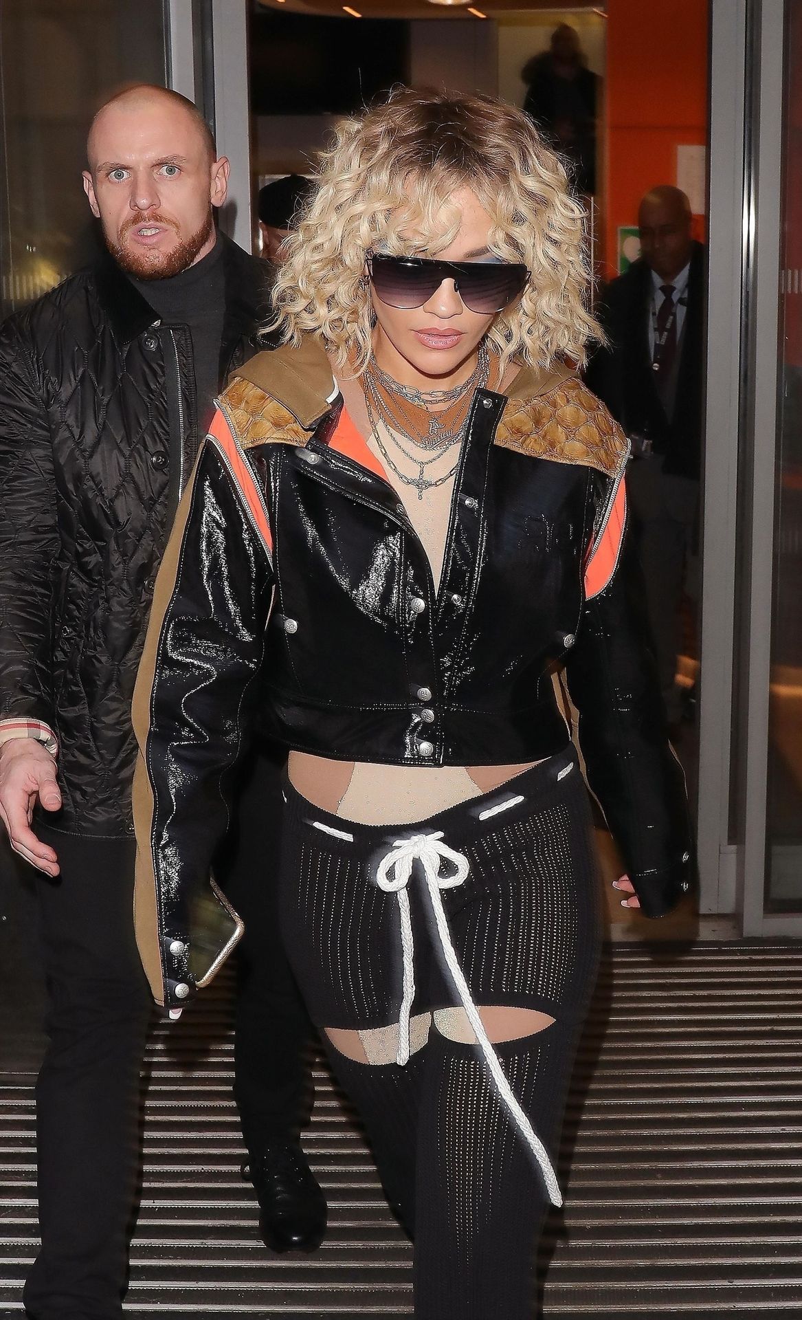 Singer Rita Ora is seen here leaving BBC Radio 2 studios and heading to BBC Radio 1 studios on London to Co Host a show with Nick Grimshaw on BBC Radio 1 in London, 01/16/2020. Rita wore a black leather jacket with striped collar and sleeves, beige top and black skintight trousers with a cut out along the thigh.