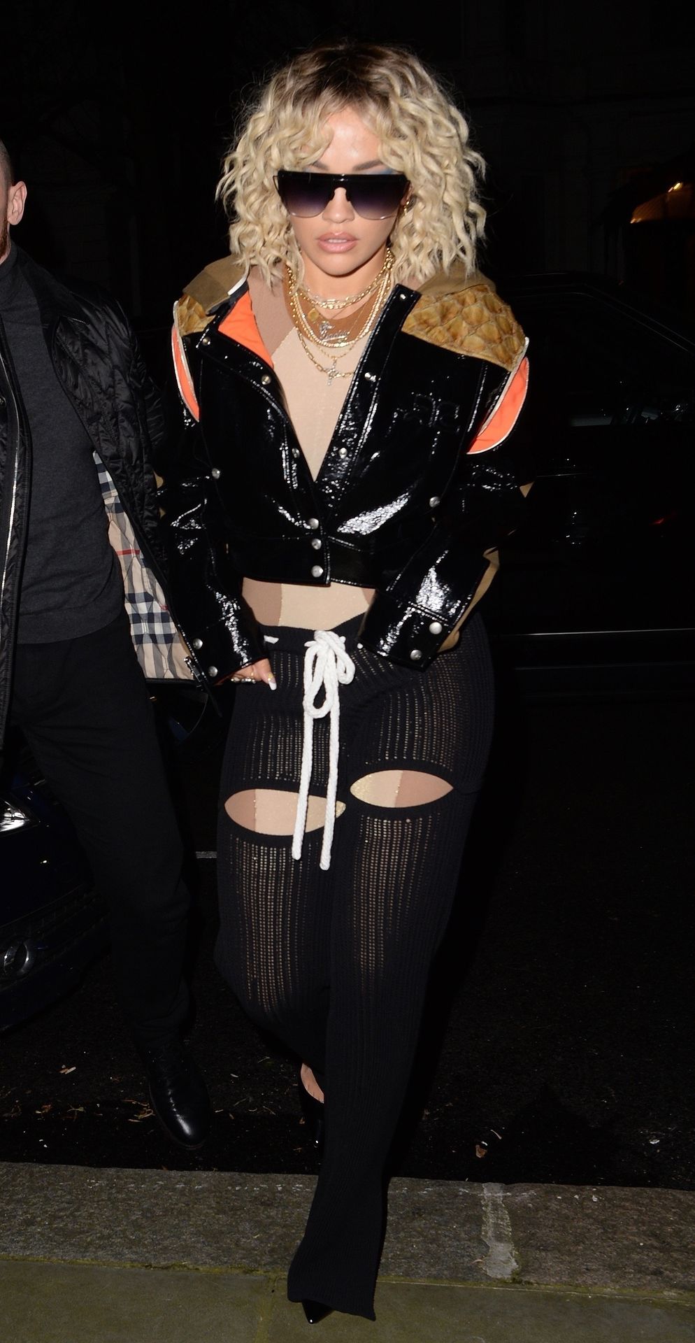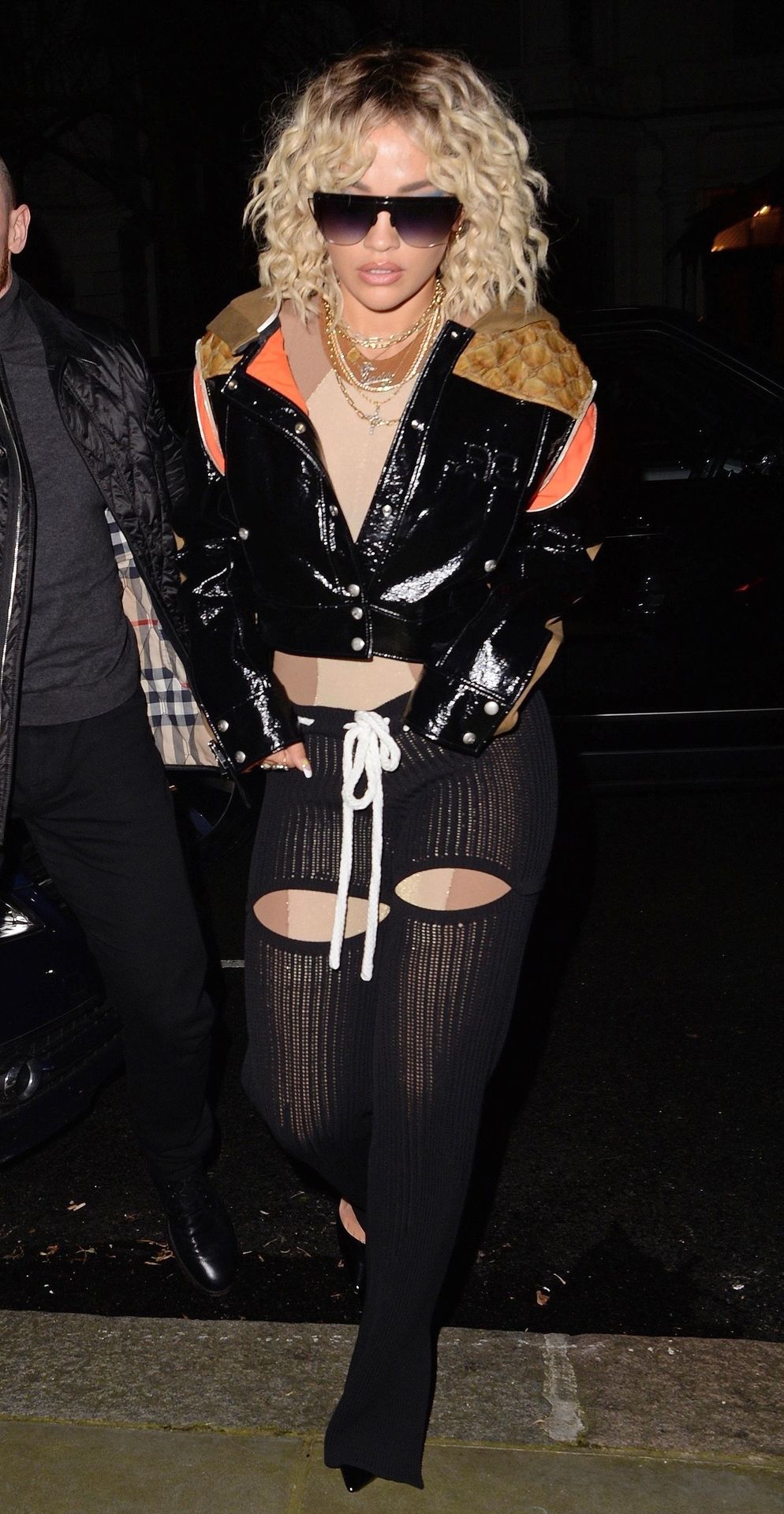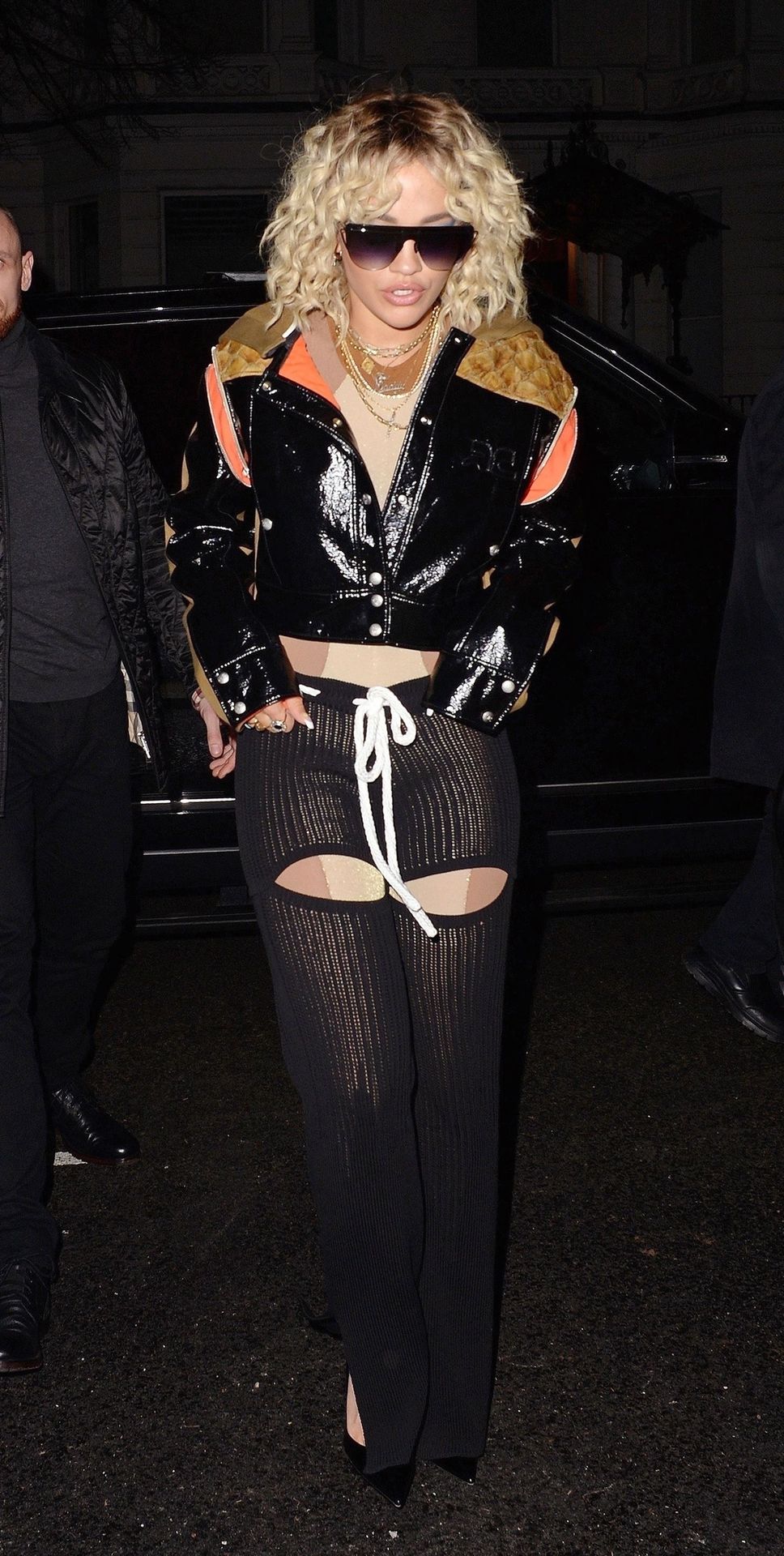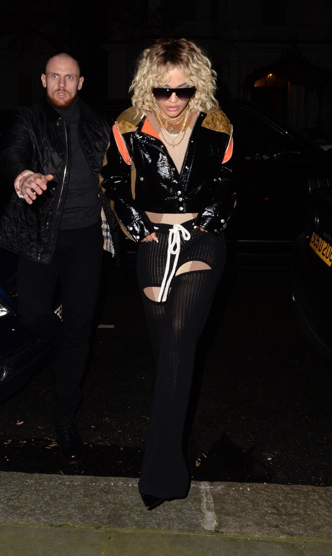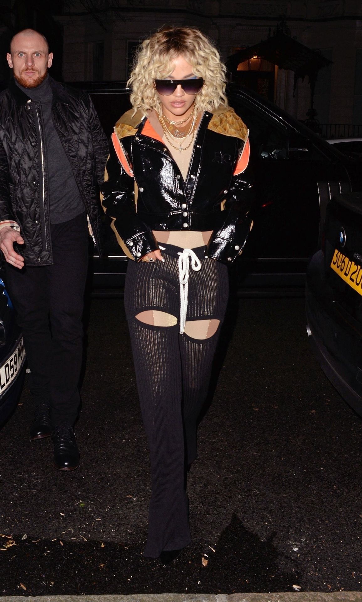 Singer Rita Ora is seen here leaving BBC Radio 2 studios and heading to BBC Radio 1 studios on London to Co Host a show with Nick Grimshaw on BBC Radio 1 in London, 01/16/2020. Rita wore a black leather jacket with striped collar and sleeves, beige top and black skintight trousers with a cut out along the thigh.