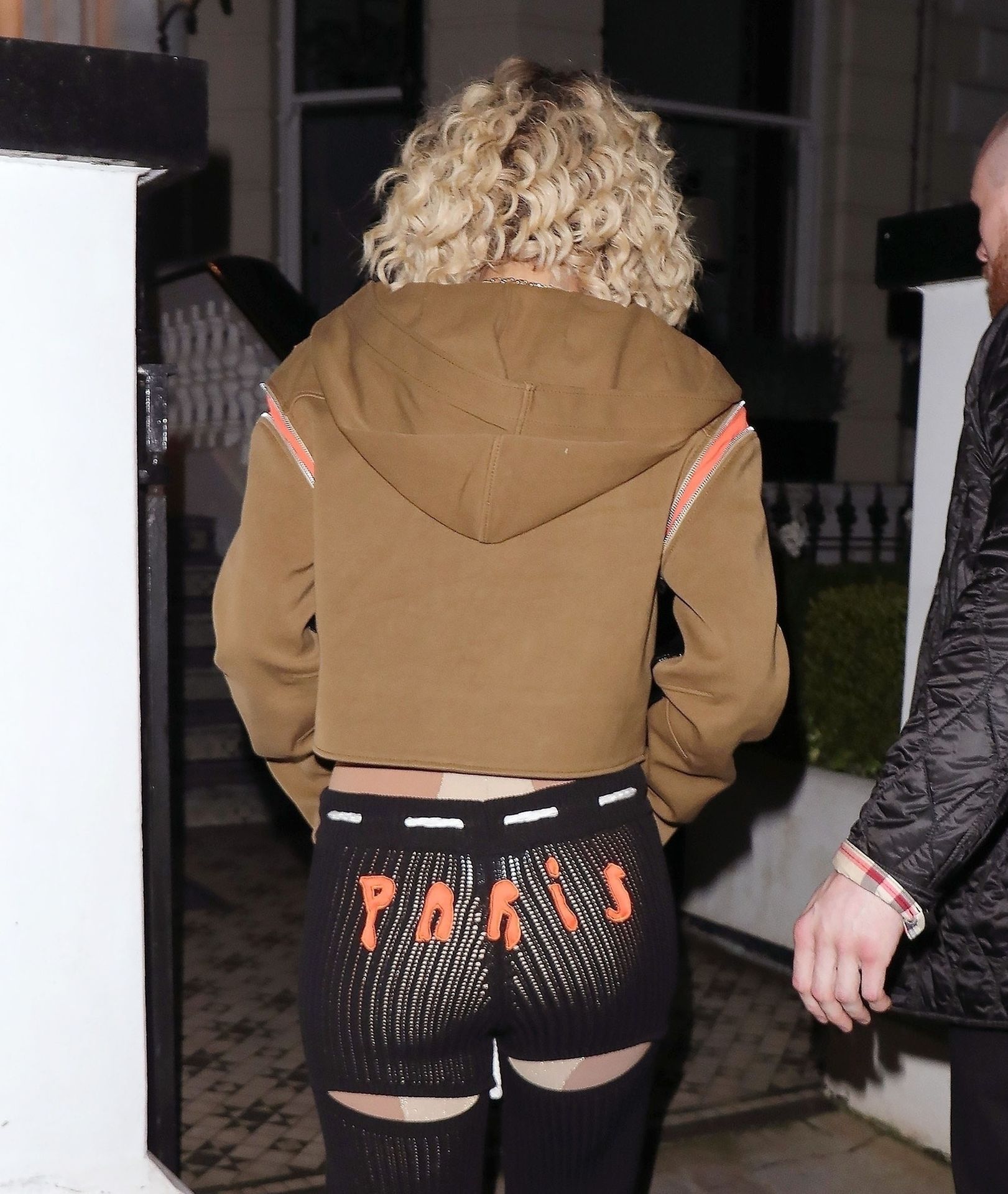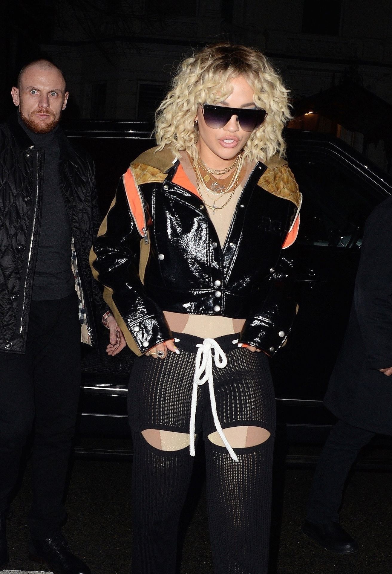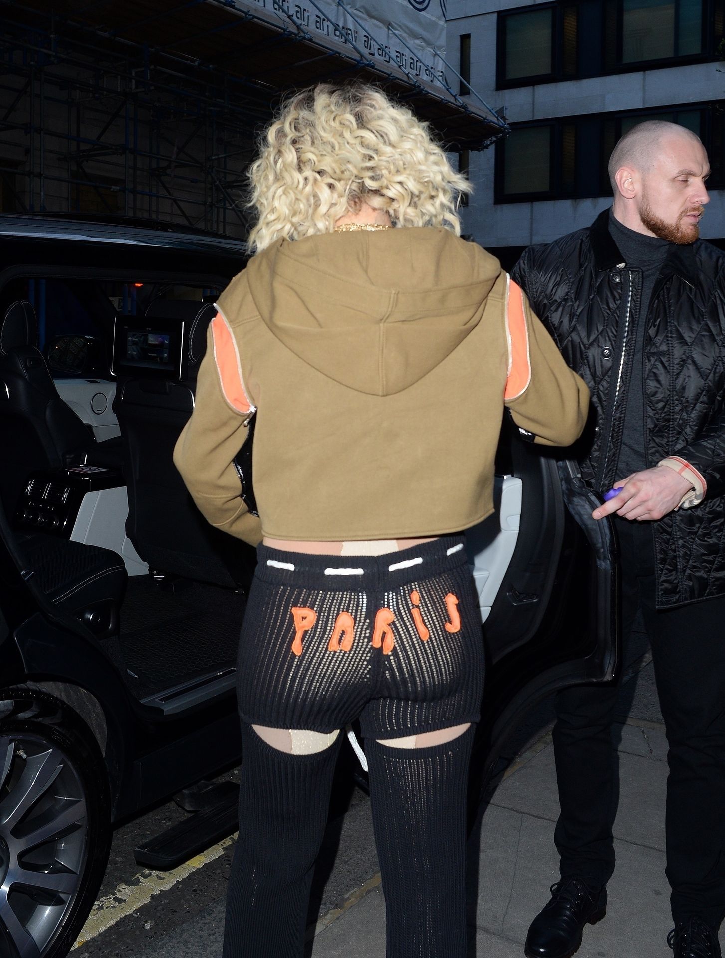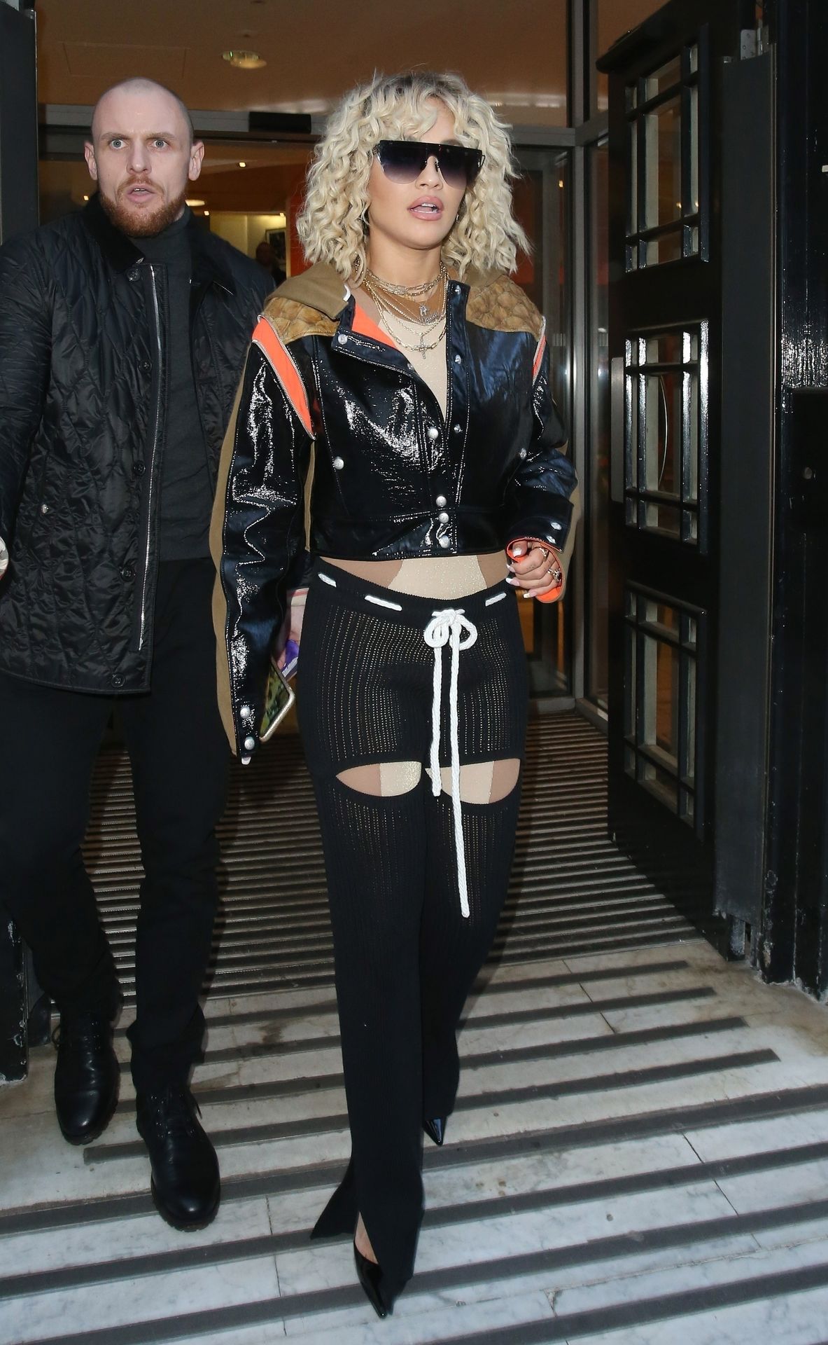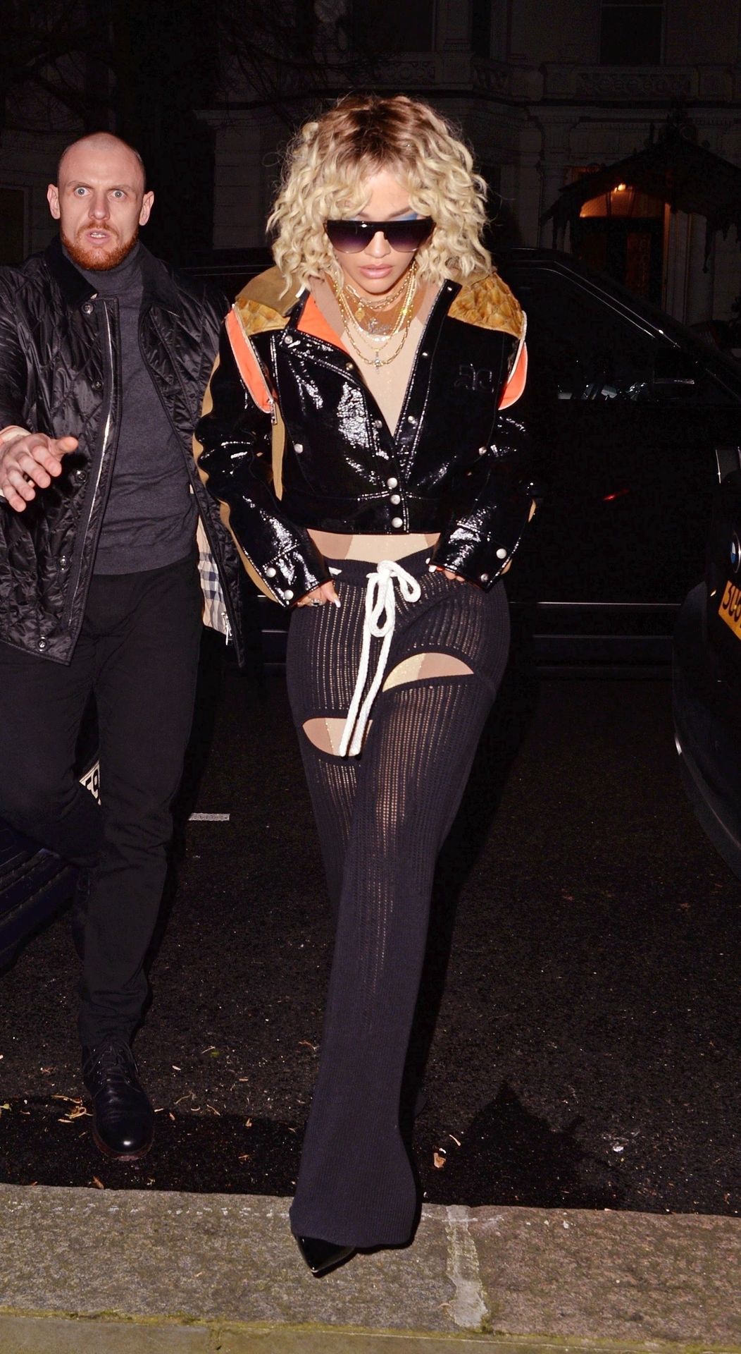 Singer Rita Ora is seen here leaving BBC Radio 2 studios and heading to BBC Radio 1 studios on London to Co Host a show with Nick Grimshaw on BBC Radio 1 in London, 01/16/2020. Rita wore a black leather jacket with striped collar and sleeves, beige top and black skintight trousers with a cut out along the thigh.