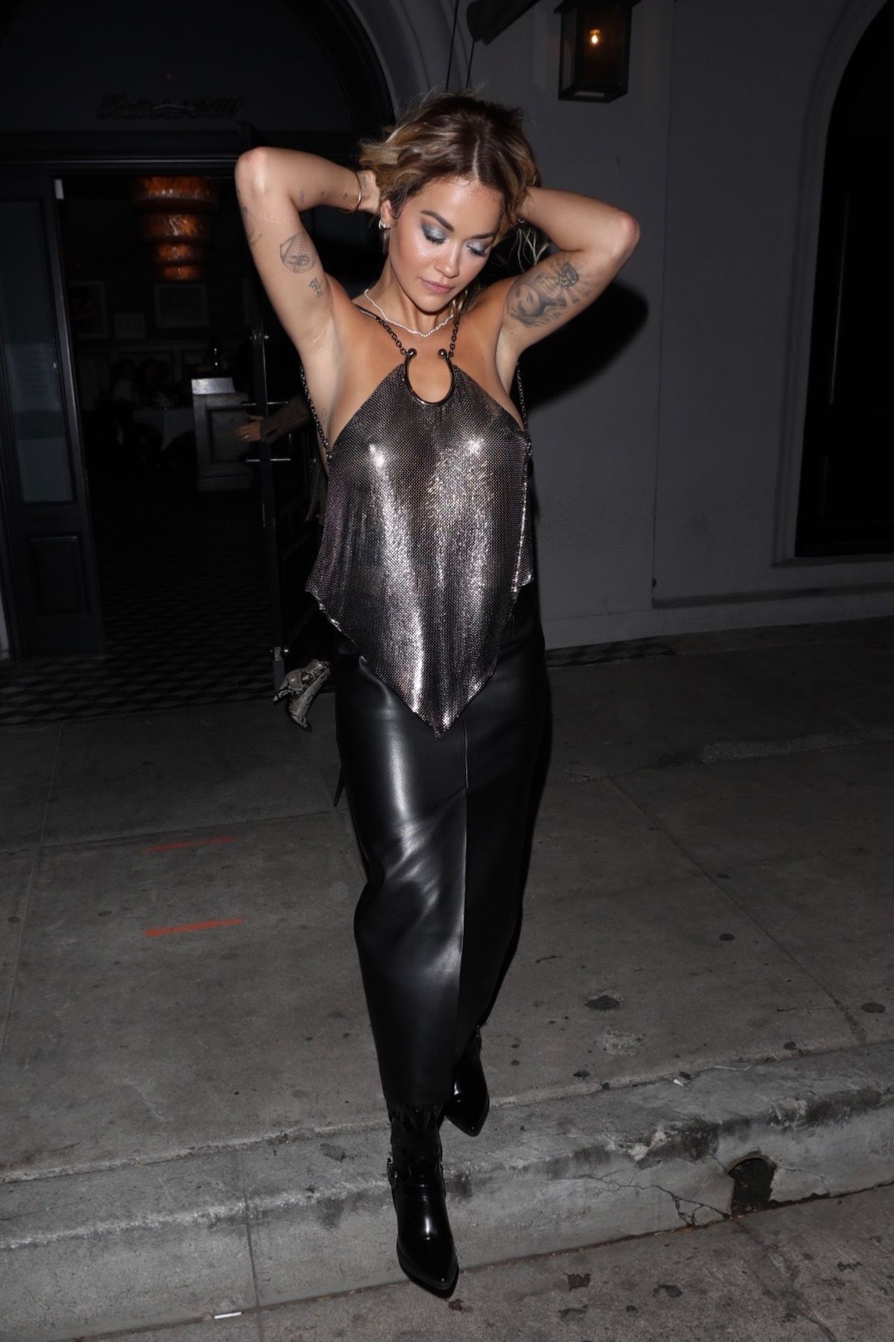 Rita Ora wears a revealing backless sequin top that shows off her many tattoos and black leather slitted dress with knee-high boots to dinner at Chateau Marmont in West Hollywood, 02/26/2020.
