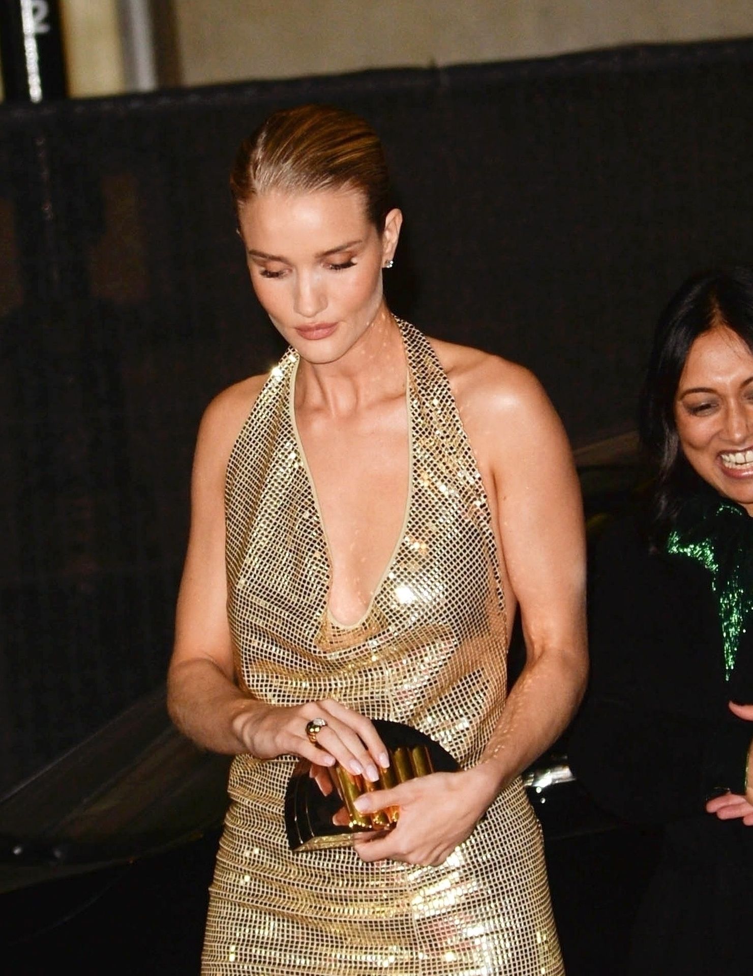 English model and actress Rosie Huntington-Whiteley poses in a golden dress on the red carpet upon arrival at The Fashion Awards 2019 in London, 12/02/2019.