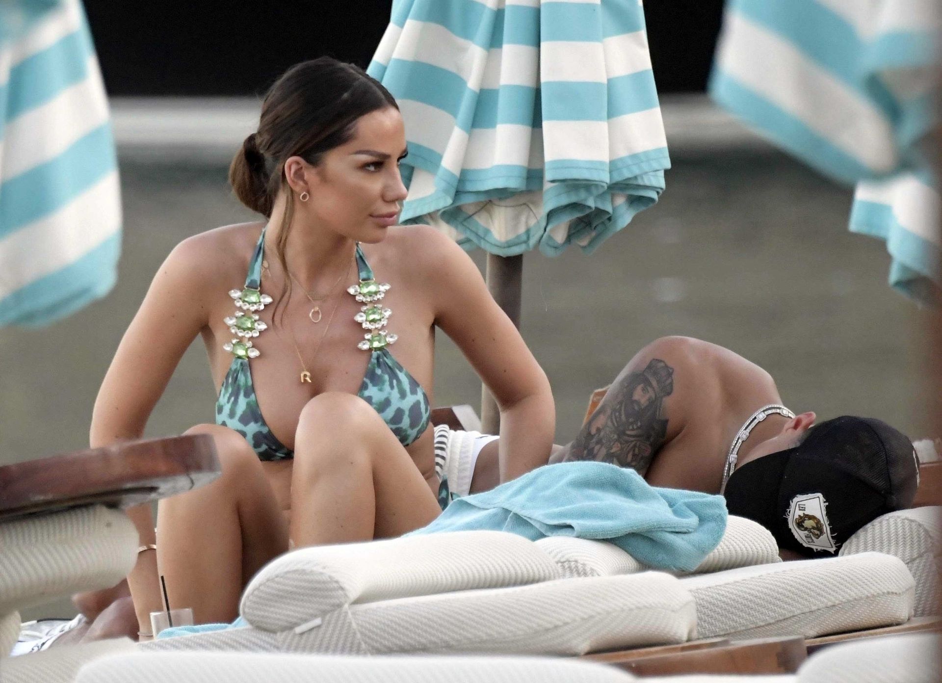 Tottenham and England International footballer Dele Alli was spotted looking a little worse for wear and possibly slightly drunk after spending the day at Psarou beach with his girlfriend Ruby Mae, 07/03/2019. Ruby seemed to be trying to wake him up and even asked for help from the security team to carry him off.
