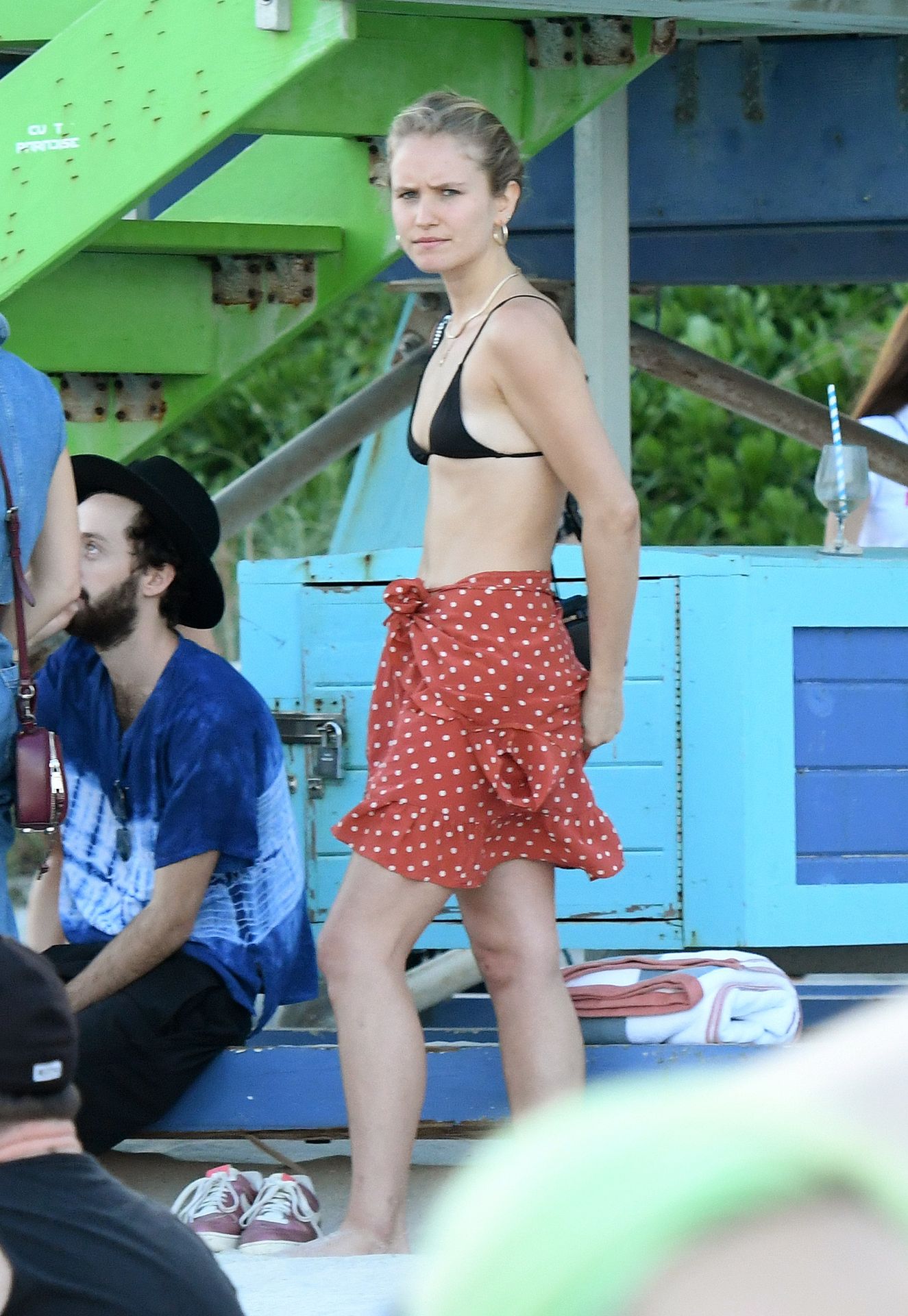 Titless model Sailor Brinkley Cook wears a little black bikini as she takes a sunset dip on the beach in Miami, 12/07/2018.