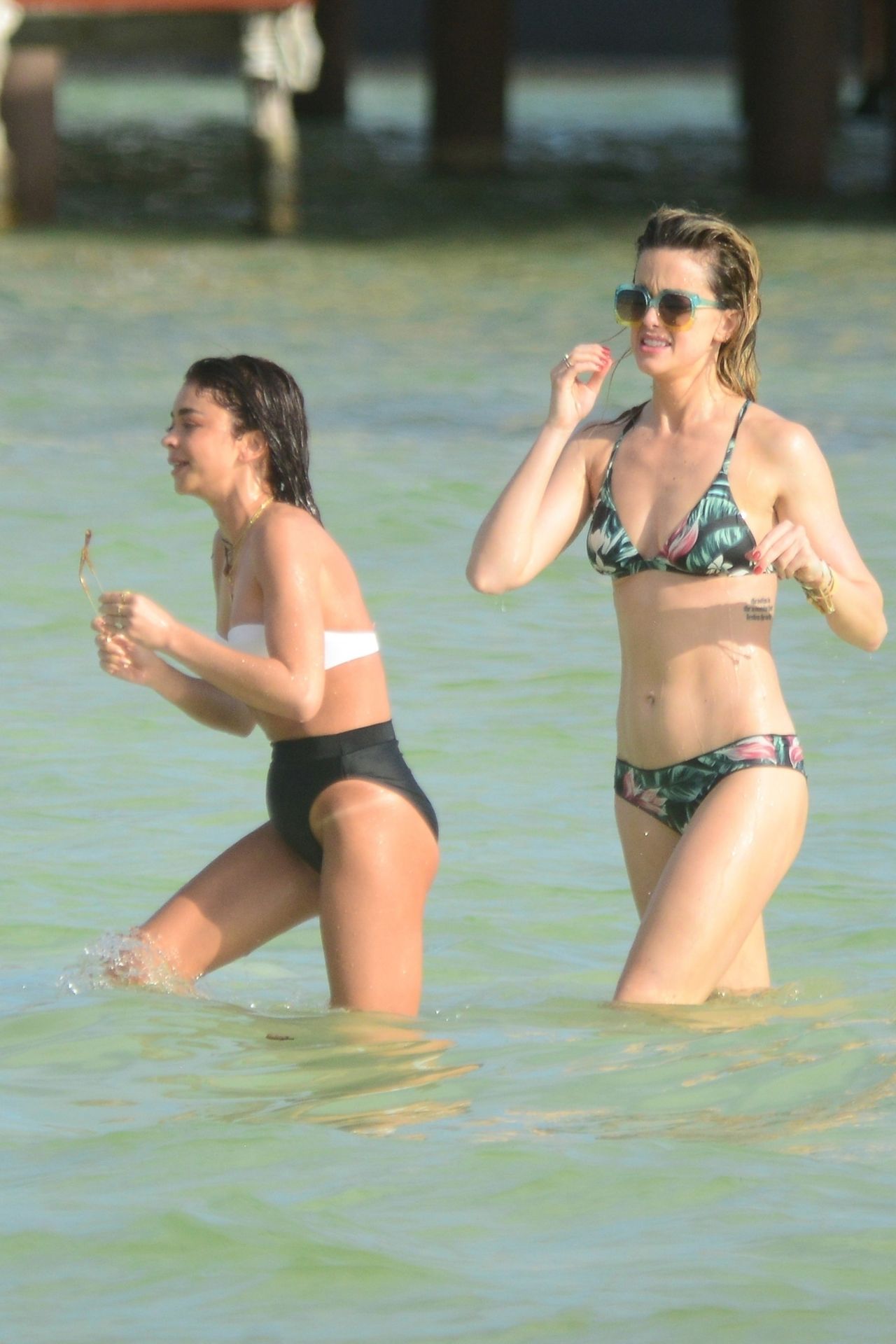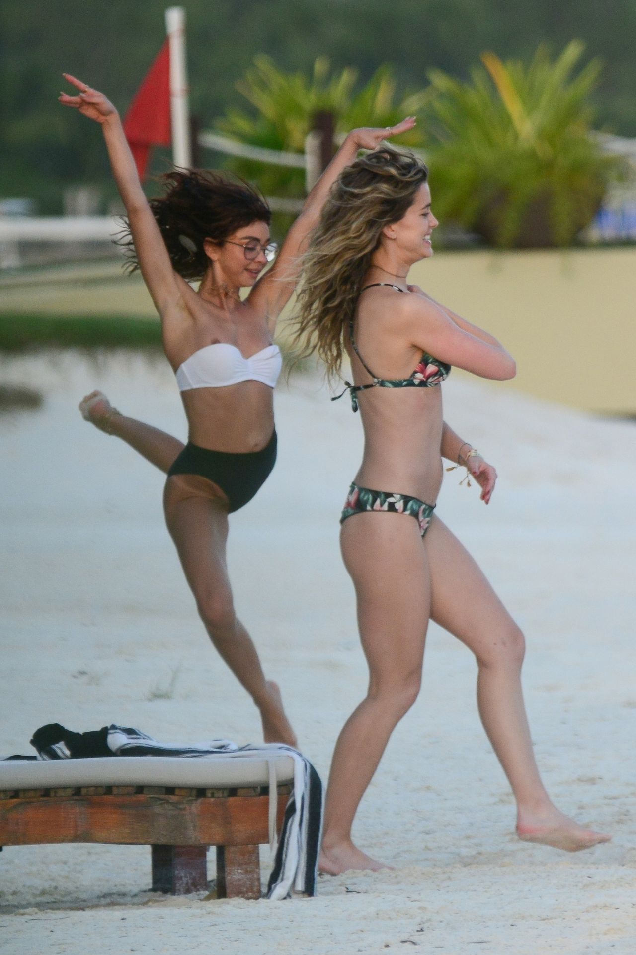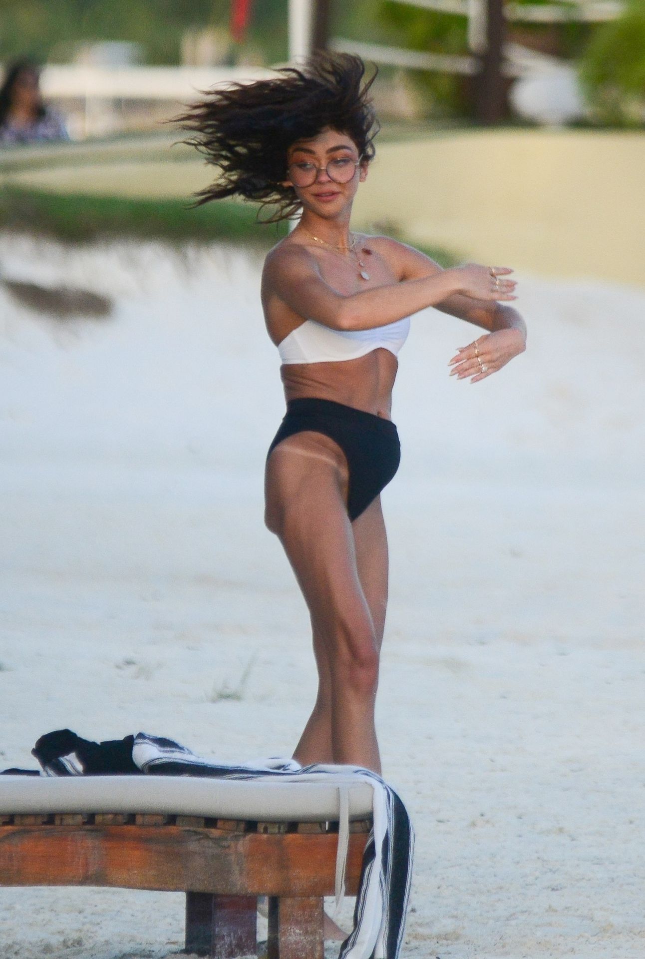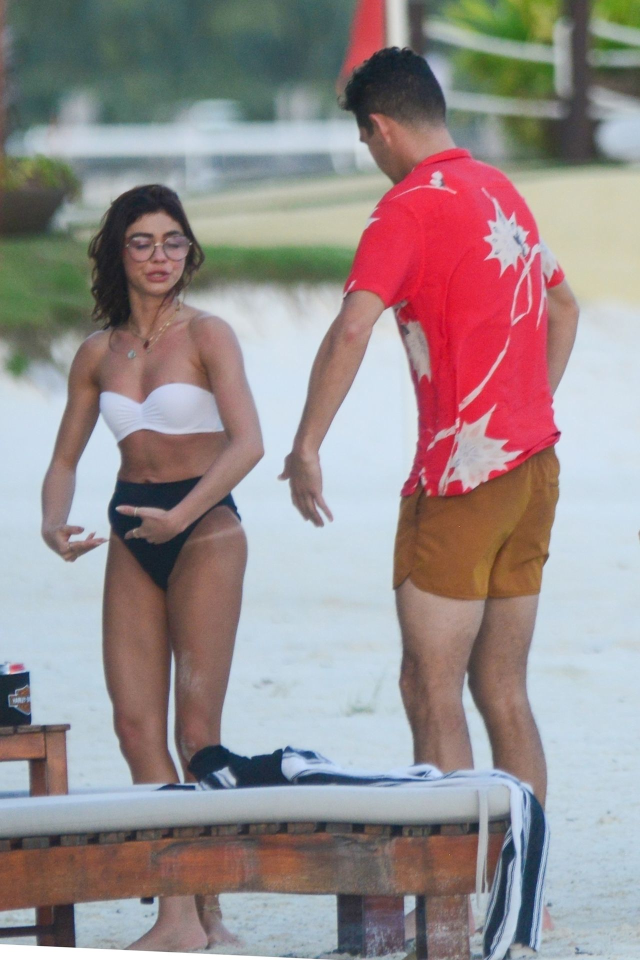 Sarah Hyland suffers a wardrobe malfunction while enjoying the beach with her fiancee Wells Adams and their friends Ashley Newbrough, Ciara Robinson, and Matt Shively in Cancun, Mexico, 12/31/2019. Sarah is seen dancing as her tiny tube top slips too low as she suffers a nip slip. Sarah doesn’t seem to mind as she continues to dance in her bikini with her friend.