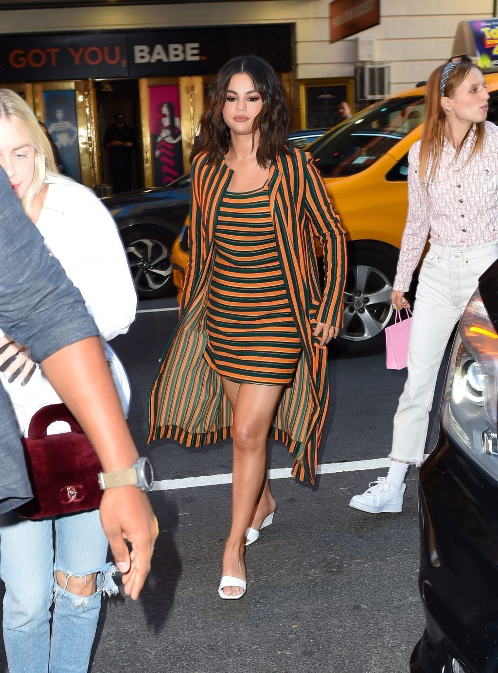 Singer Selena Gomez gets leggy in stripes as she arrives at Mean Girls Broadway play in New York City, 06/11/2019.