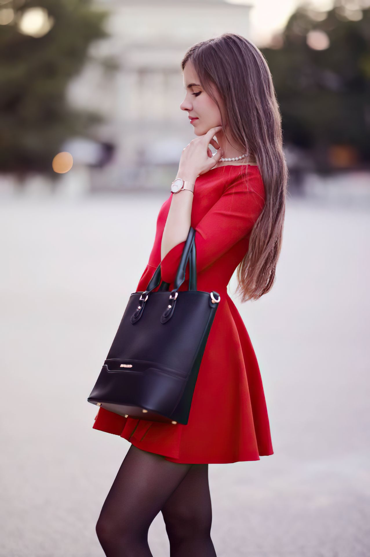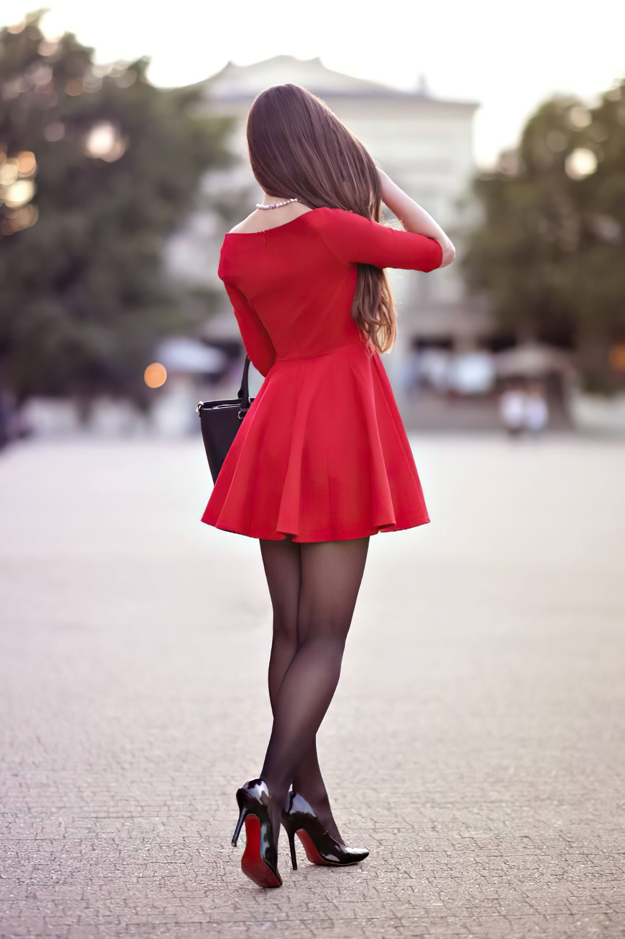 Polish model and blogger Ariadna Majewska looks hot in a red dress and stockings while posing for a new photoshoot on the street for her brand Ari-Maj.