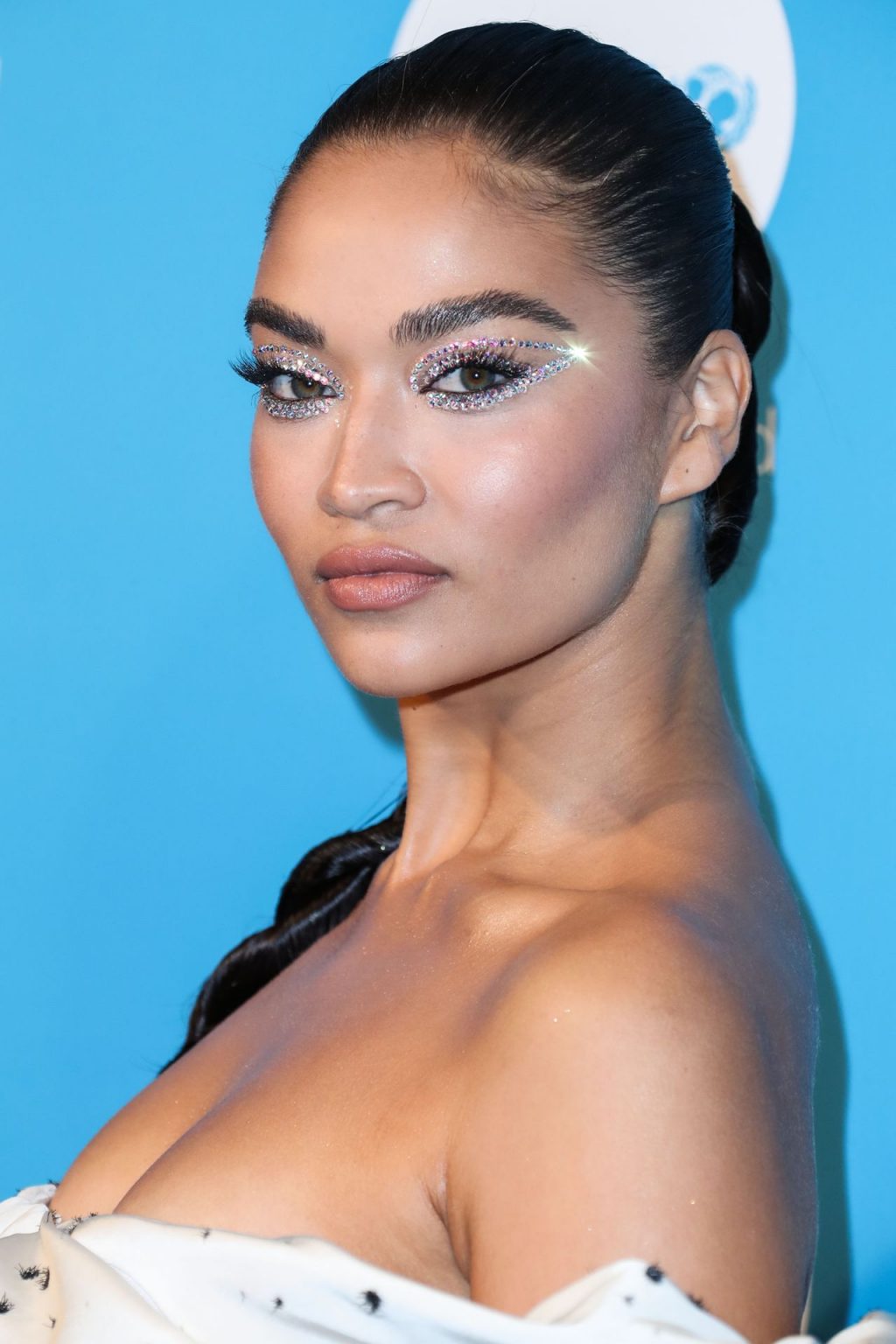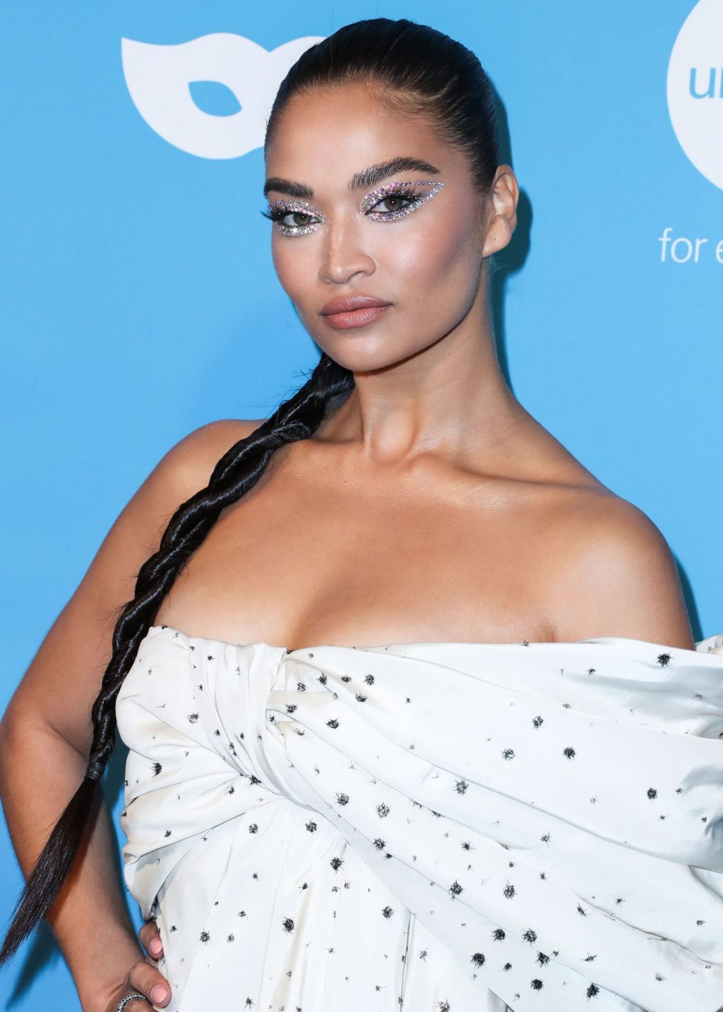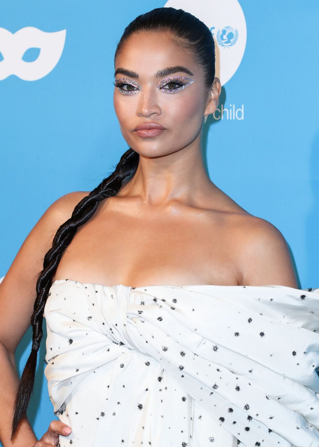 Model Shanina Shaik was photographed in a off-the-shoulder dress at the 7th Annual UNICEF Masquerade Ball 2019 held at the Kimpton La Peer Hotel on October 26, 2019 in West Hollywood, Los Angeles.