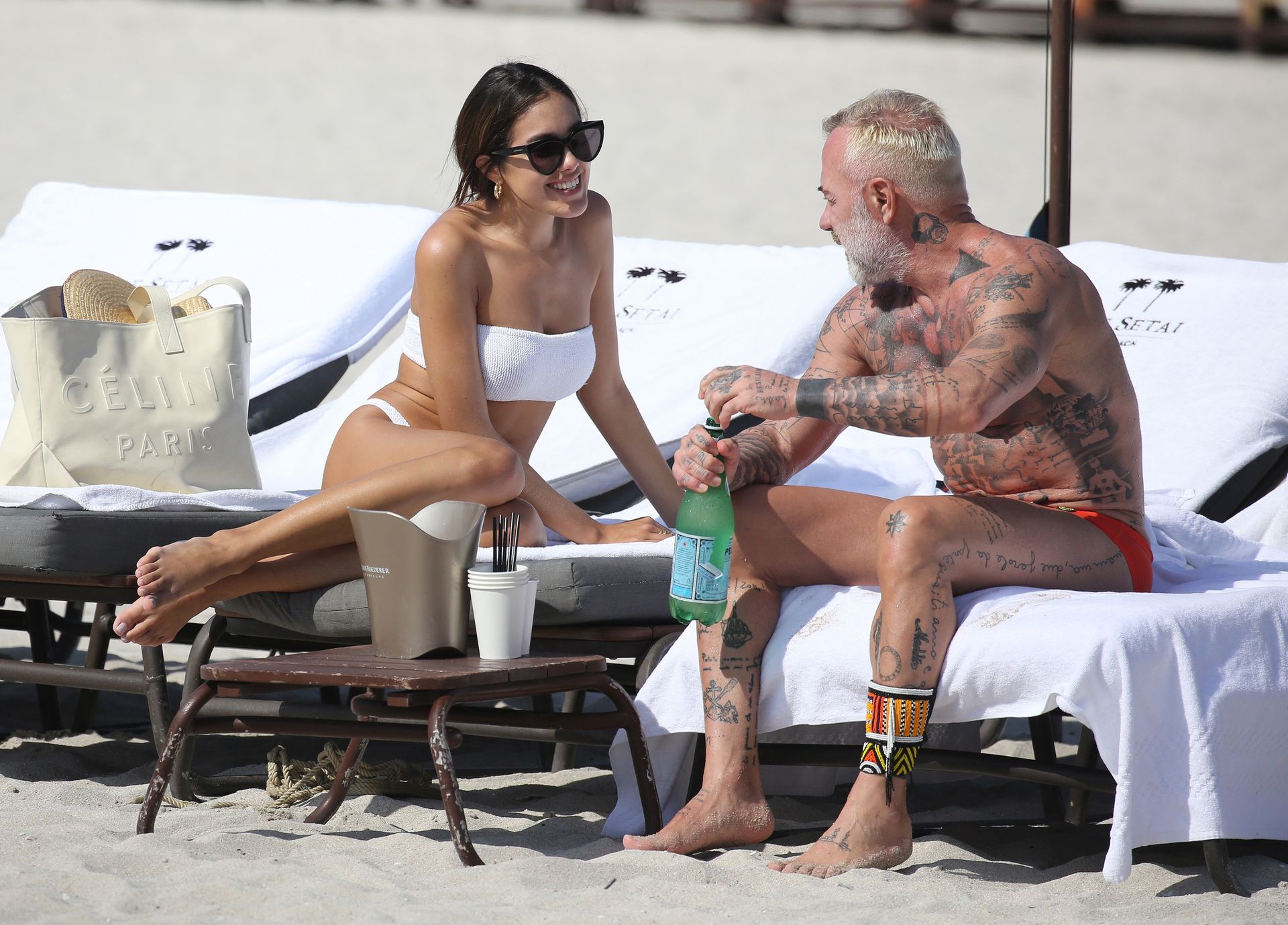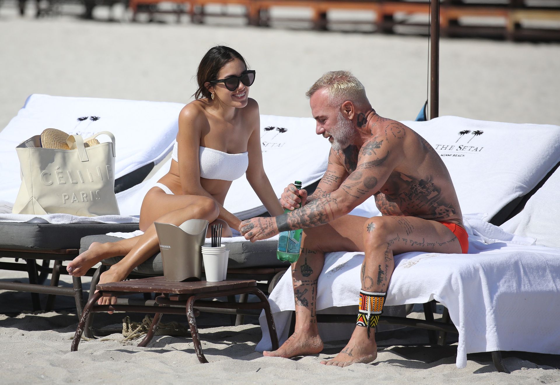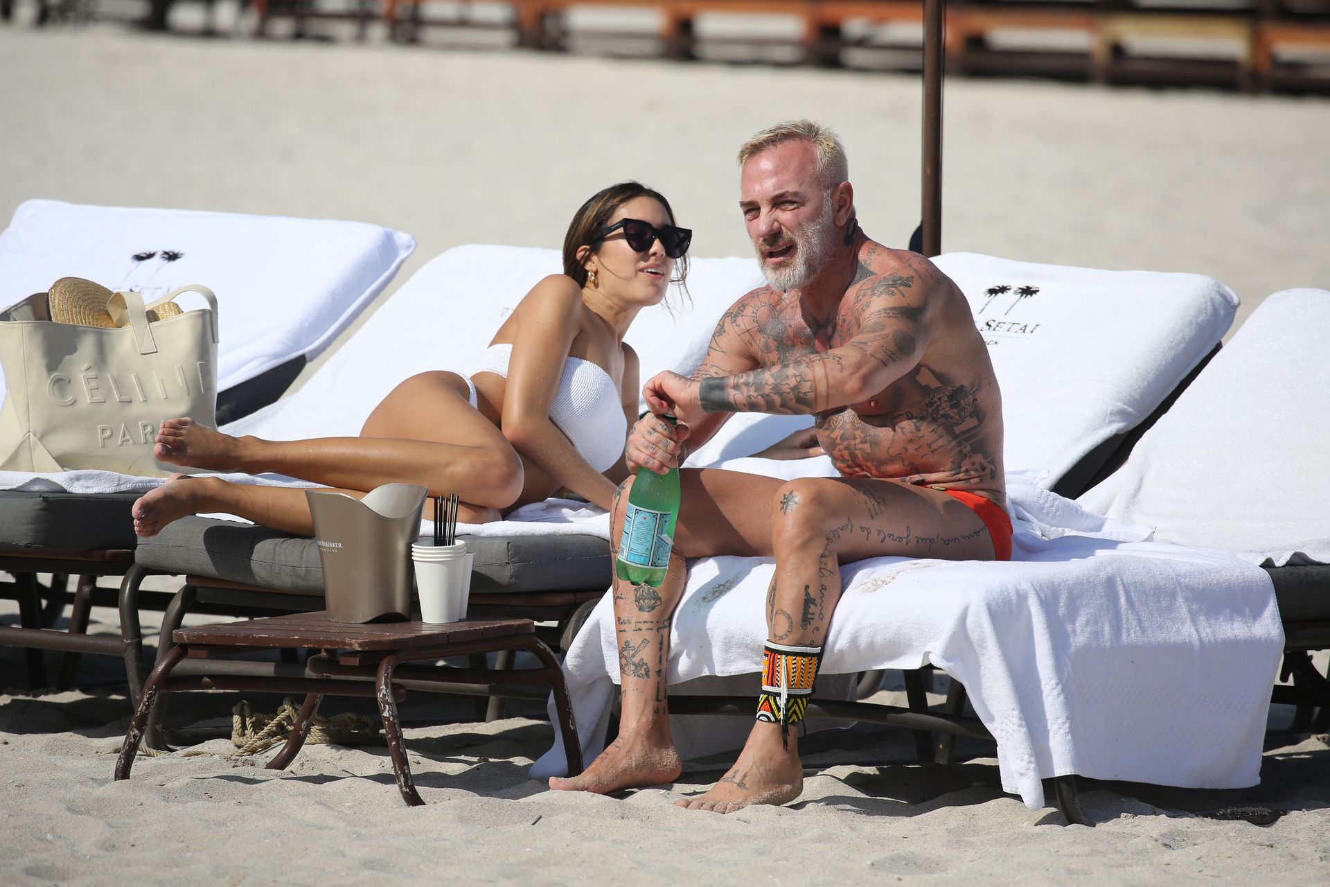 Italian DJ Gianluca Vacchi shows off his tattoos in a tiny speedo during vacation with Sharon Fonseca on the beach in Miami, 02/11/2020.
