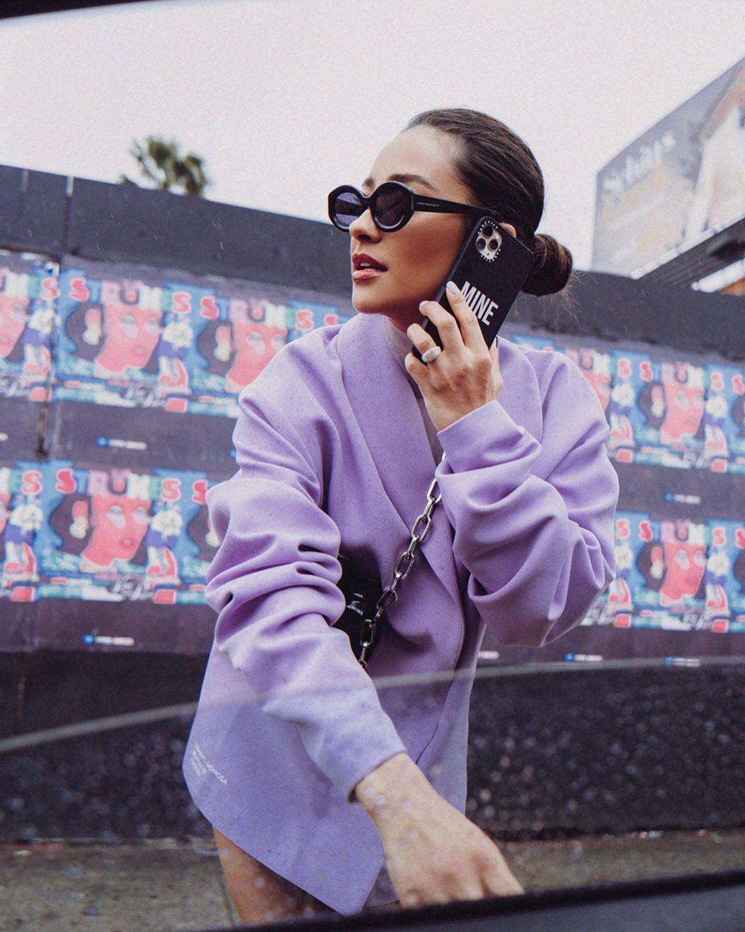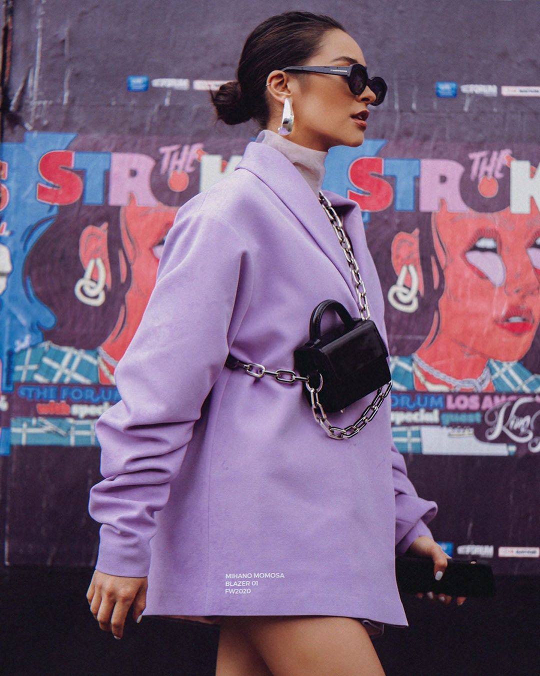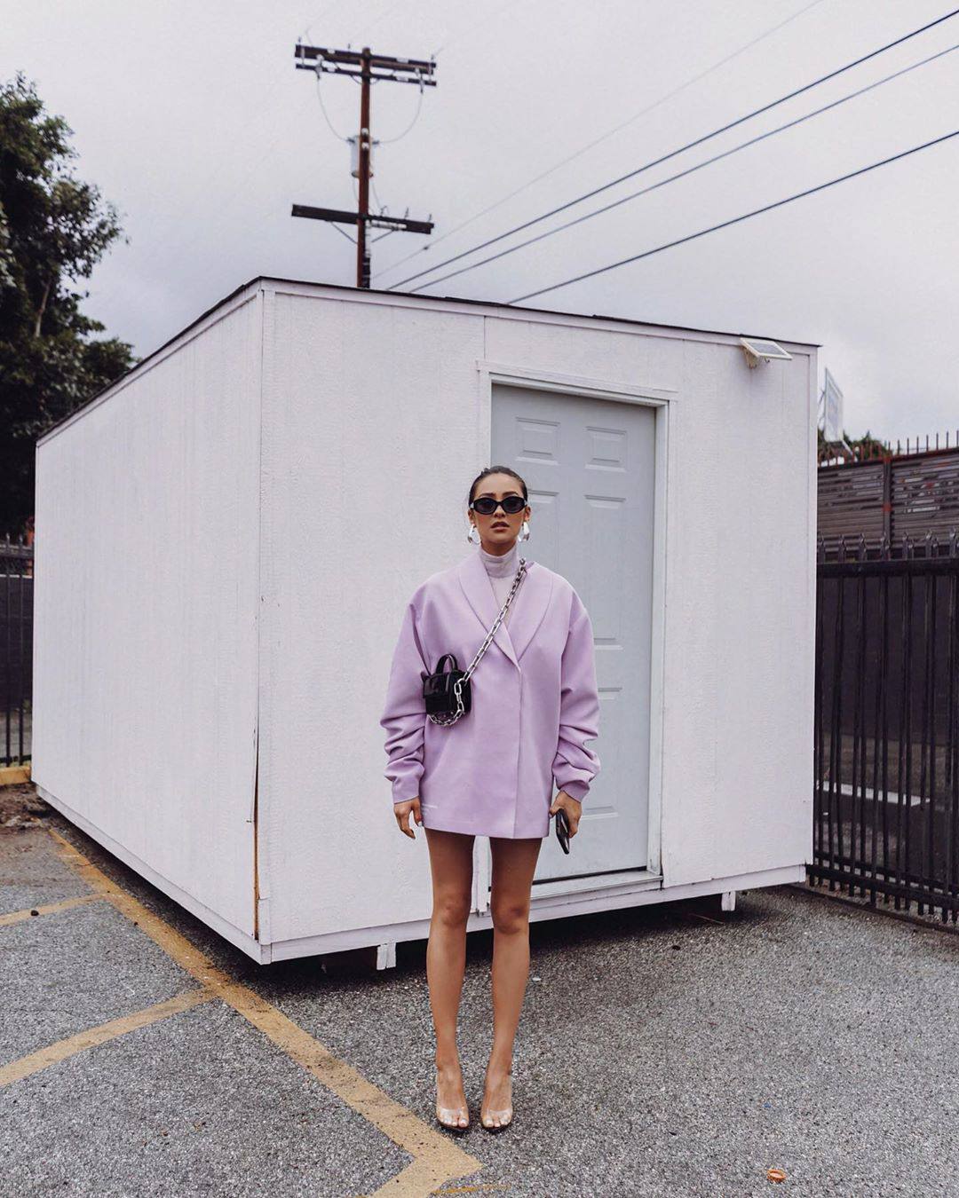 Shay Mitchell show off her beautiful legs wearing high heels and purple jacket in sexy photoshoot.