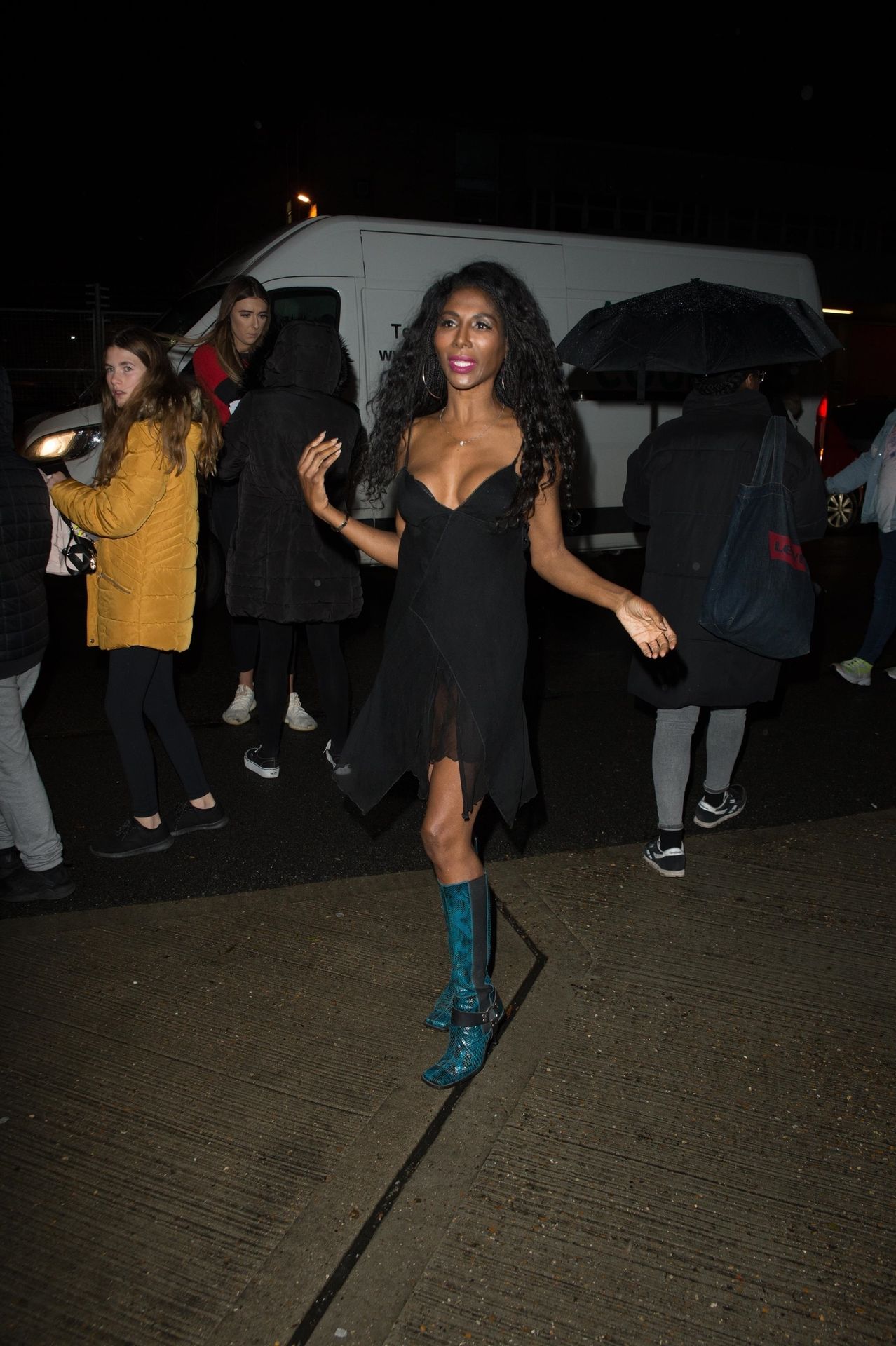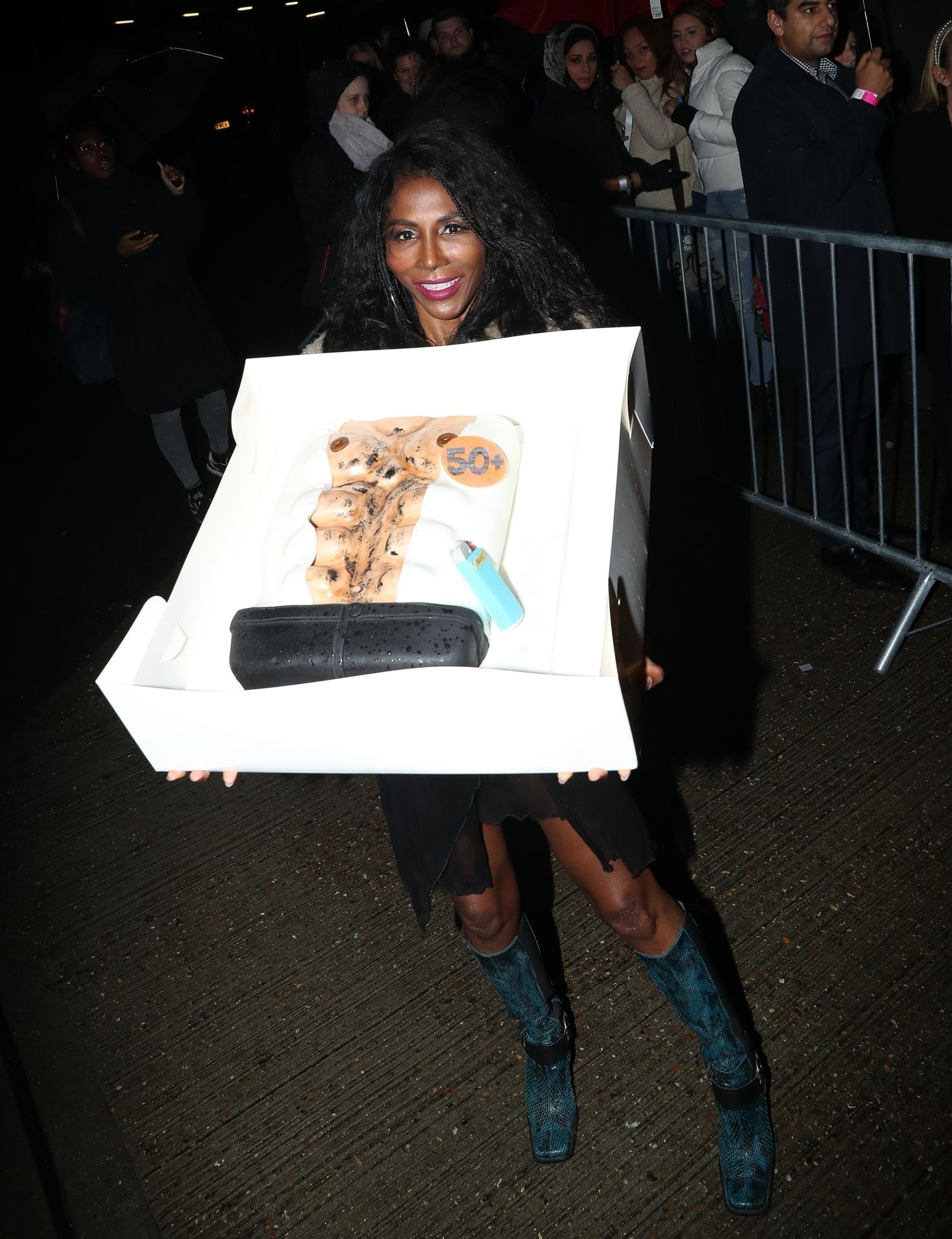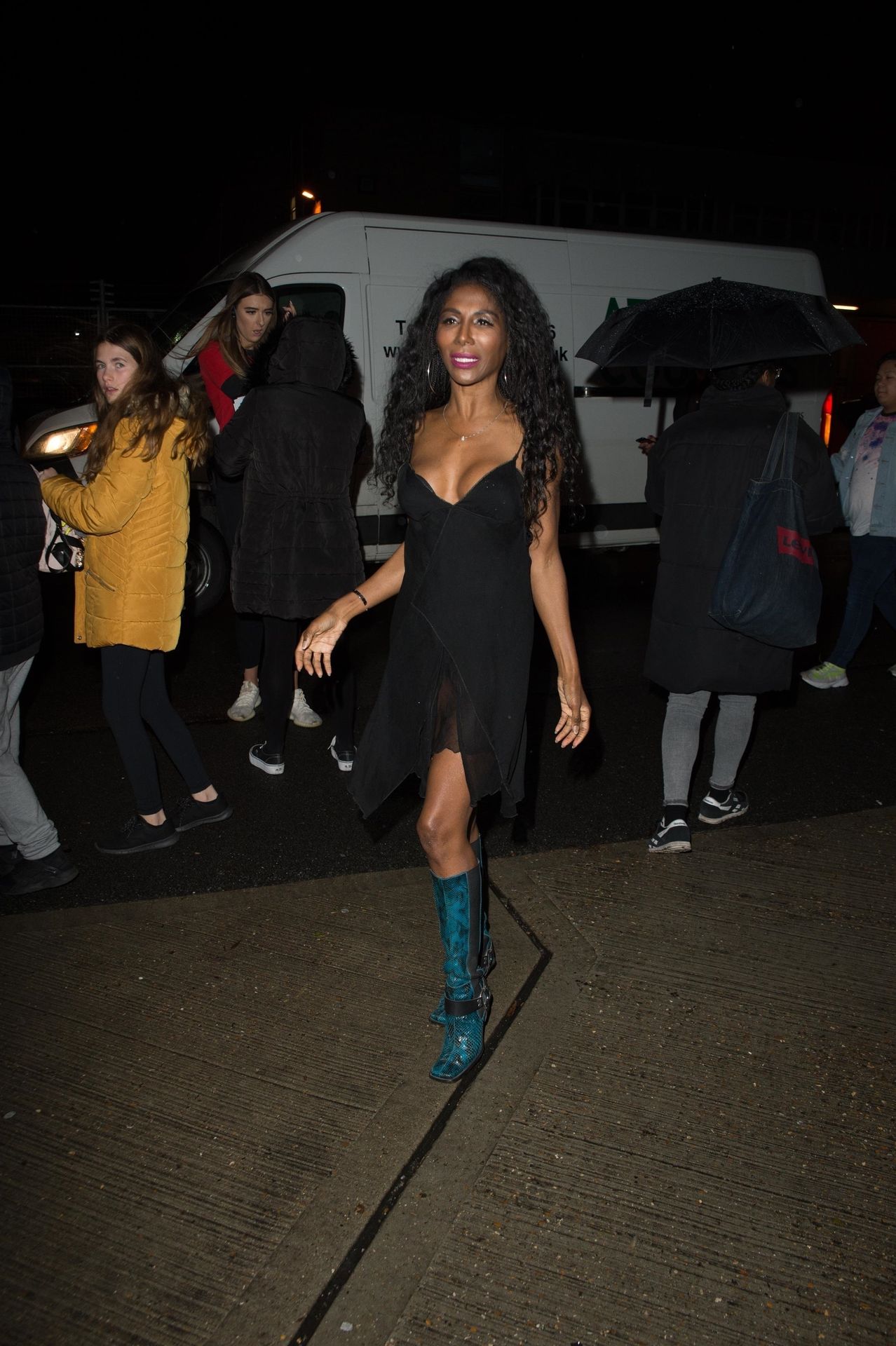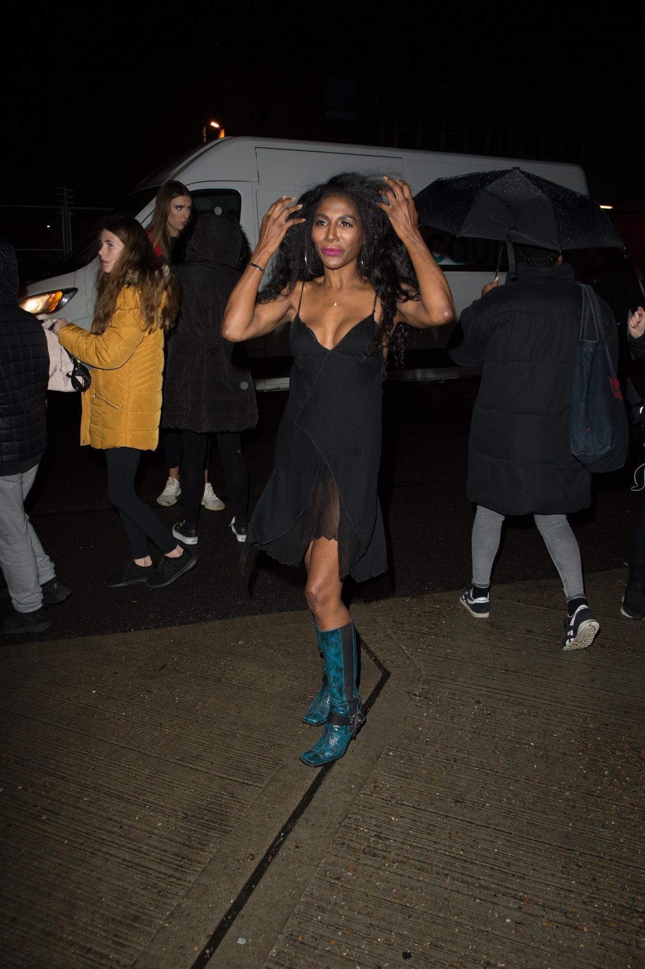 Singer Sinitta wears a little black dress without a bra as she delivers Simon Cowell’s Birthday Cake at X Factor studios in London, 11/02/2019.