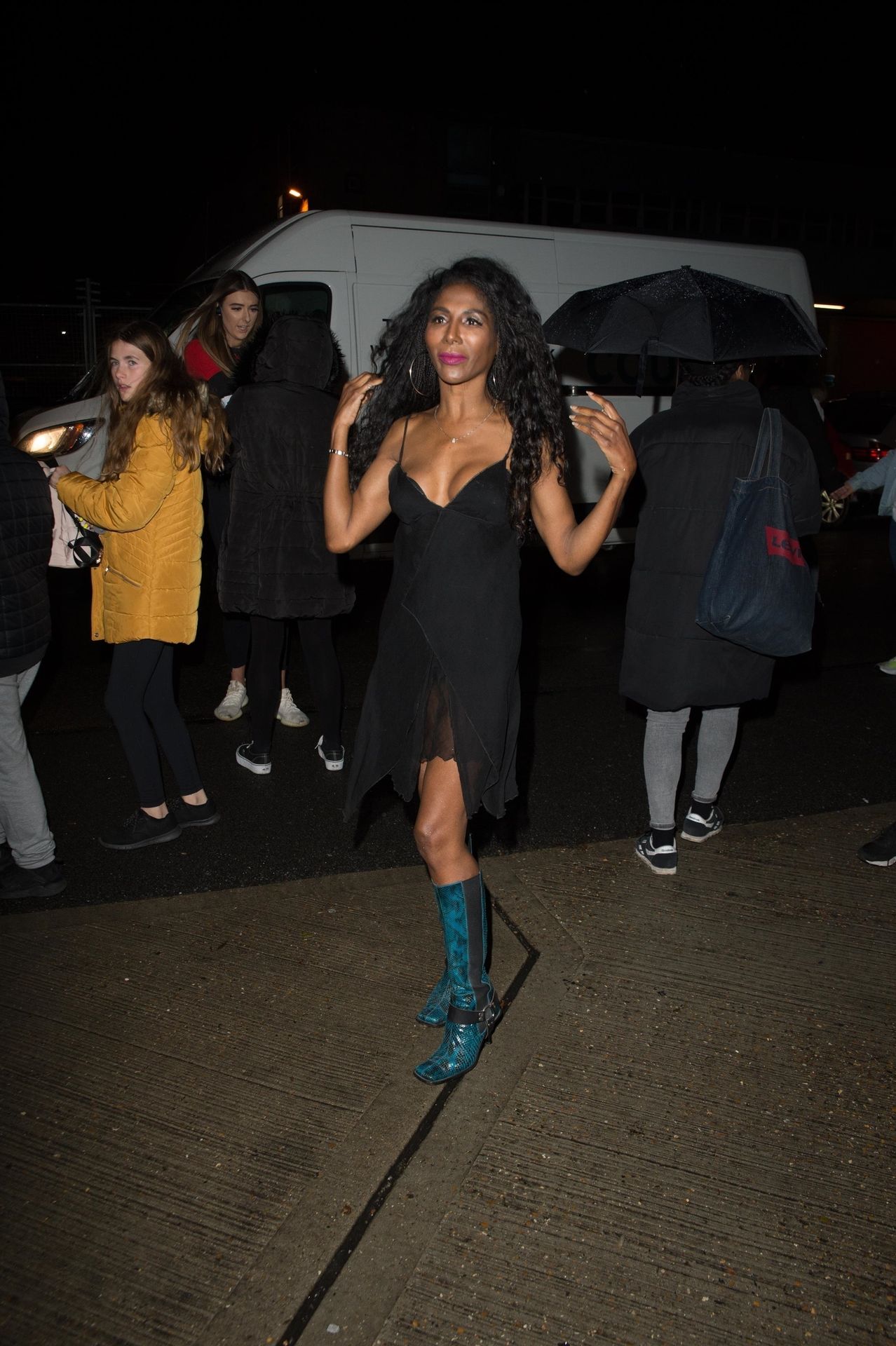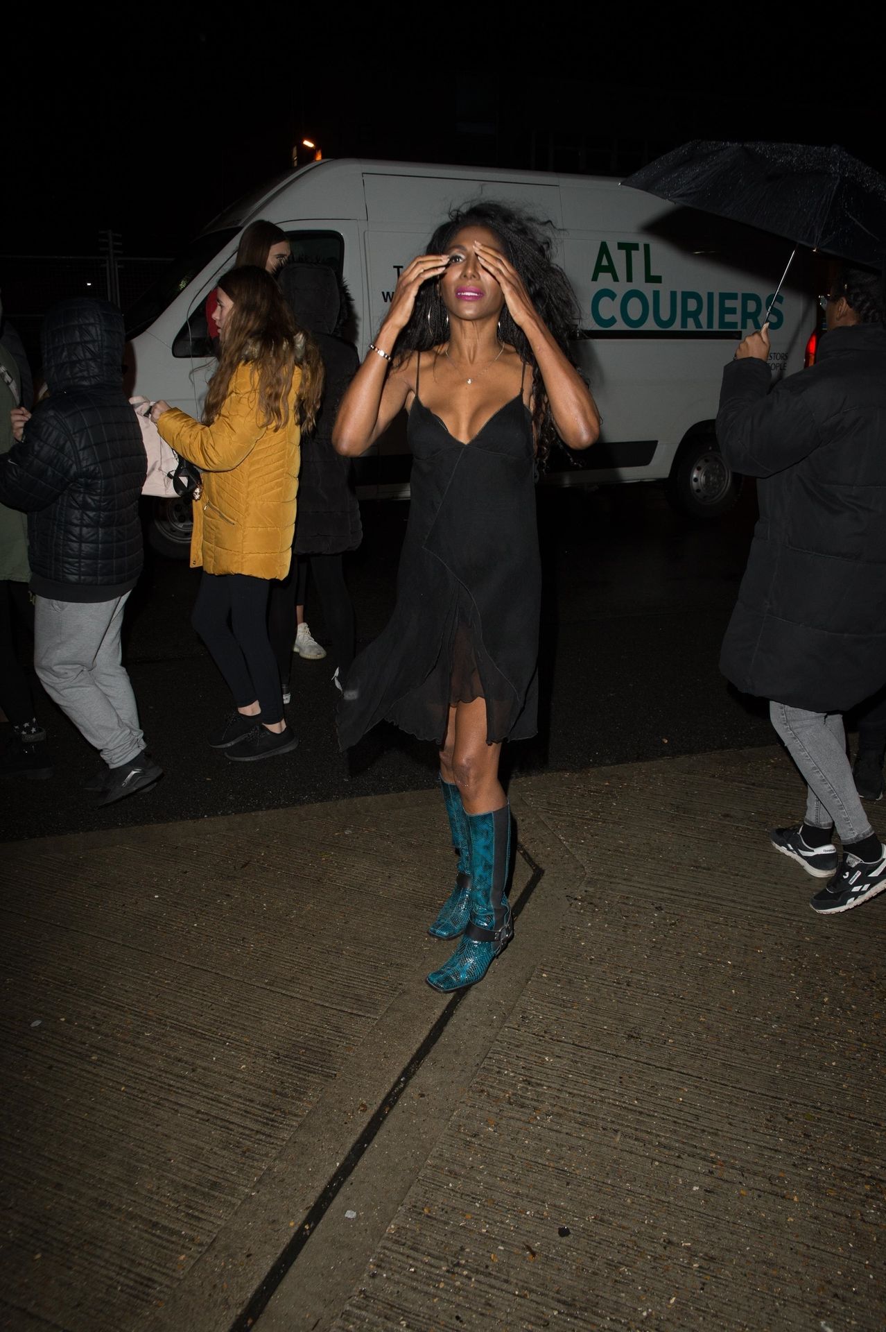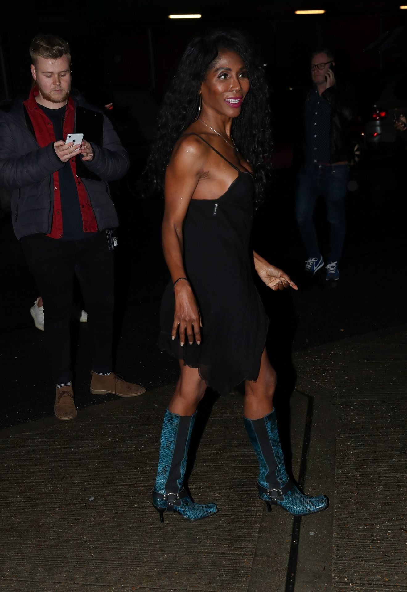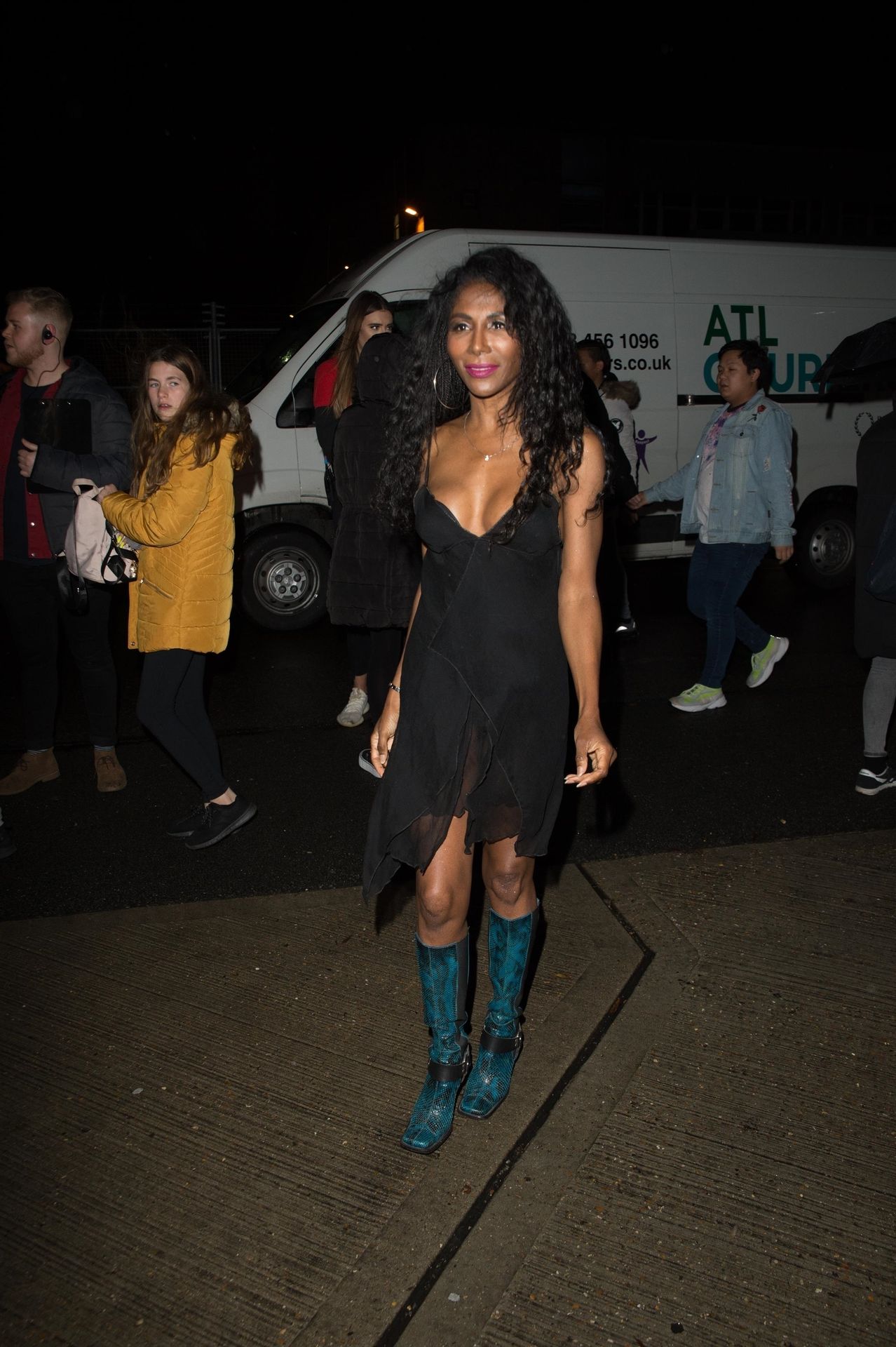 Singer Sinitta wears a little black dress without a bra as she delivers Simon Cowell’s Birthday Cake at X Factor studios in London, 11/02/2019.