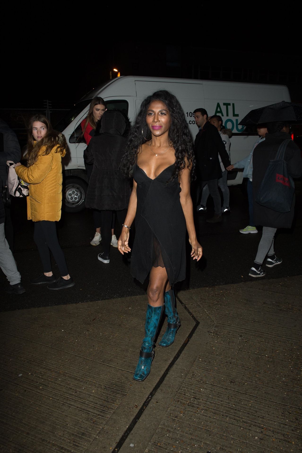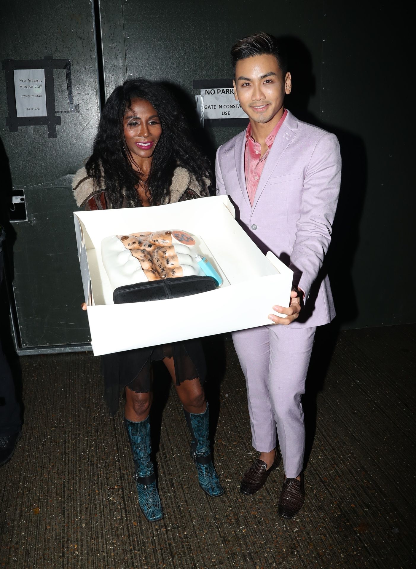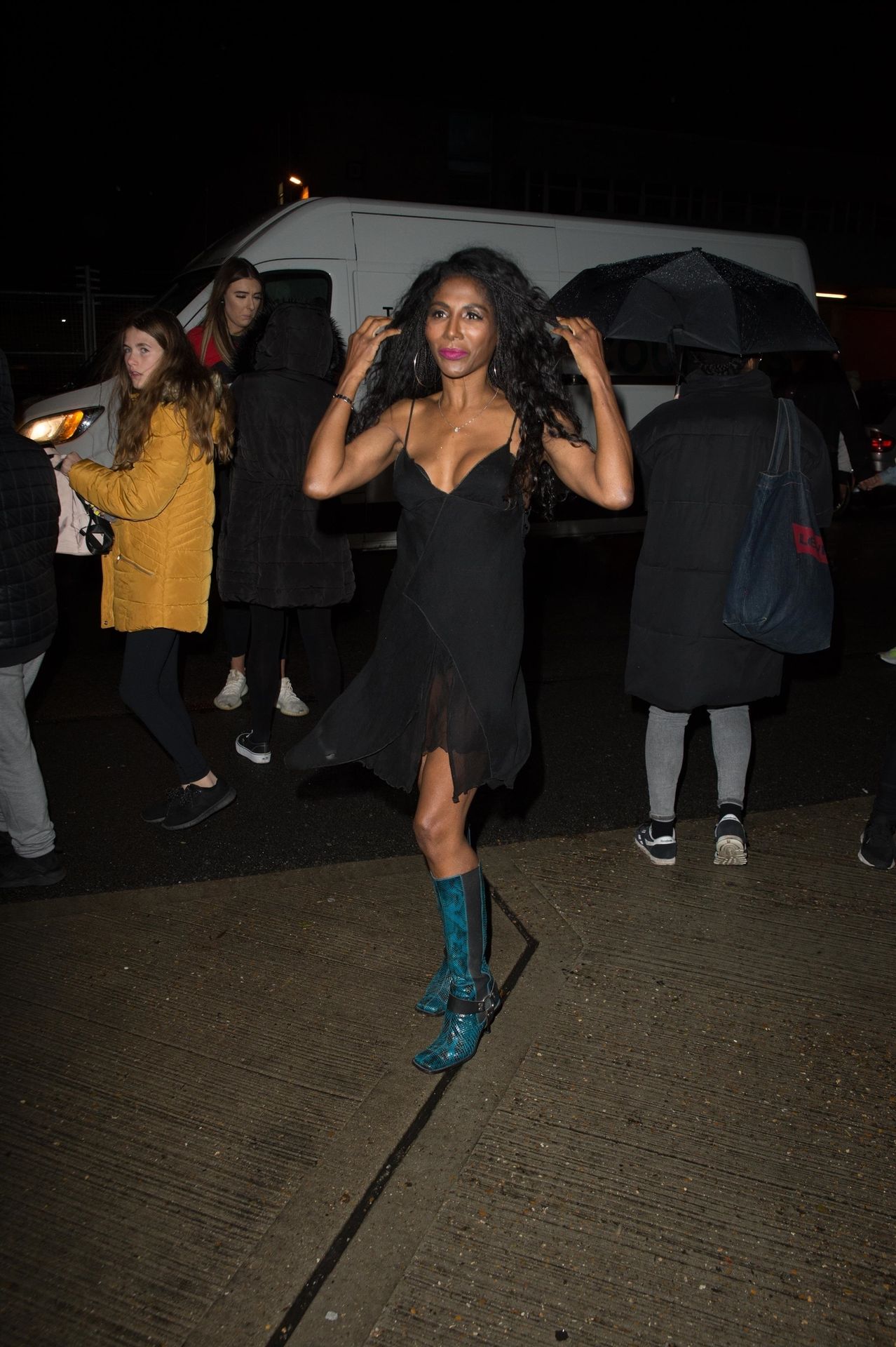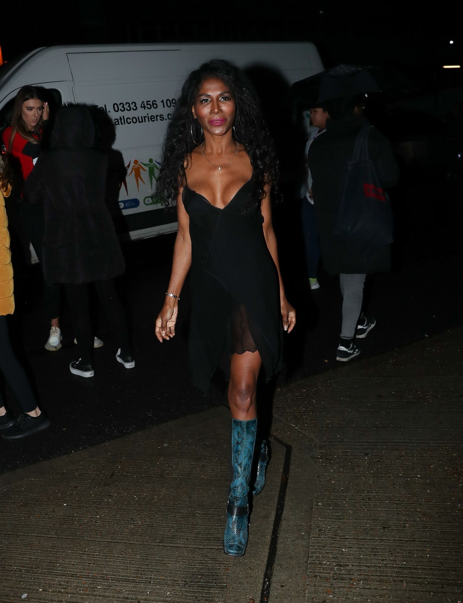 Singer Sinitta wears a little black dress without a bra as she delivers Simon Cowell’s Birthday Cake at X Factor studios in London, 11/02/2019.