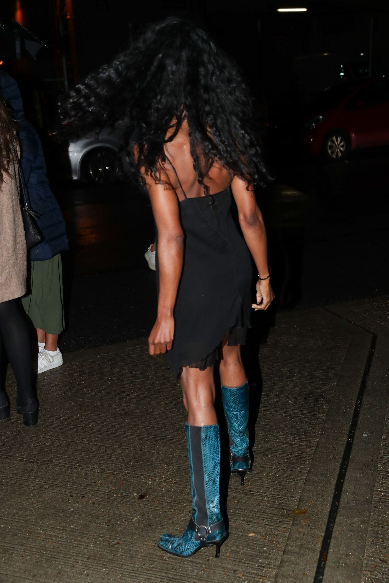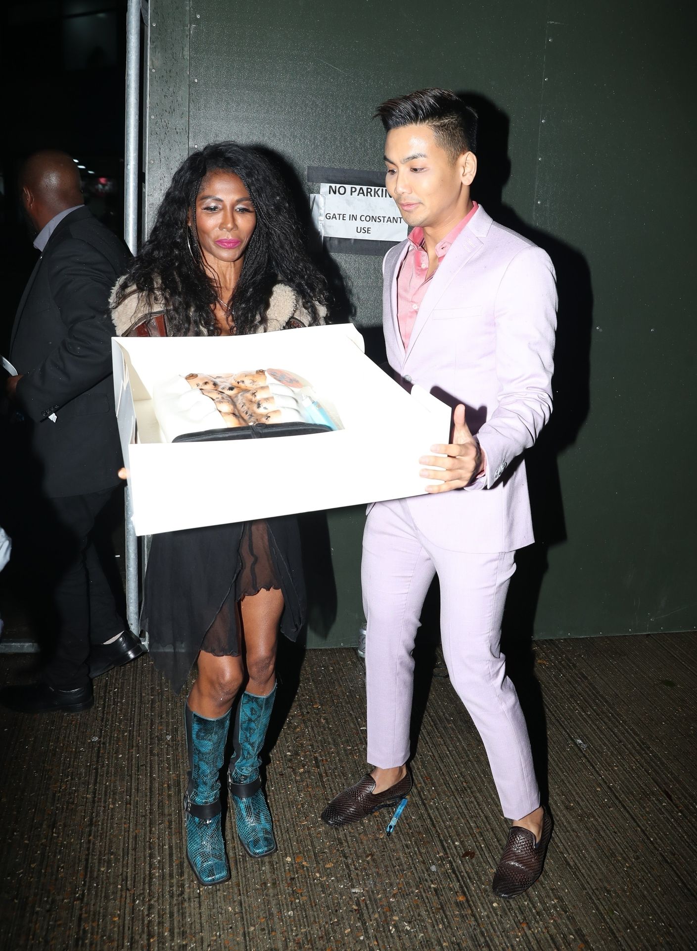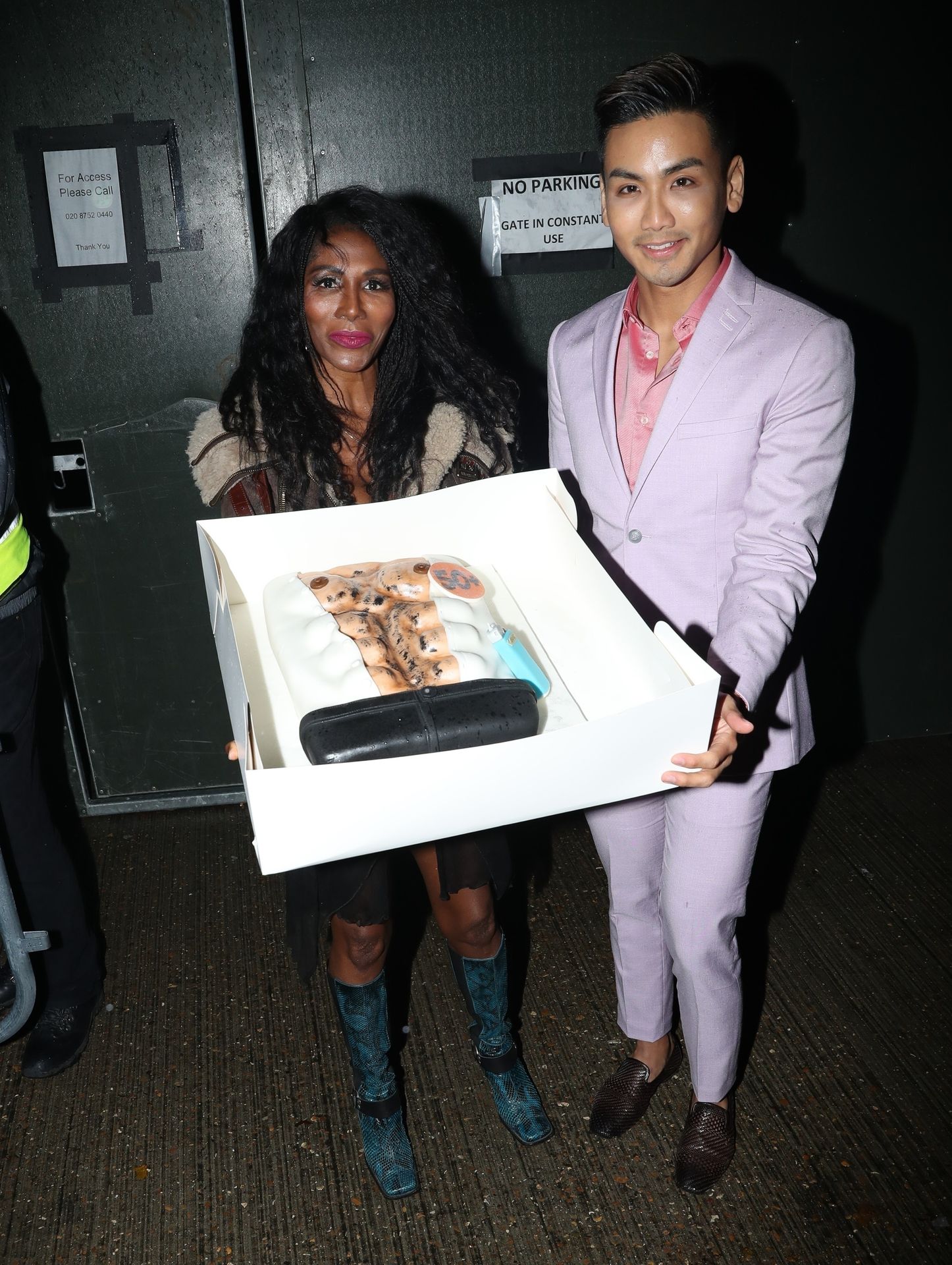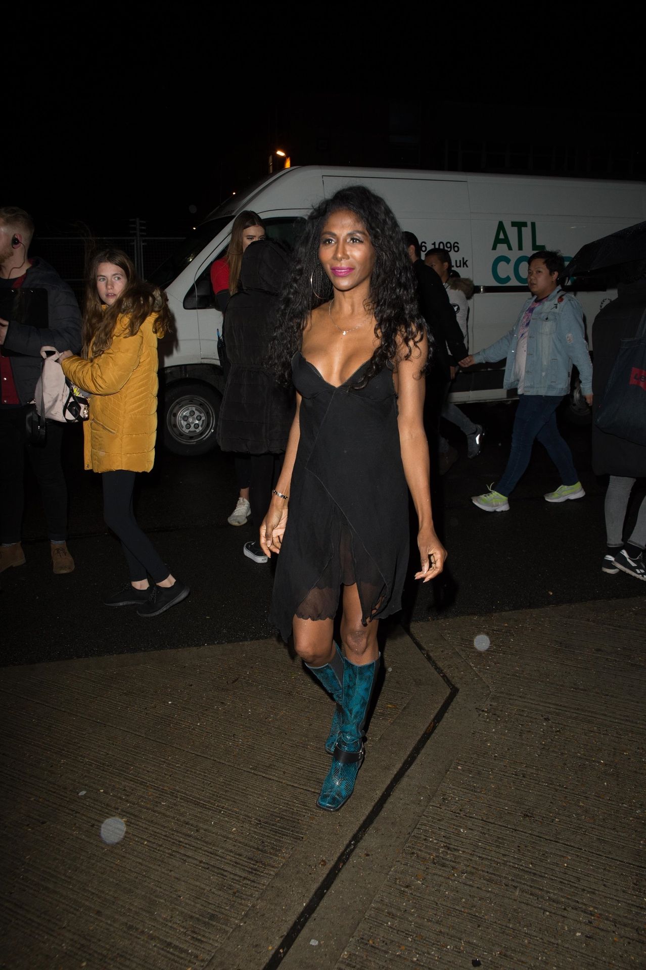 Singer Sinitta wears a little black dress without a bra as she delivers Simon Cowell’s Birthday Cake at X Factor studios in London, 11/02/2019.