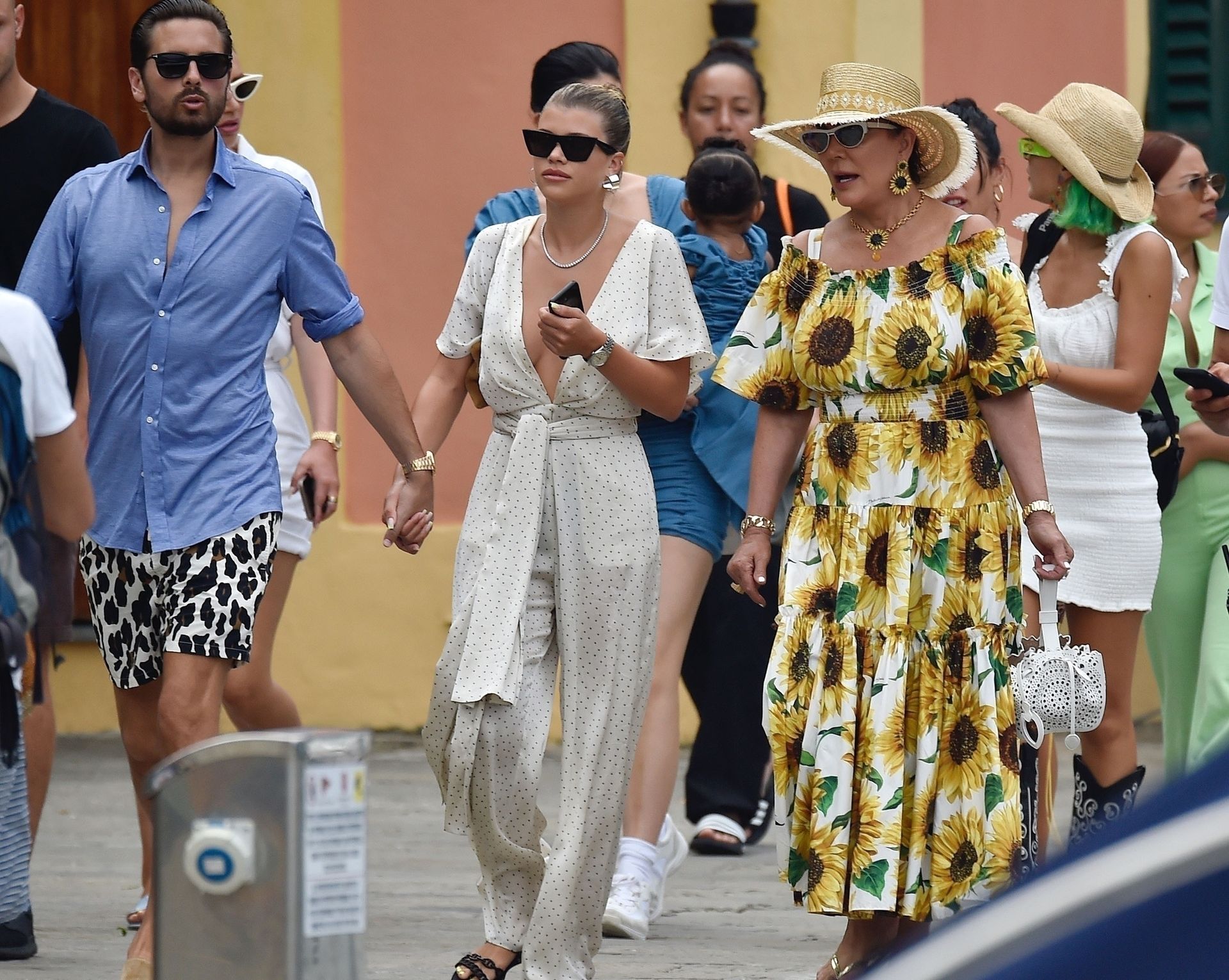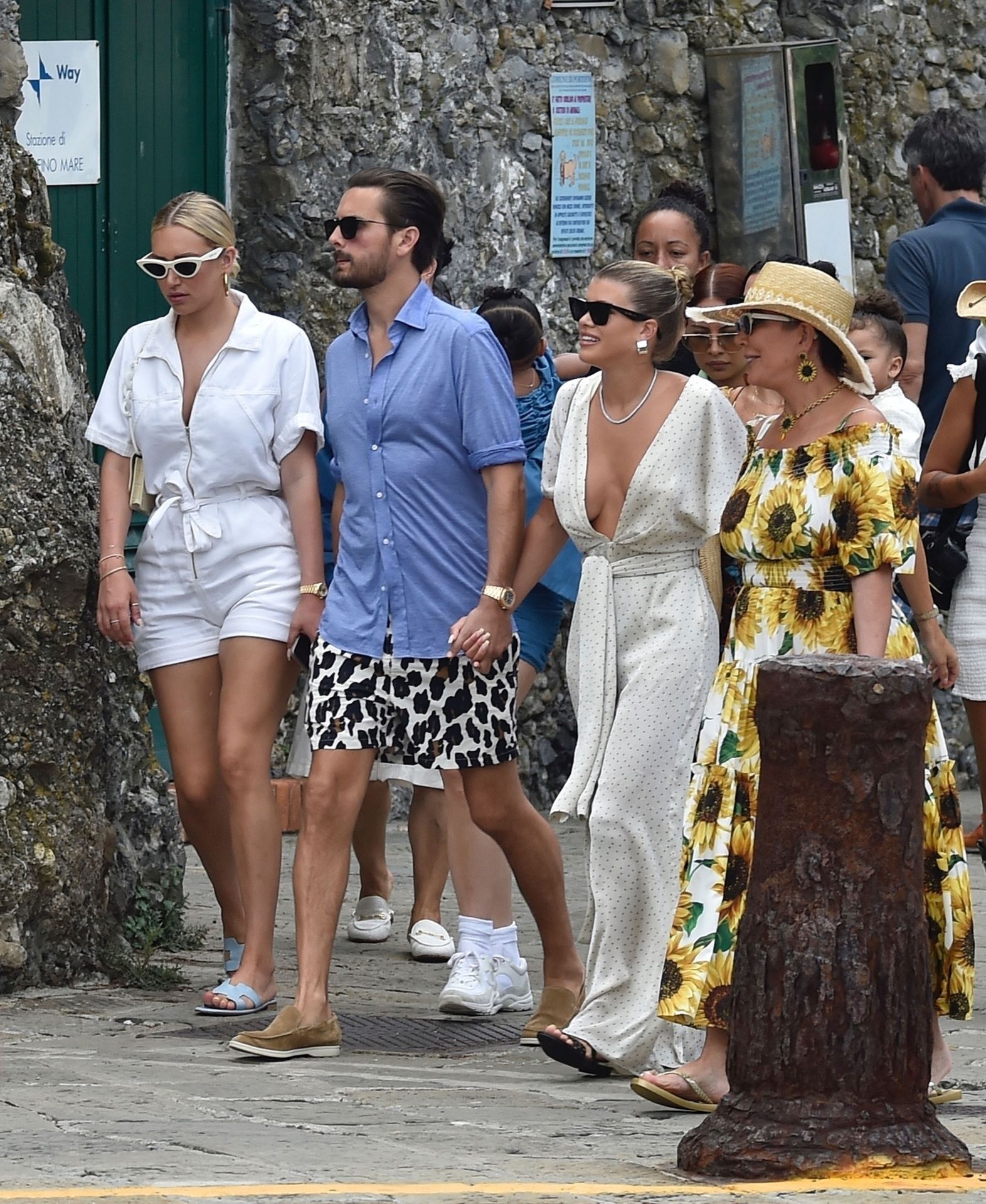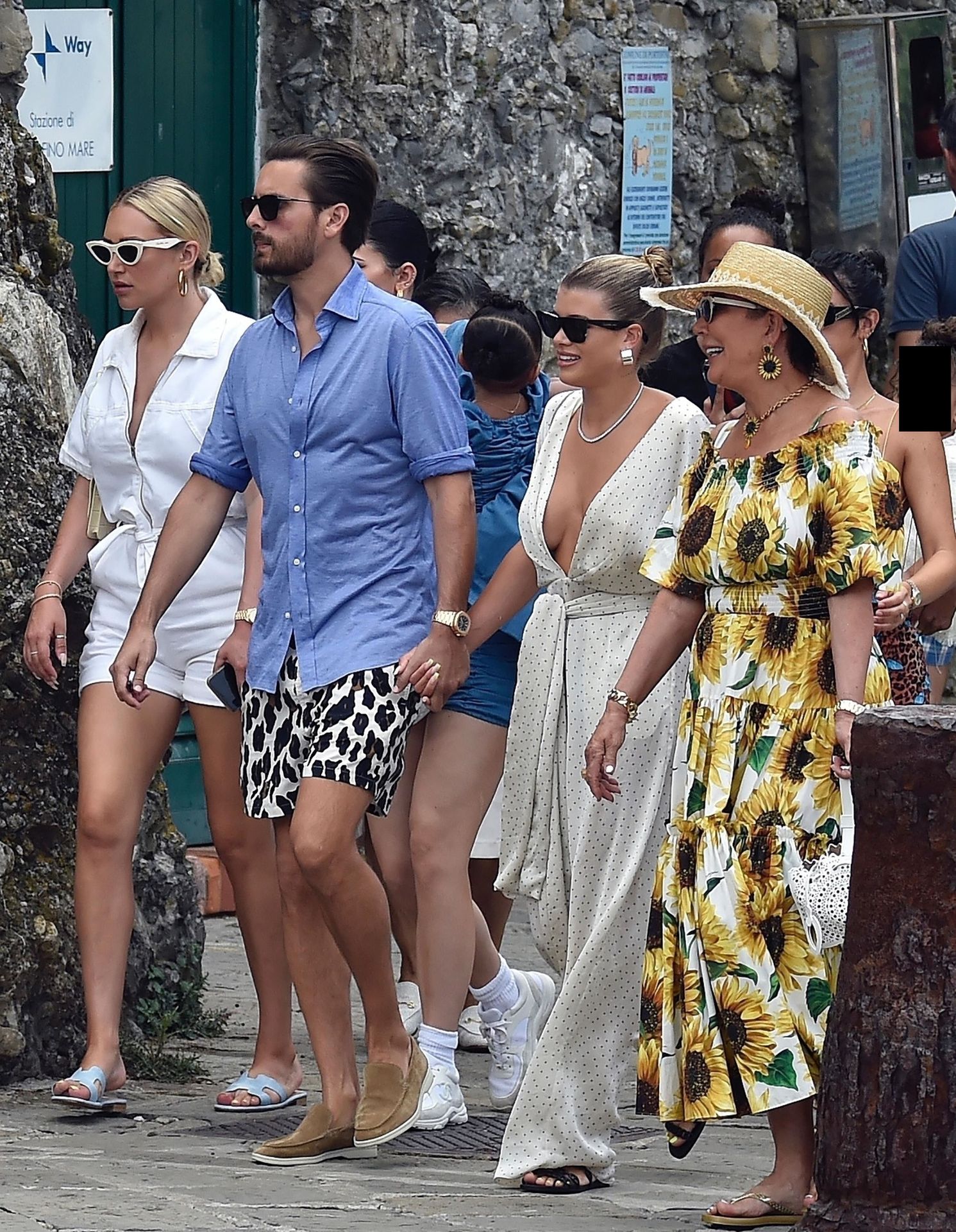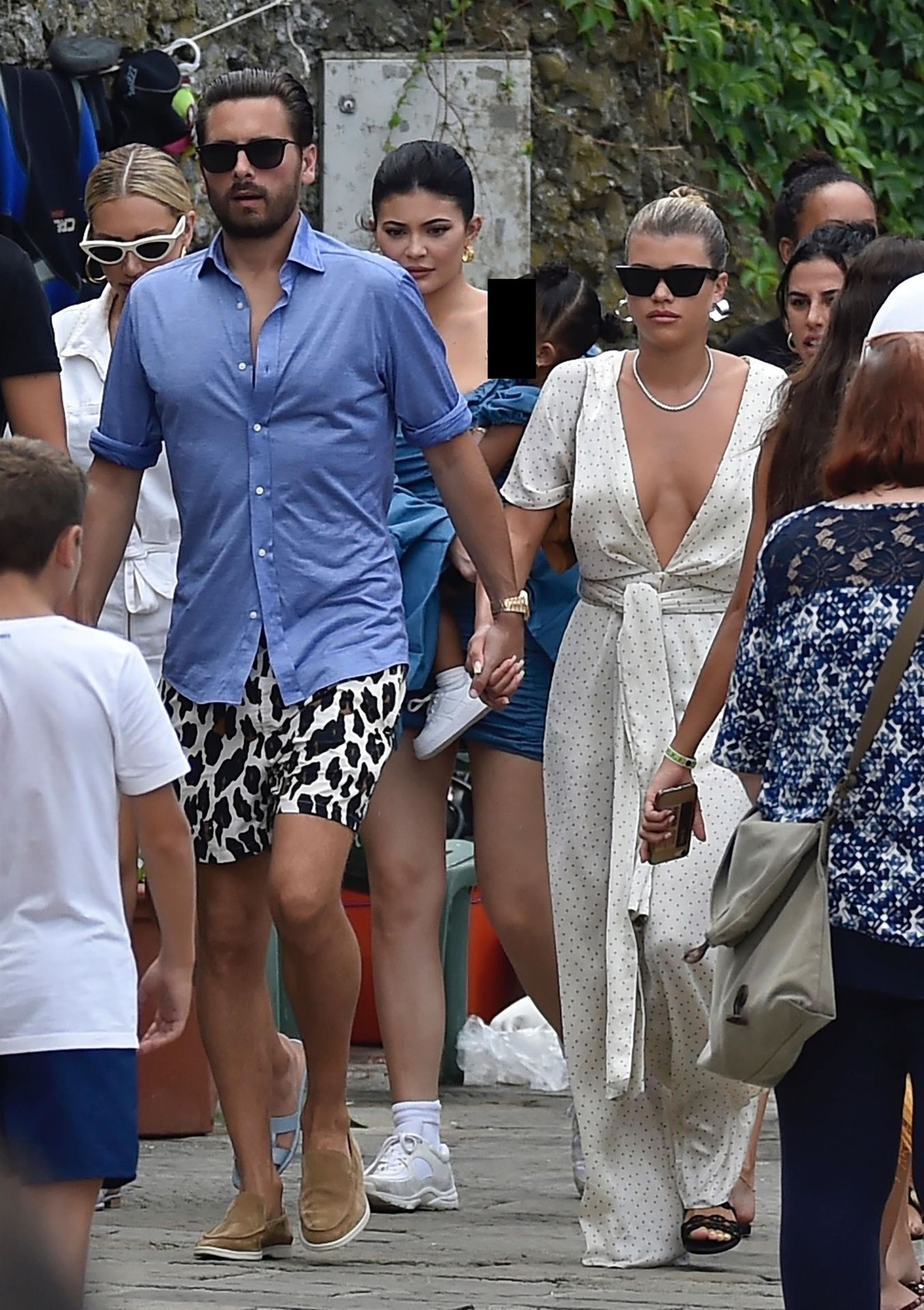 Lovebirds Scott Disick and Sofia Richie take in the sights with Kris and Kylie Jenner and her adorable daughter Stormy. The gang arrive at shore via a dinghy ride and stroll through the coastal town of Portofino turning a few heads with a variety of striking outfits as they go shopping looking rather glammed up on their Italian break.
