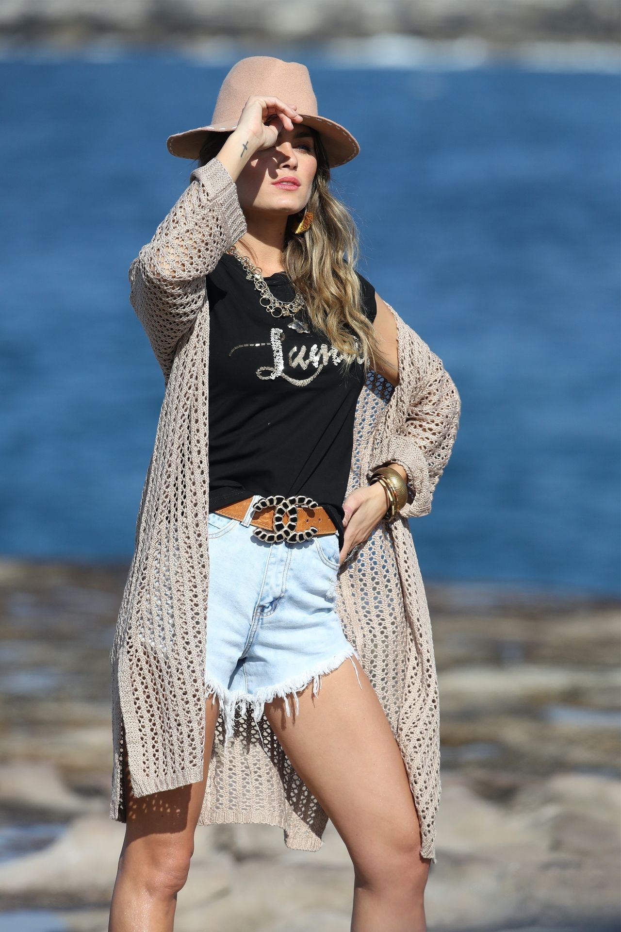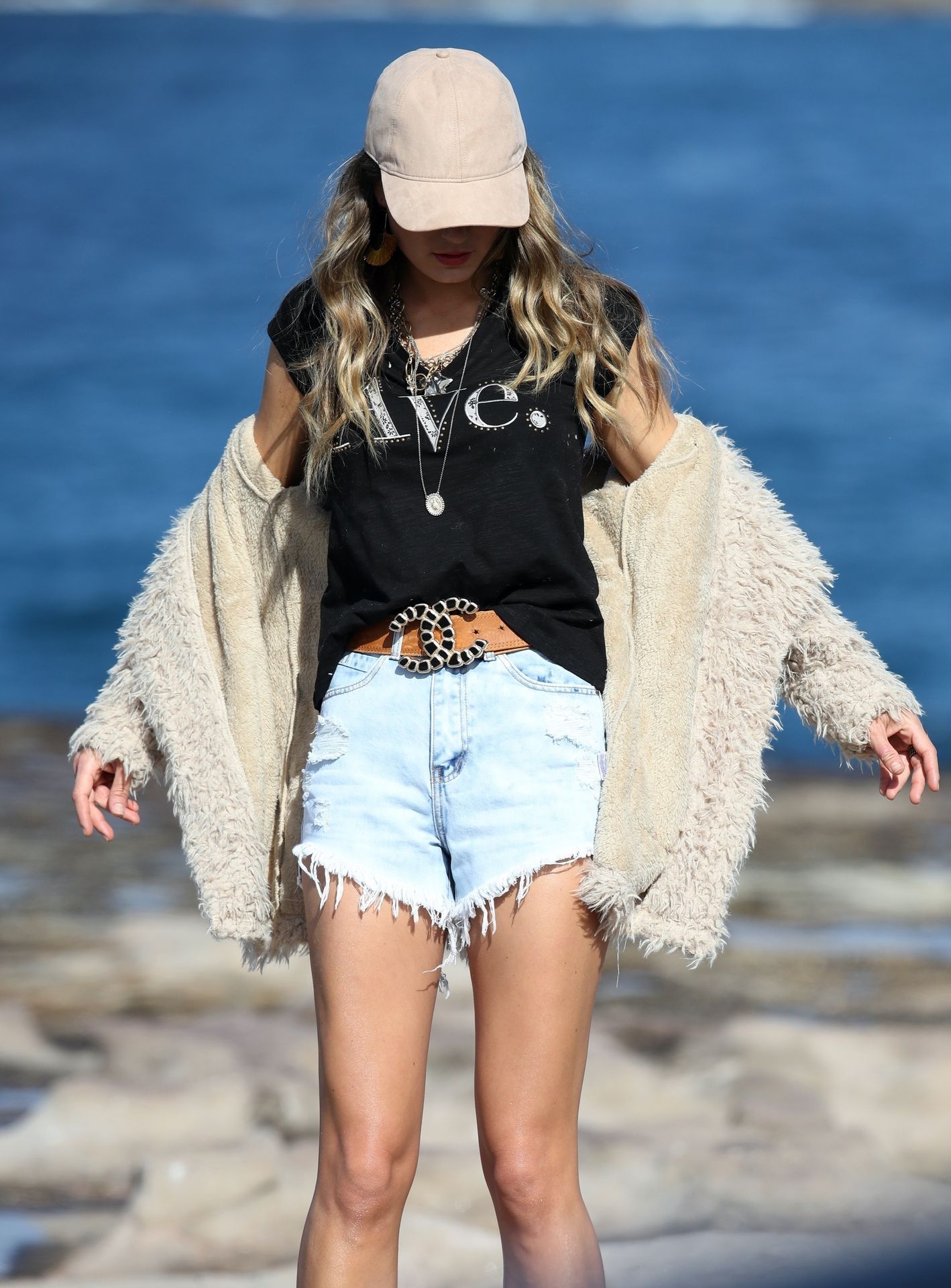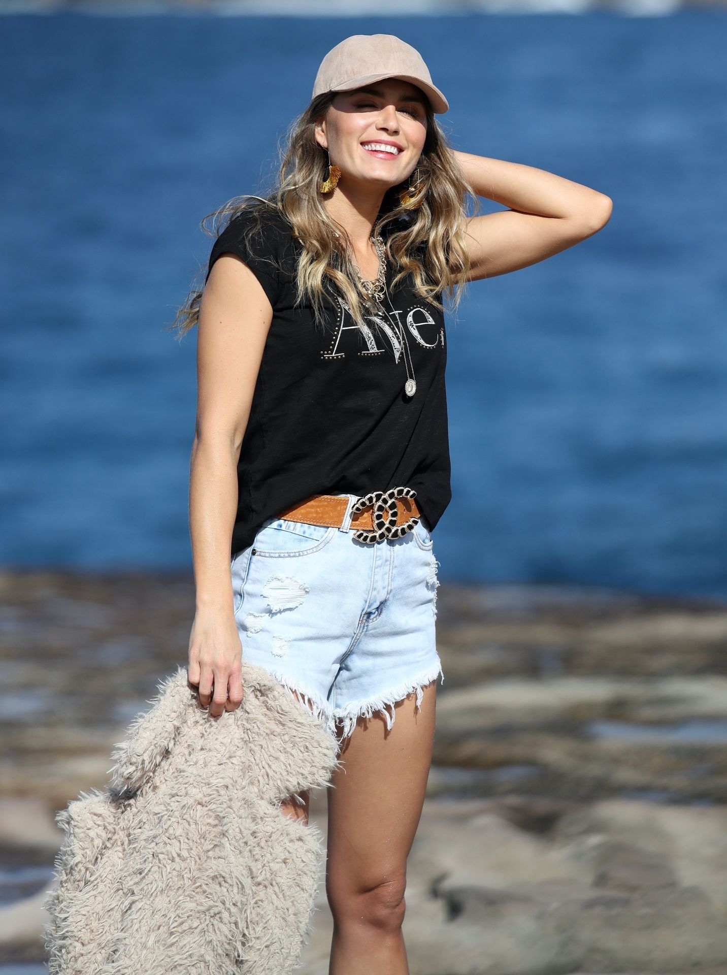Cheeky model behavior! Model Stephanie Claire Smith shows off her cheeky side while onset for a photoshoot in Sydney, 05/16/2020.