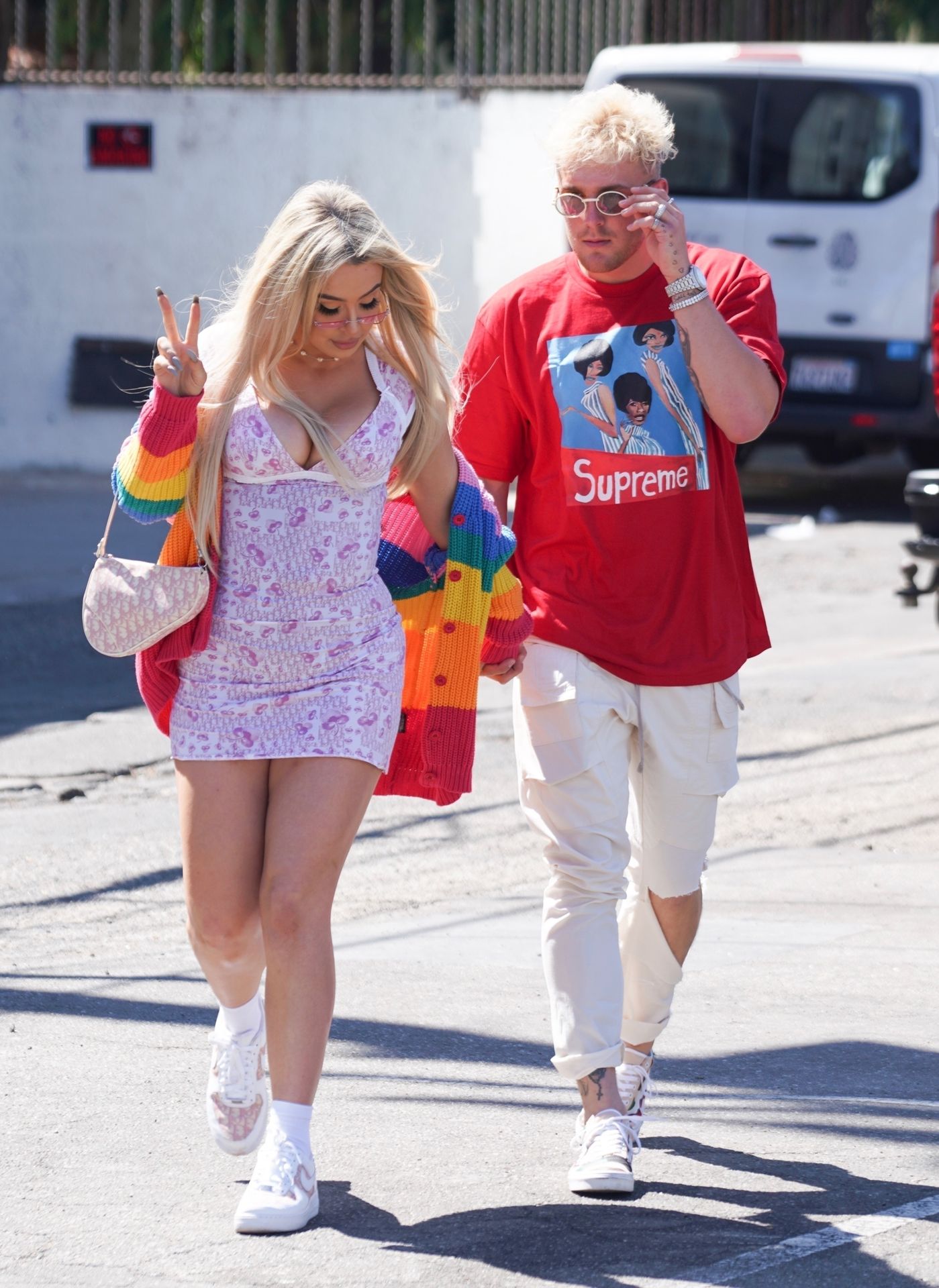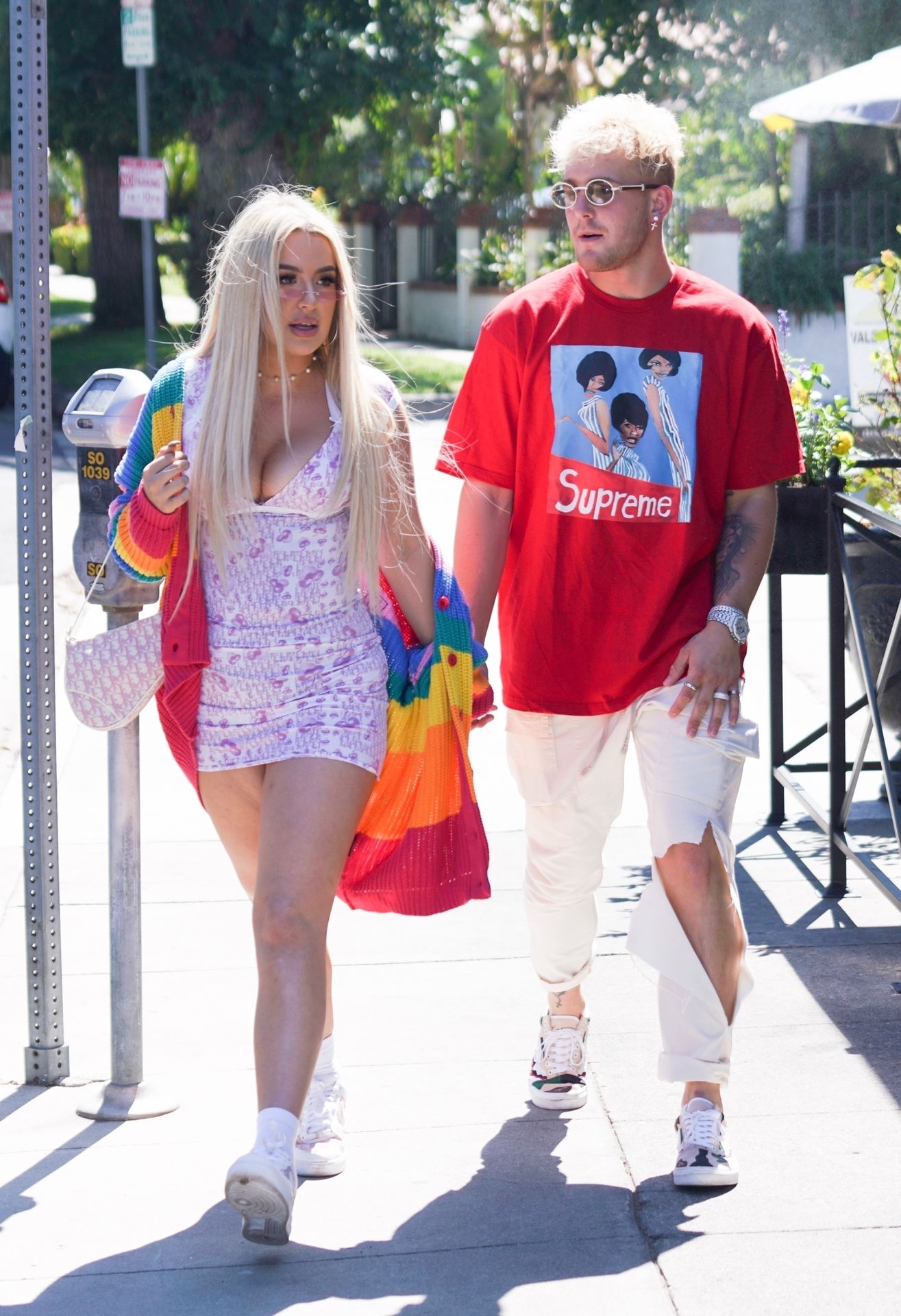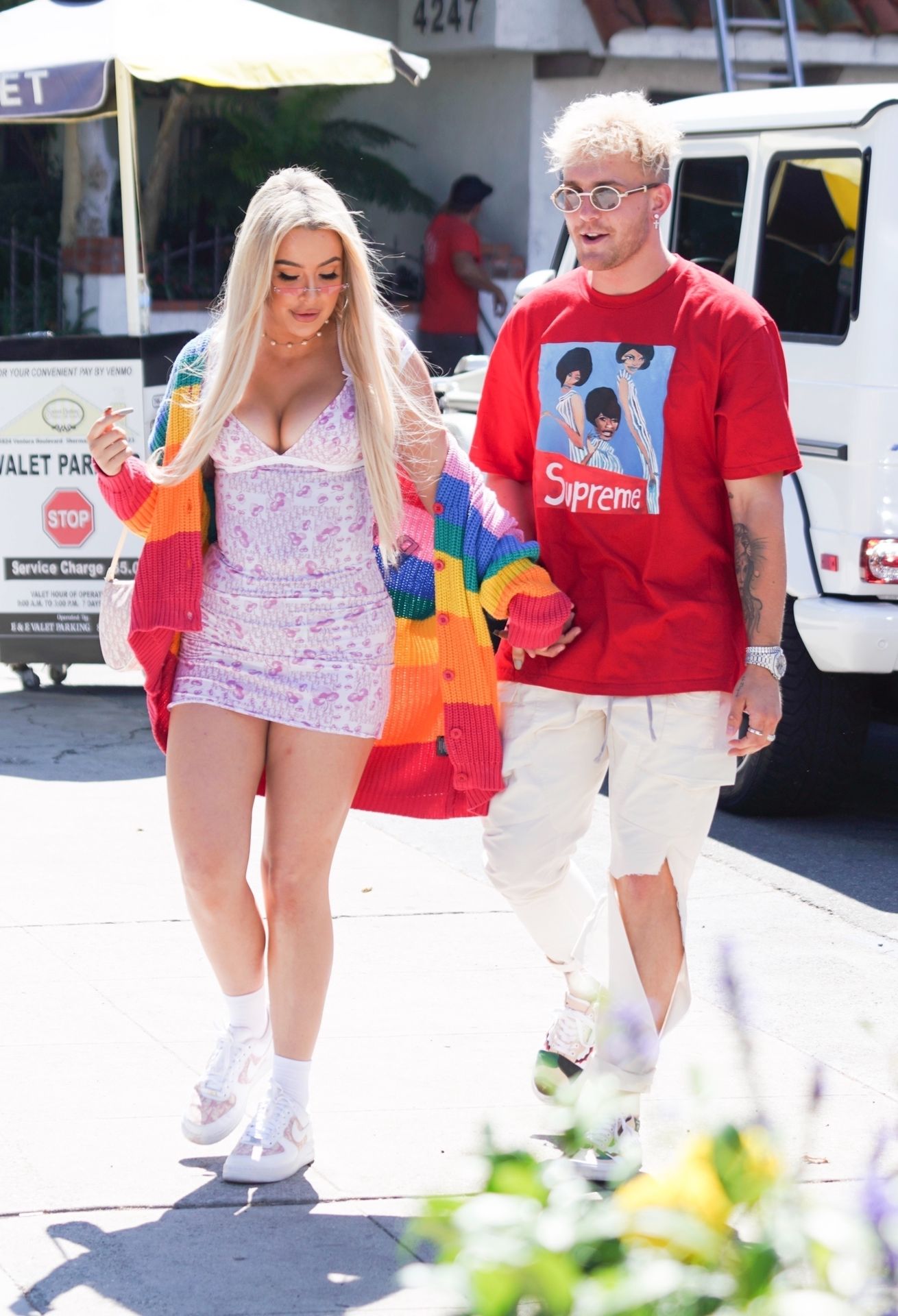 American internet personality Tana Mongeau and her Youtuber husband Jake Paul go to lunch at Sweet Butter Kitchen in Sherman Oaks, wearing colorful outfits, 09/17/2019.