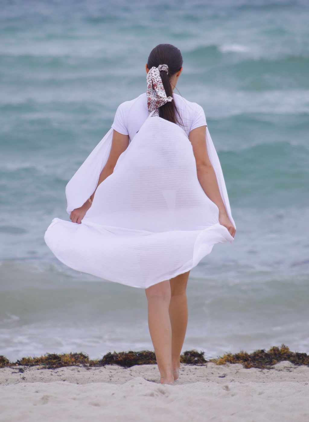 French model Tao Wickrath wears a flowing white swimsuit on Miami Beach, 07/24/2019.