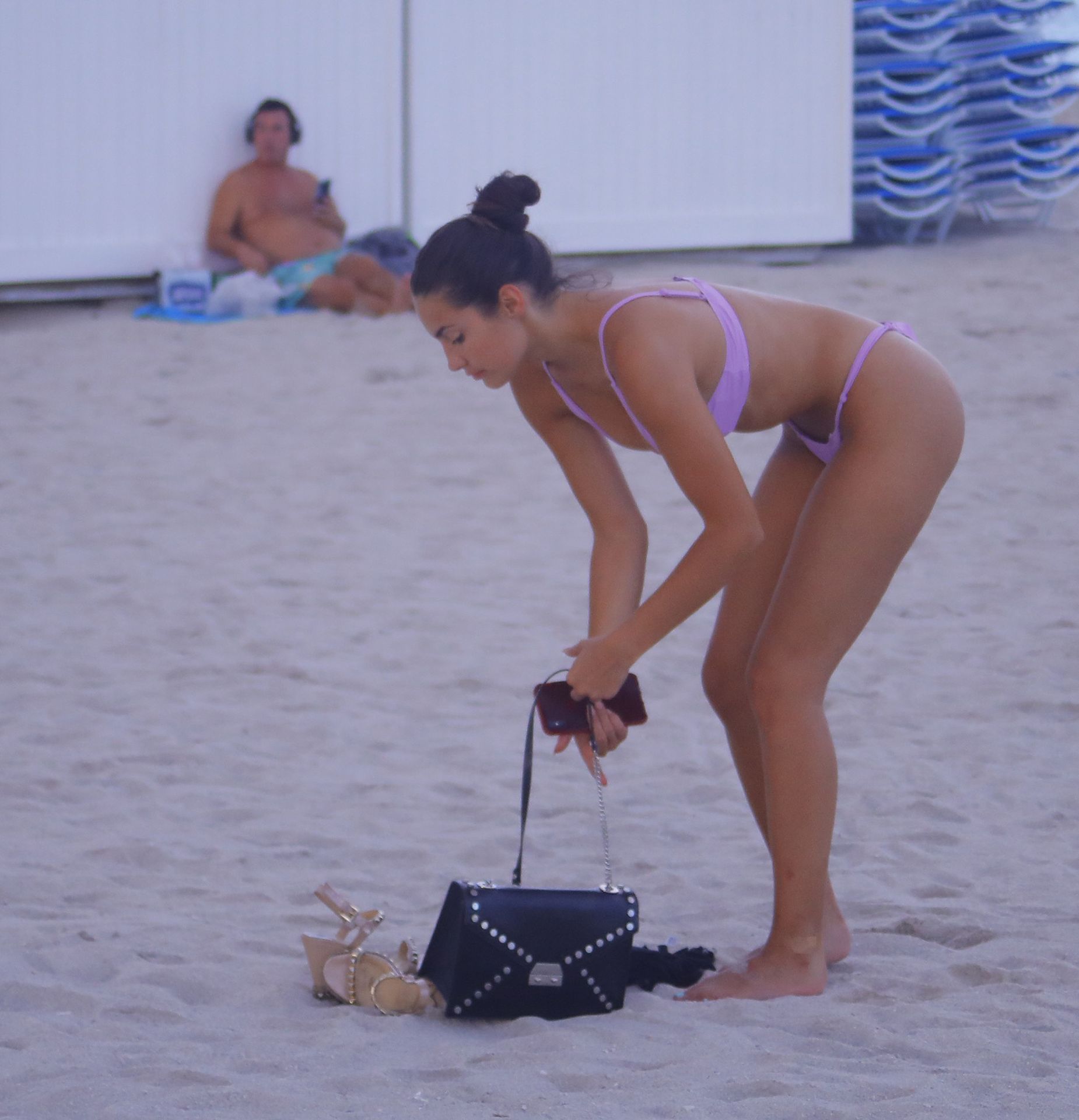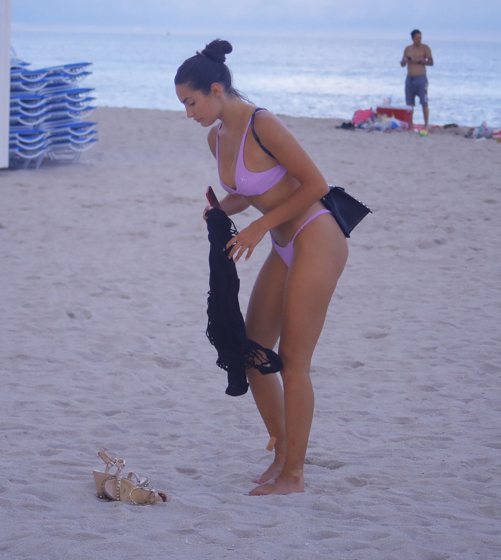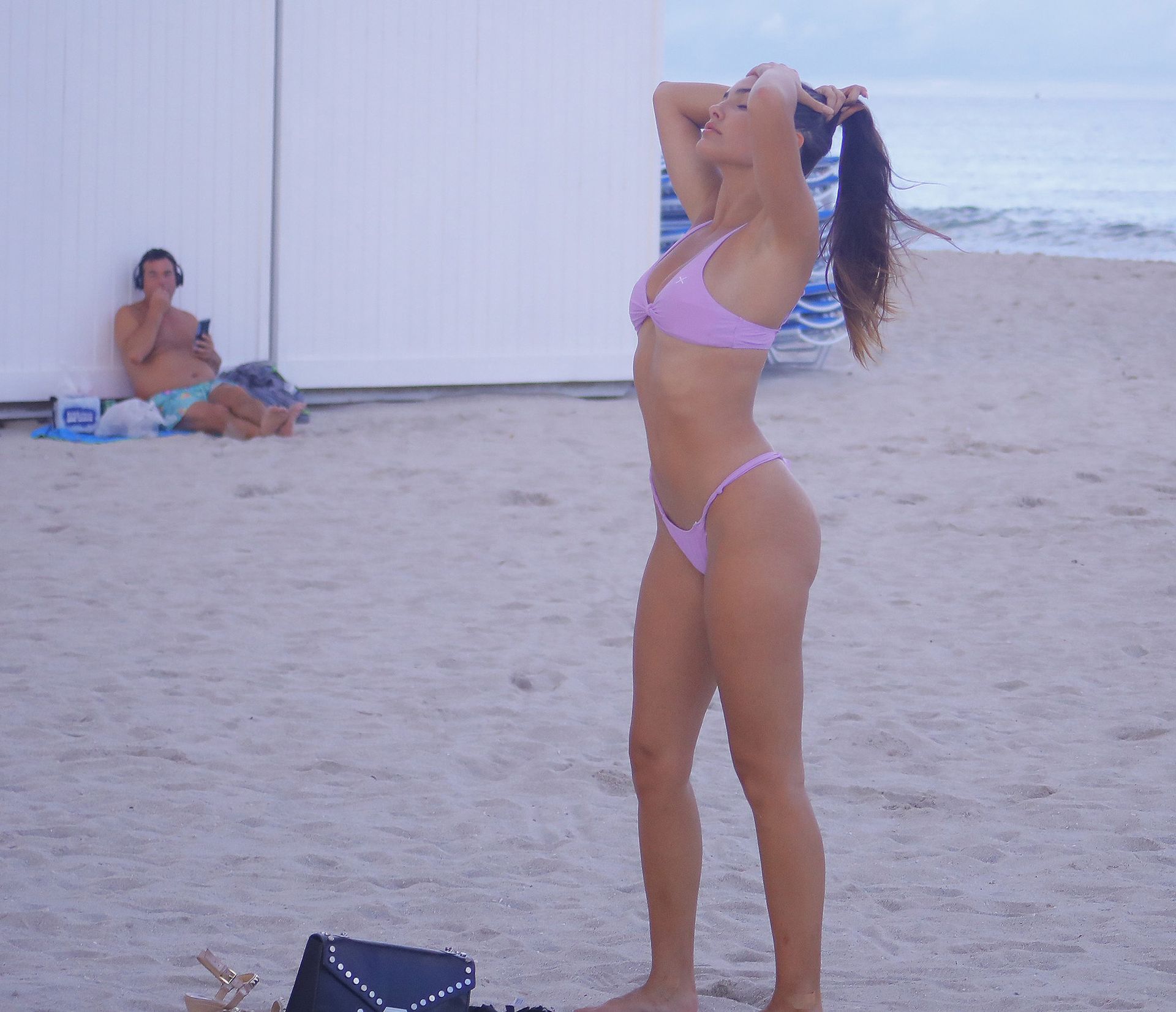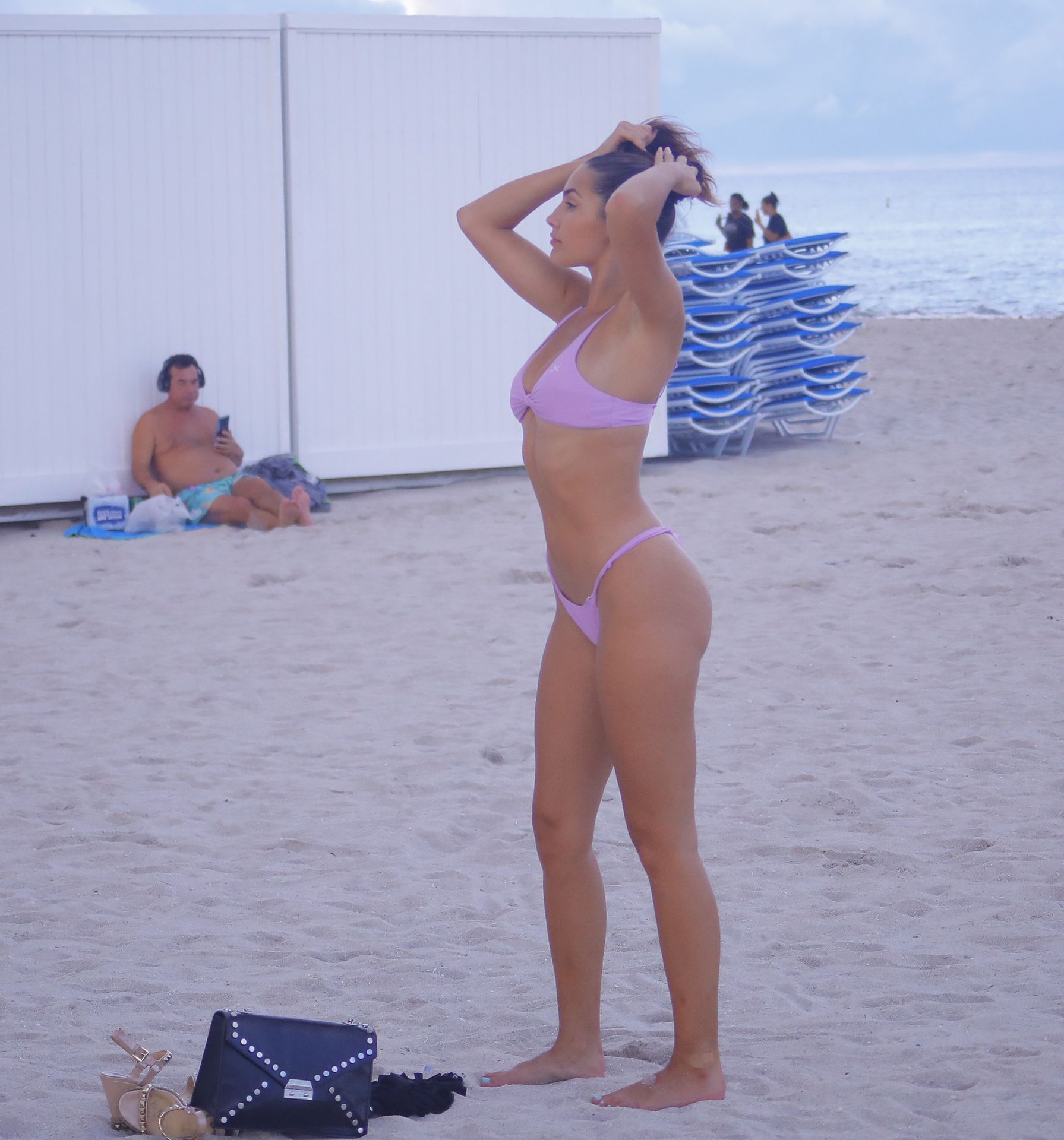 Tao Wickrath shows off her toned beach body as she stretches near a lifeguard stand just days before Tropical Storm Dorian hits South Beach, 08/28/2019.