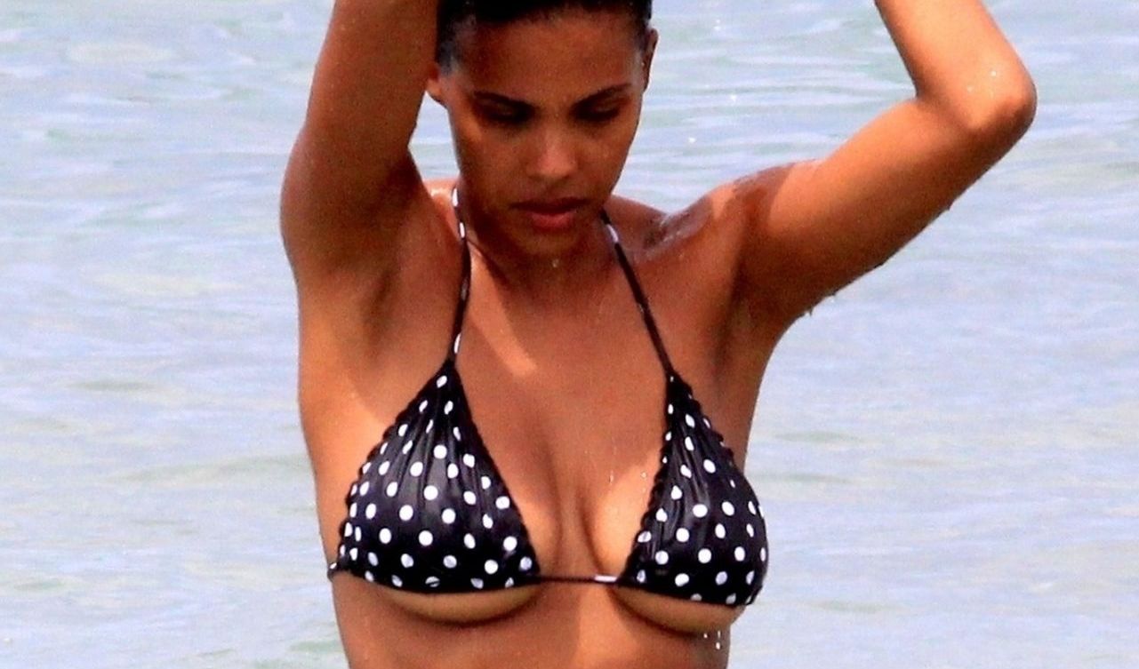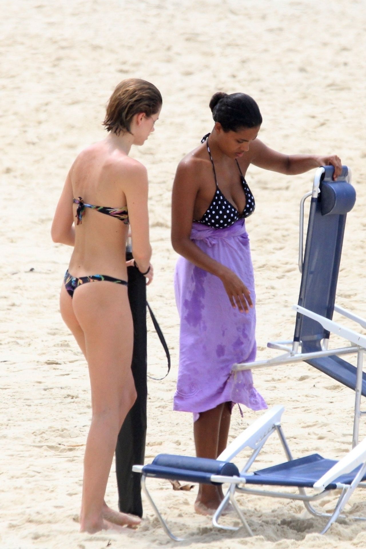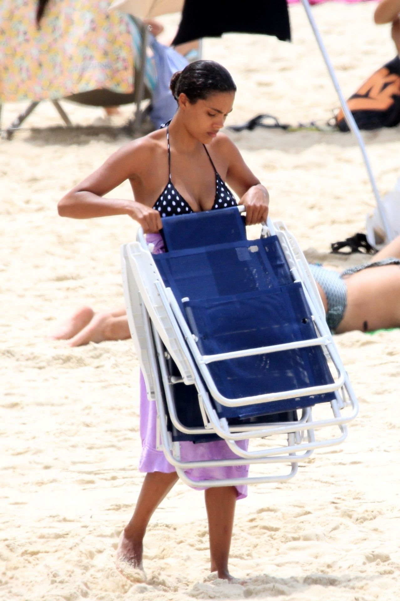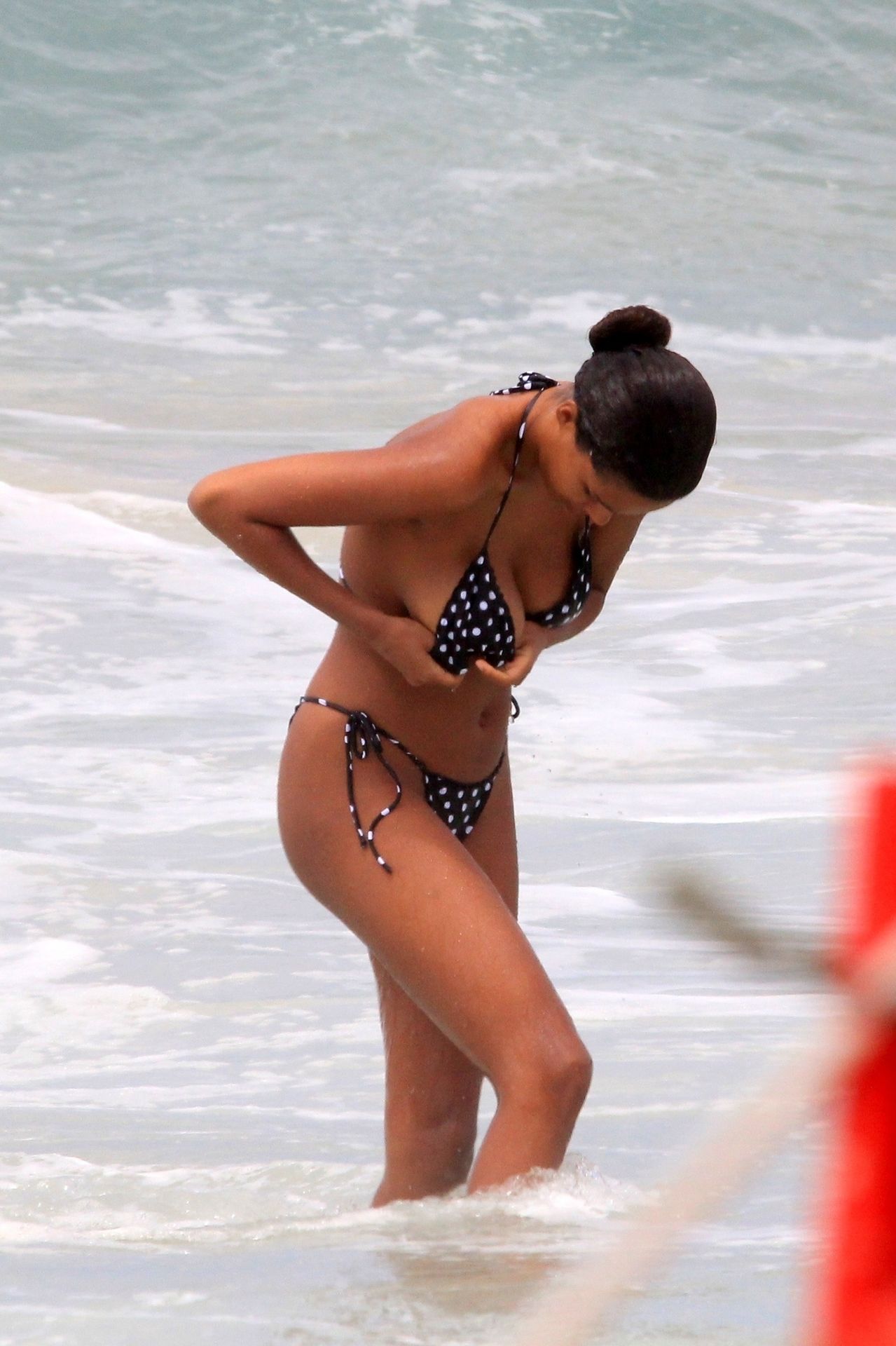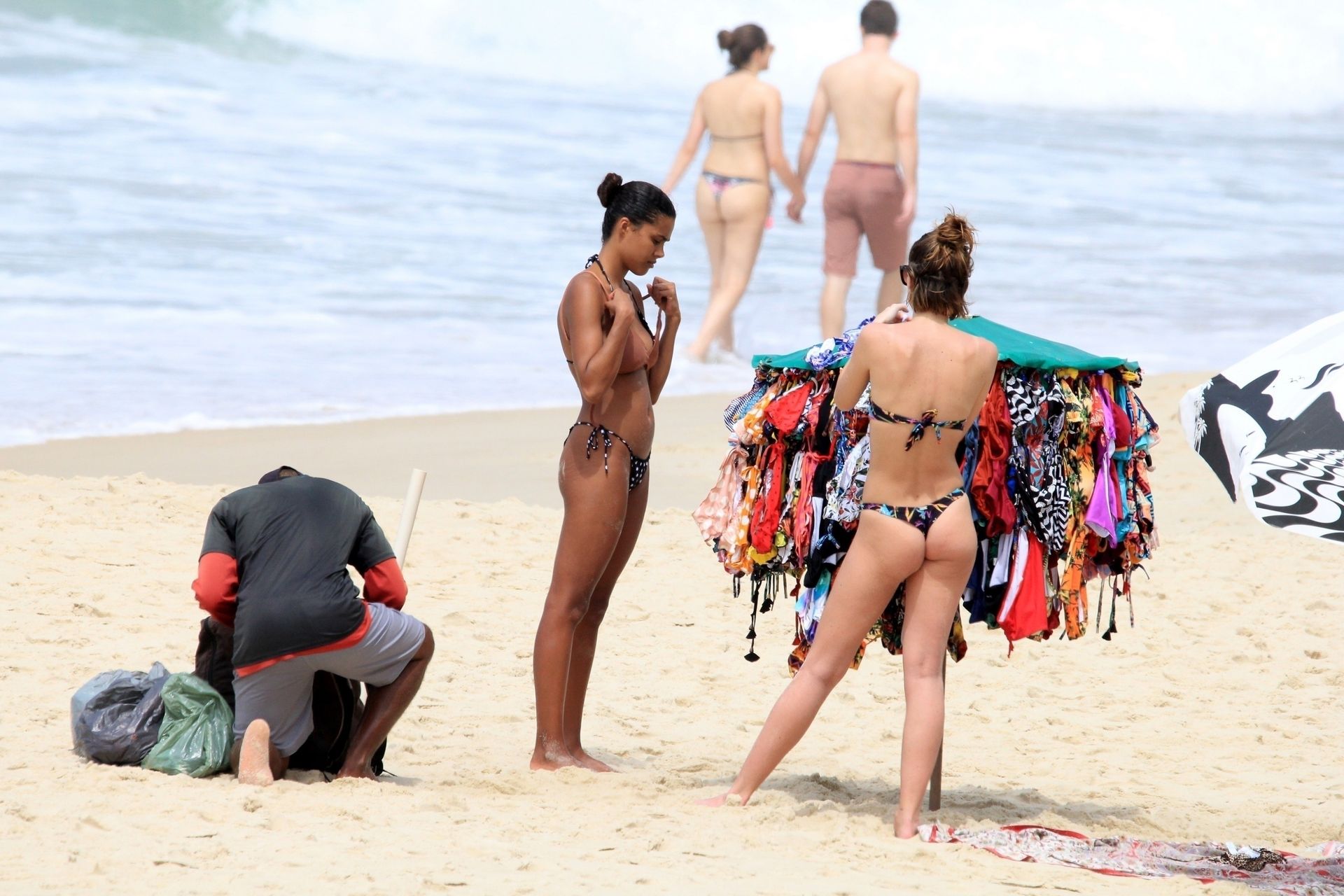 French actor Vincent Cassel’s busty wife Tina Kunakey nearly suffers a wardrobe malfunction while on the beaches of Rio de Janeiro, 01/29/2020. The model also shops for bikinis from a vendor on the beach.