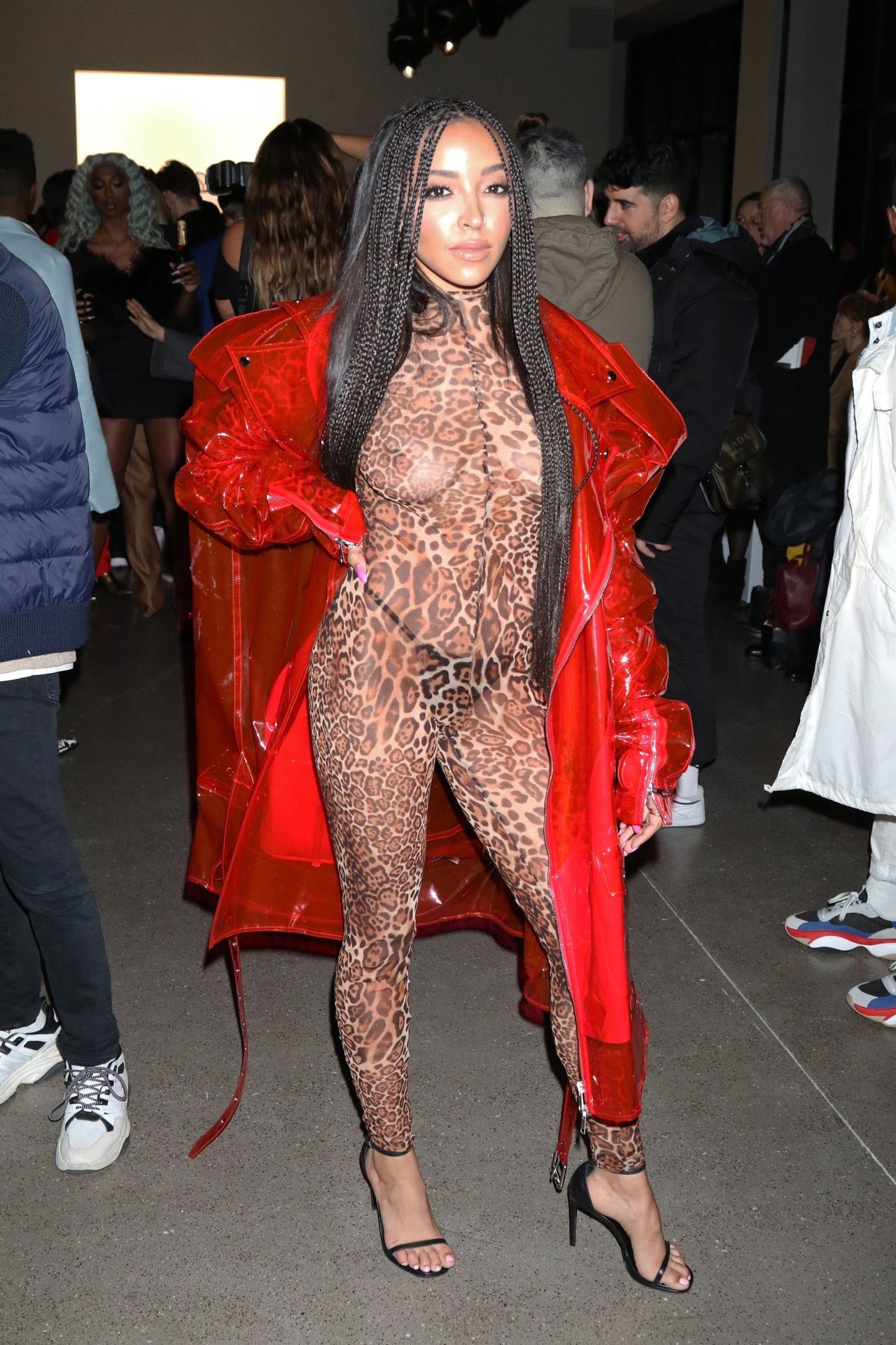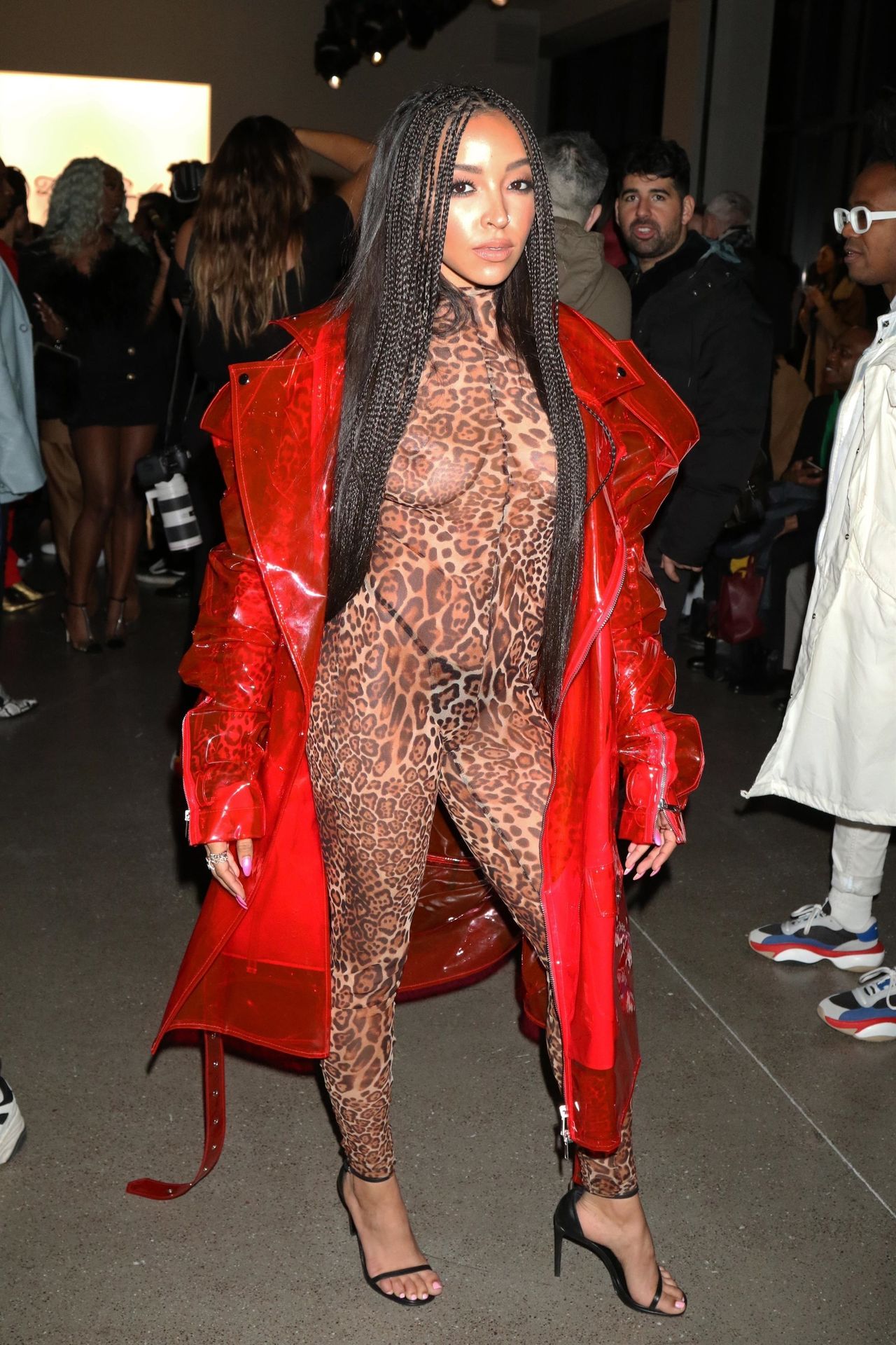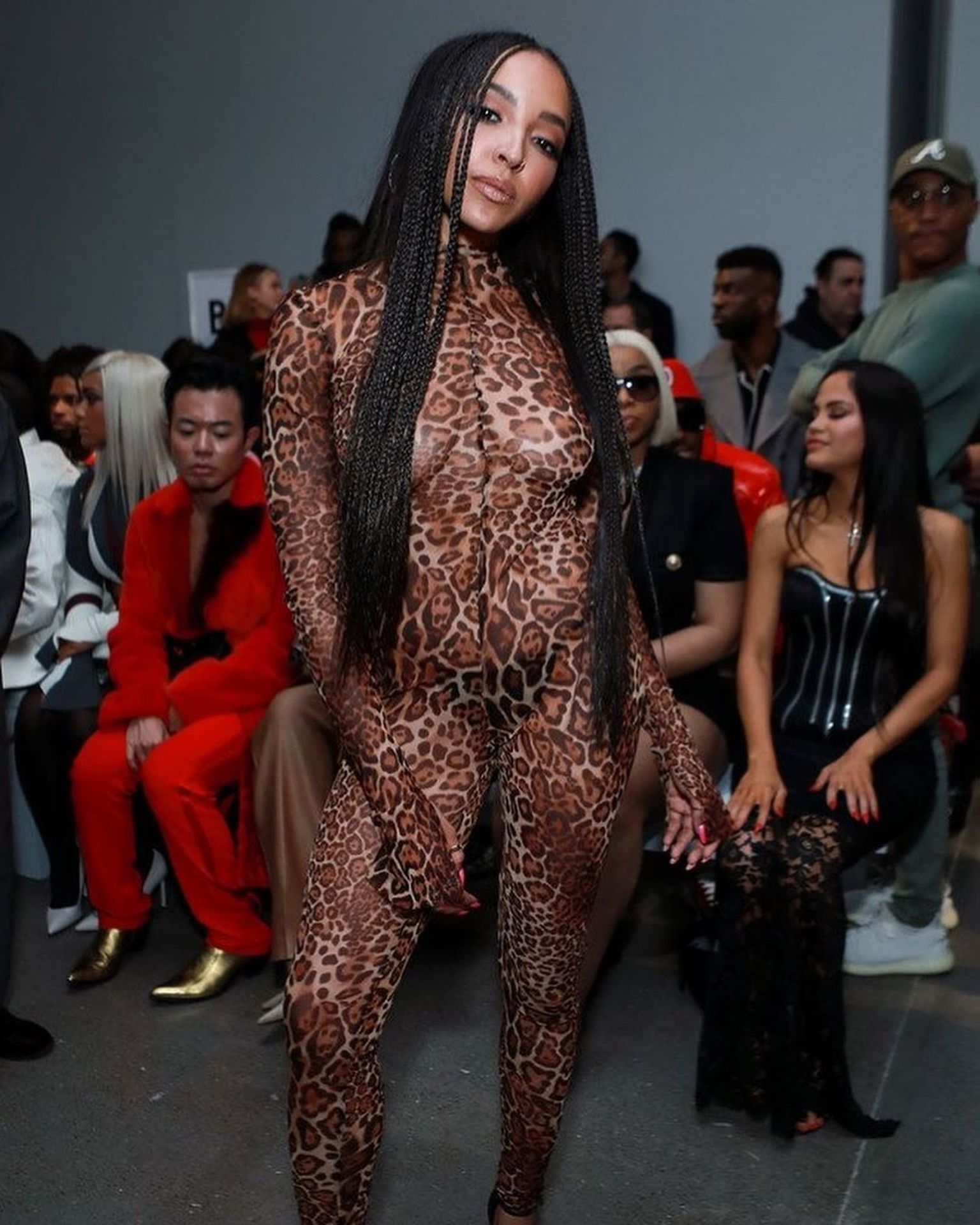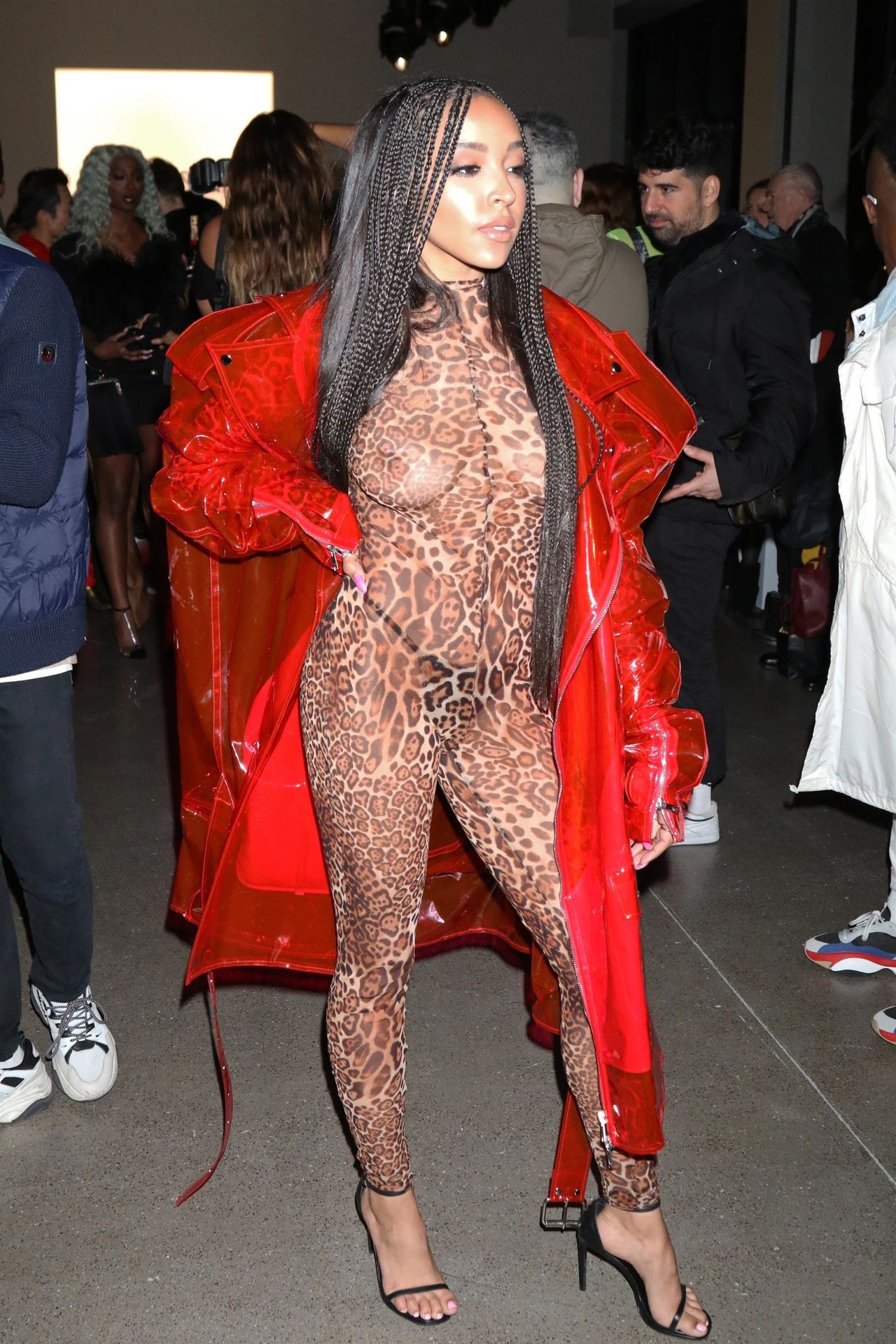 Tinashe was photographed in a leopard print see-through bodysuit while arriving at the LaQuan Smith Fashion Show during NYFW 2020 at Spring Studios in New York City, 02/08/2020.