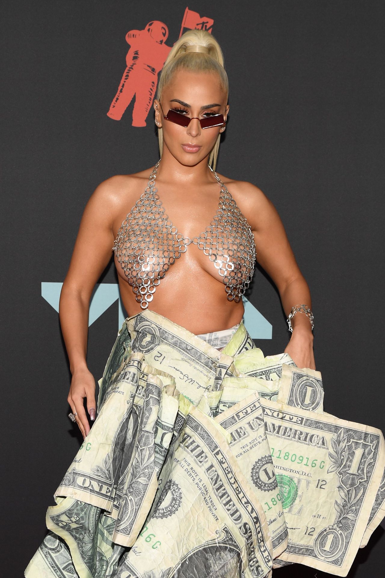 Latin American performer and singer Veronica Vega (28) showed off her tits at the 2019 MTV Video Music Awards in Newark, New Jersey, 08/26/2019. The blonde was photographed on the red carpet in a “dollar” skirt and chain mail see-through top.